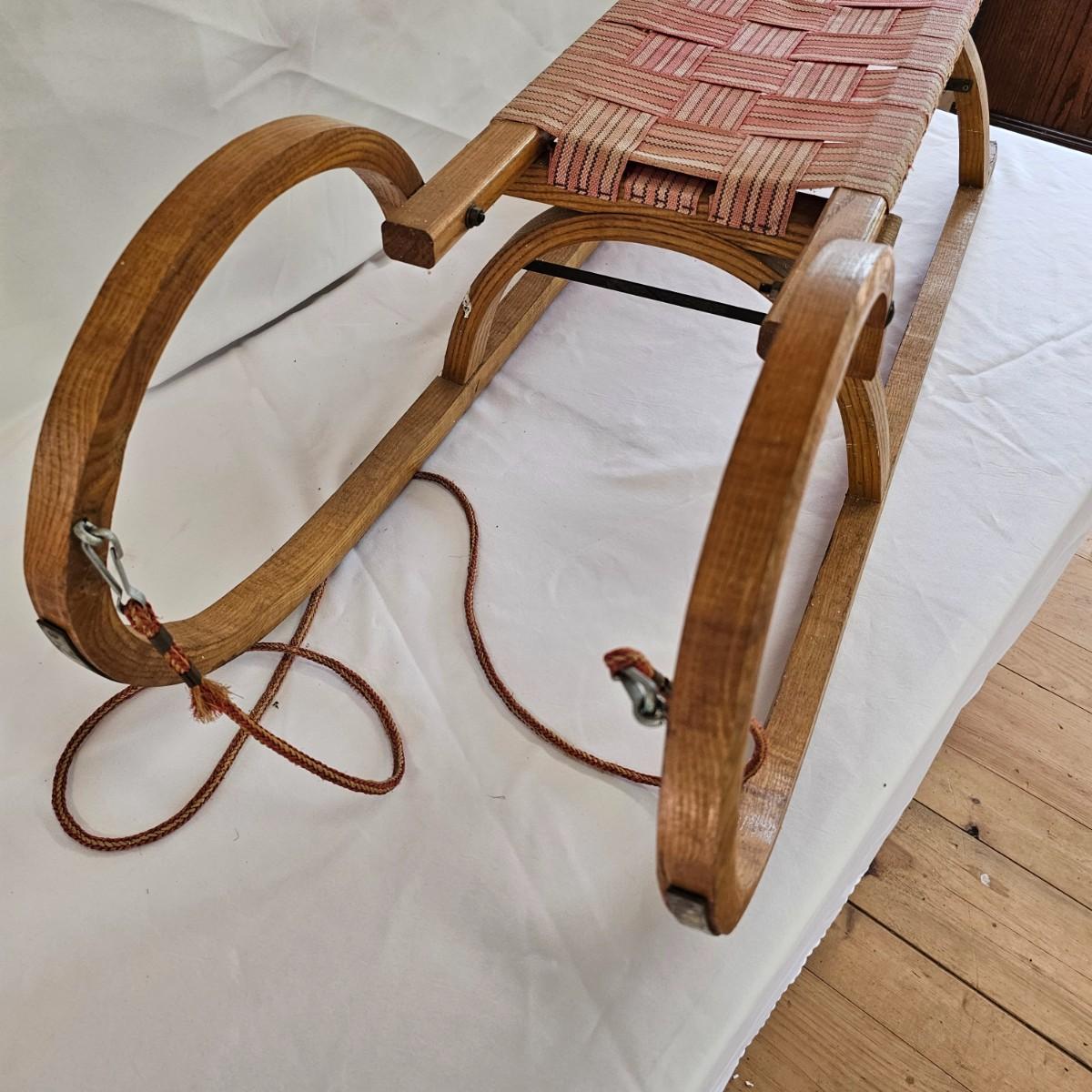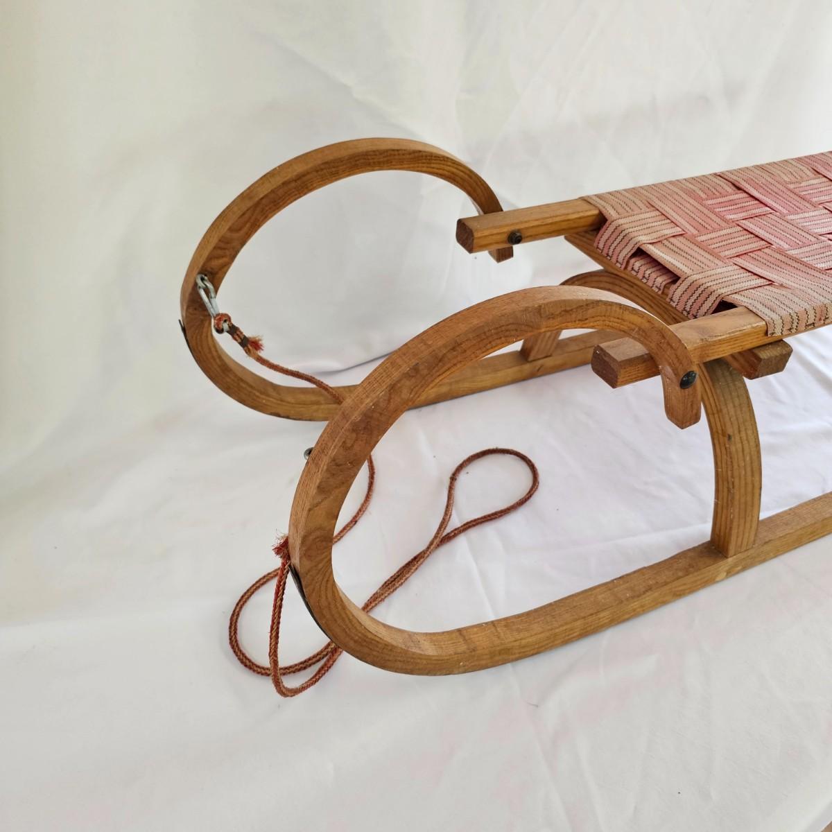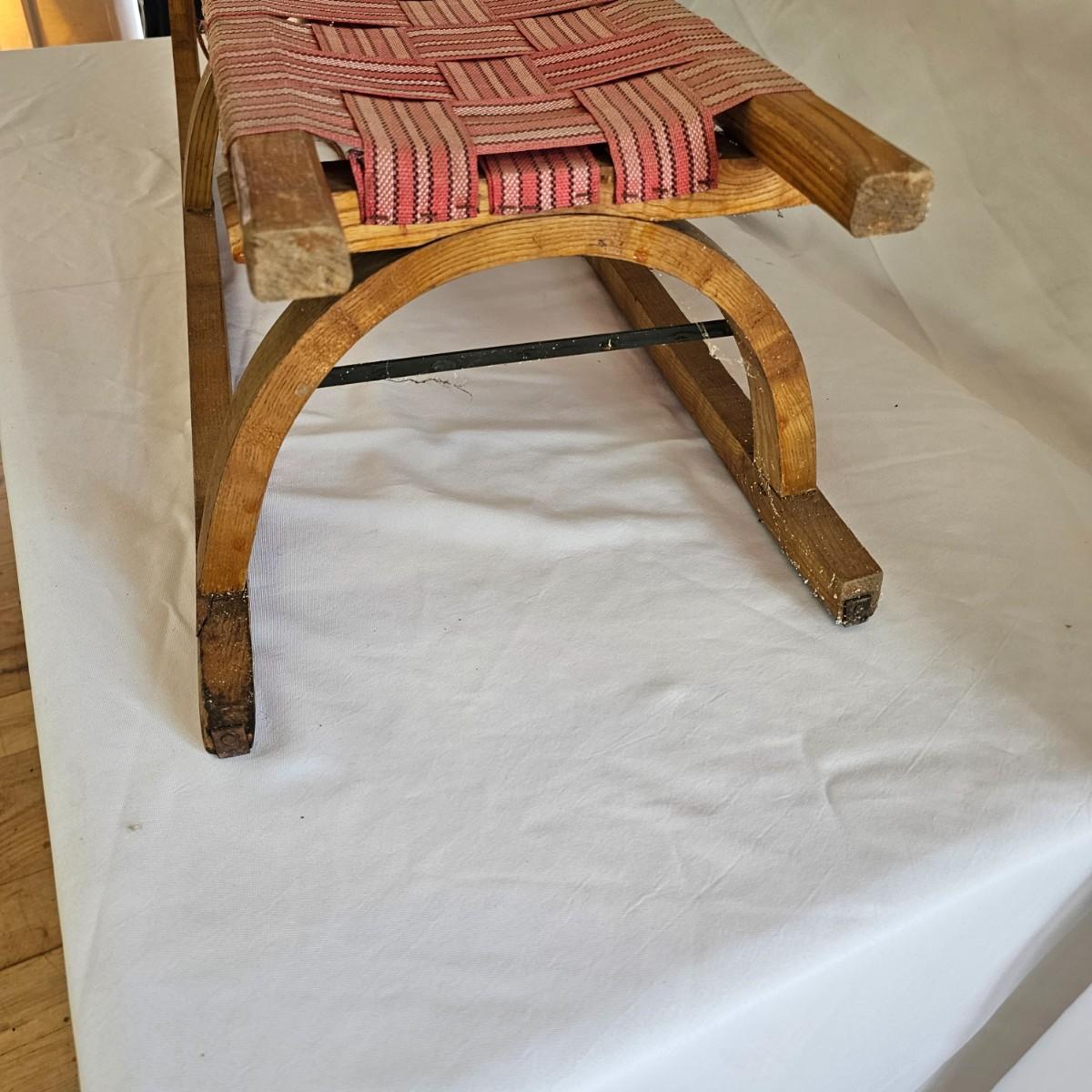 A beautiful solid wood sleigh with curved runners and a woven webbing seat. Webbing appears to be red, pink, and black in color. Wood appears to be oak. Has pull rope and steel runner strips on bottom. Sleigh measures 41" x 15" x 14"H. Slight discoloring and one small crack in runner, see photos for details. Local pickup only.