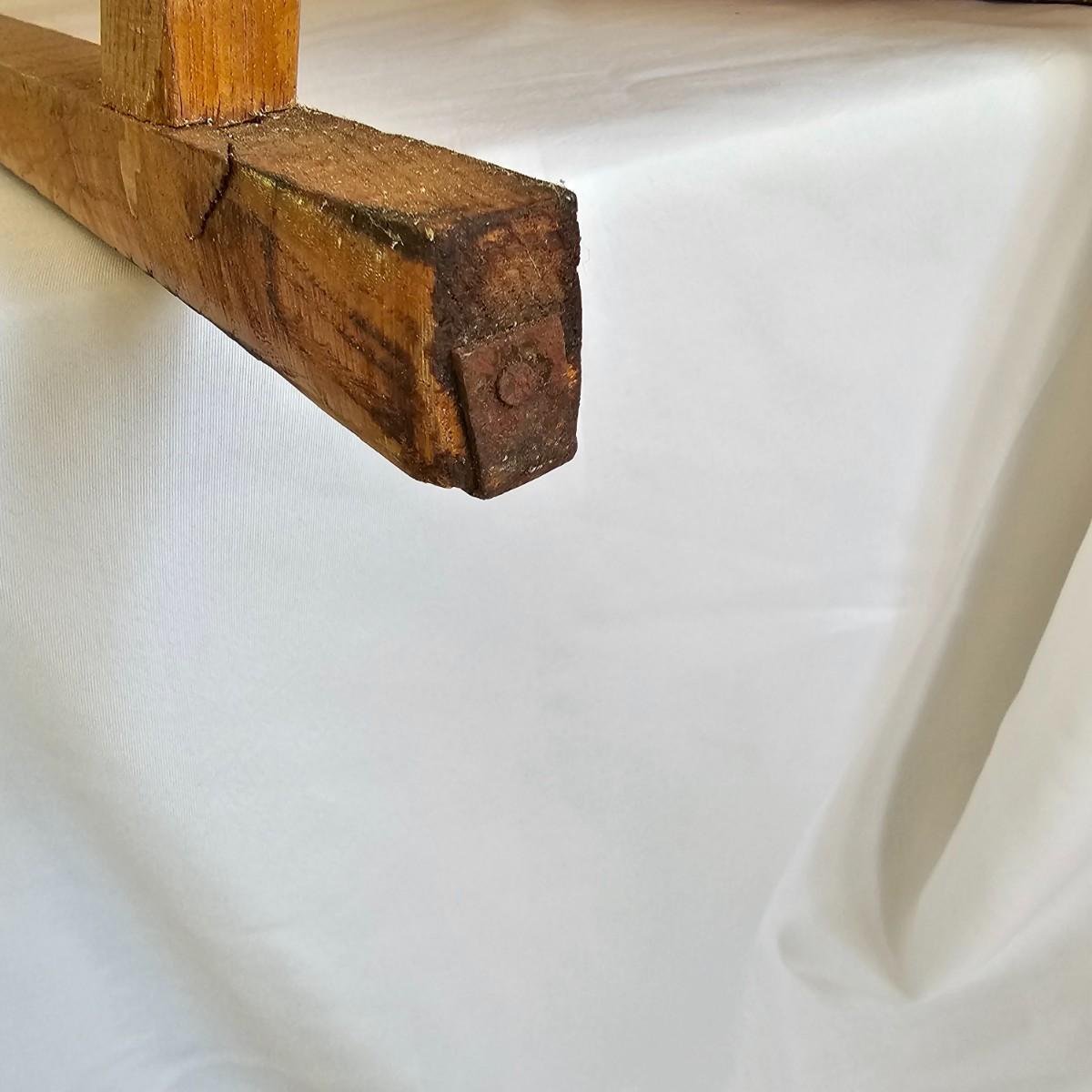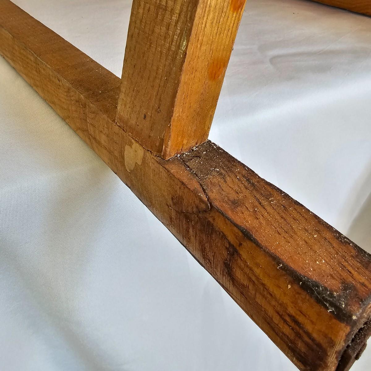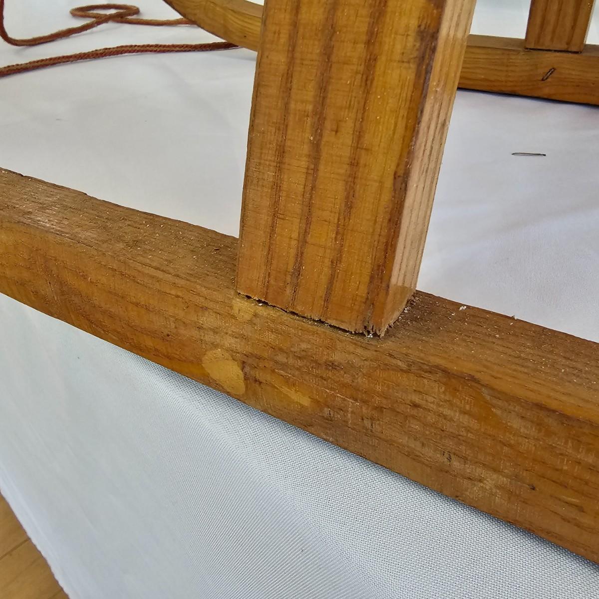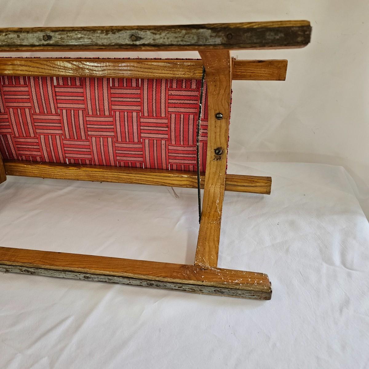 A beautiful solid wood sleigh with curved runners and a woven webbing seat. Webbing appears to be red, pink, and black in color. Wood appears to be oak. Has pull rope and steel runner strips on bottom. Sleigh measures 41" x 15" x 14"H. Slight discoloring and one small crack in runner, see photos for details. Local pickup only.