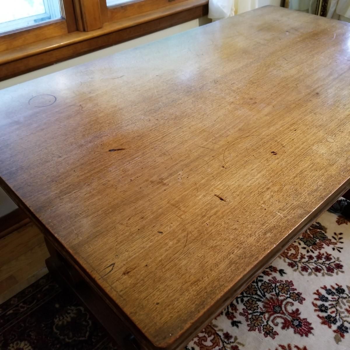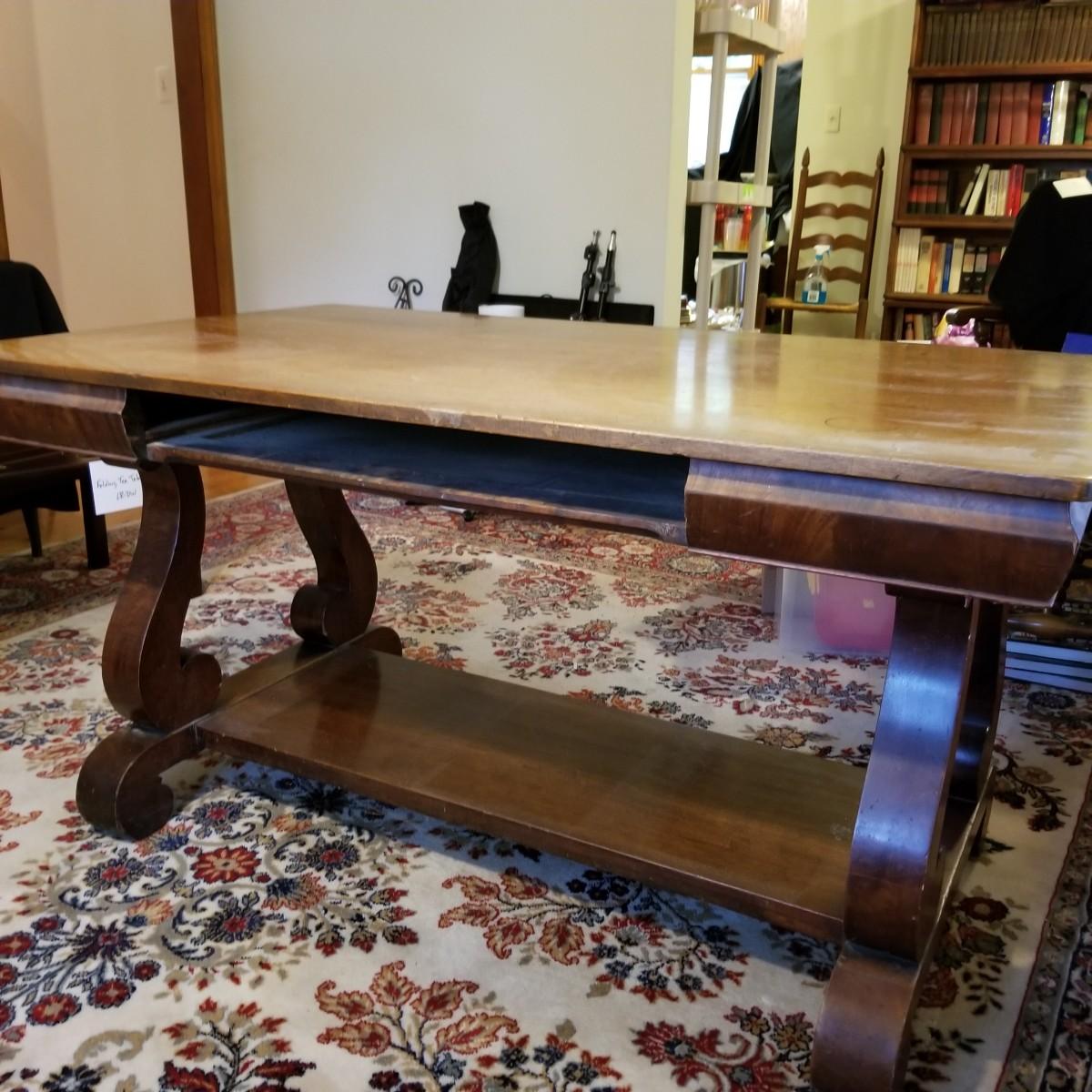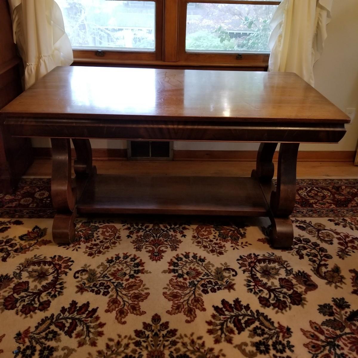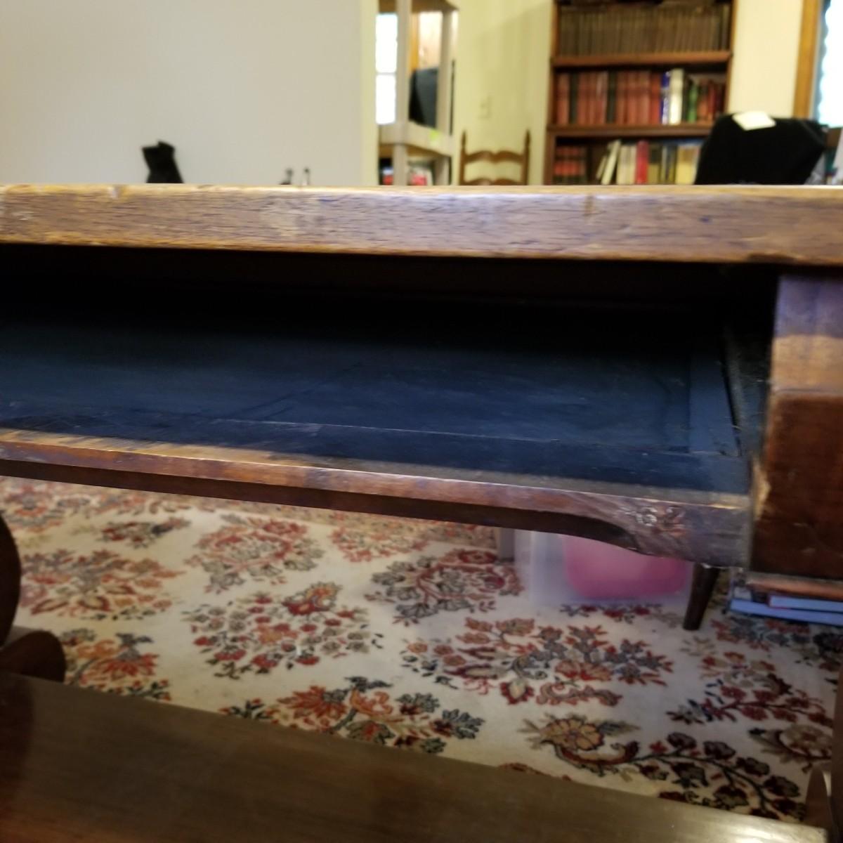 A decorative oak table with lower shelf. Table measures 54"x32"x28", shelf is 40"x15". Some slight imperfections on table top, and is missing the original drawer. See photos for details. Local pickup only.