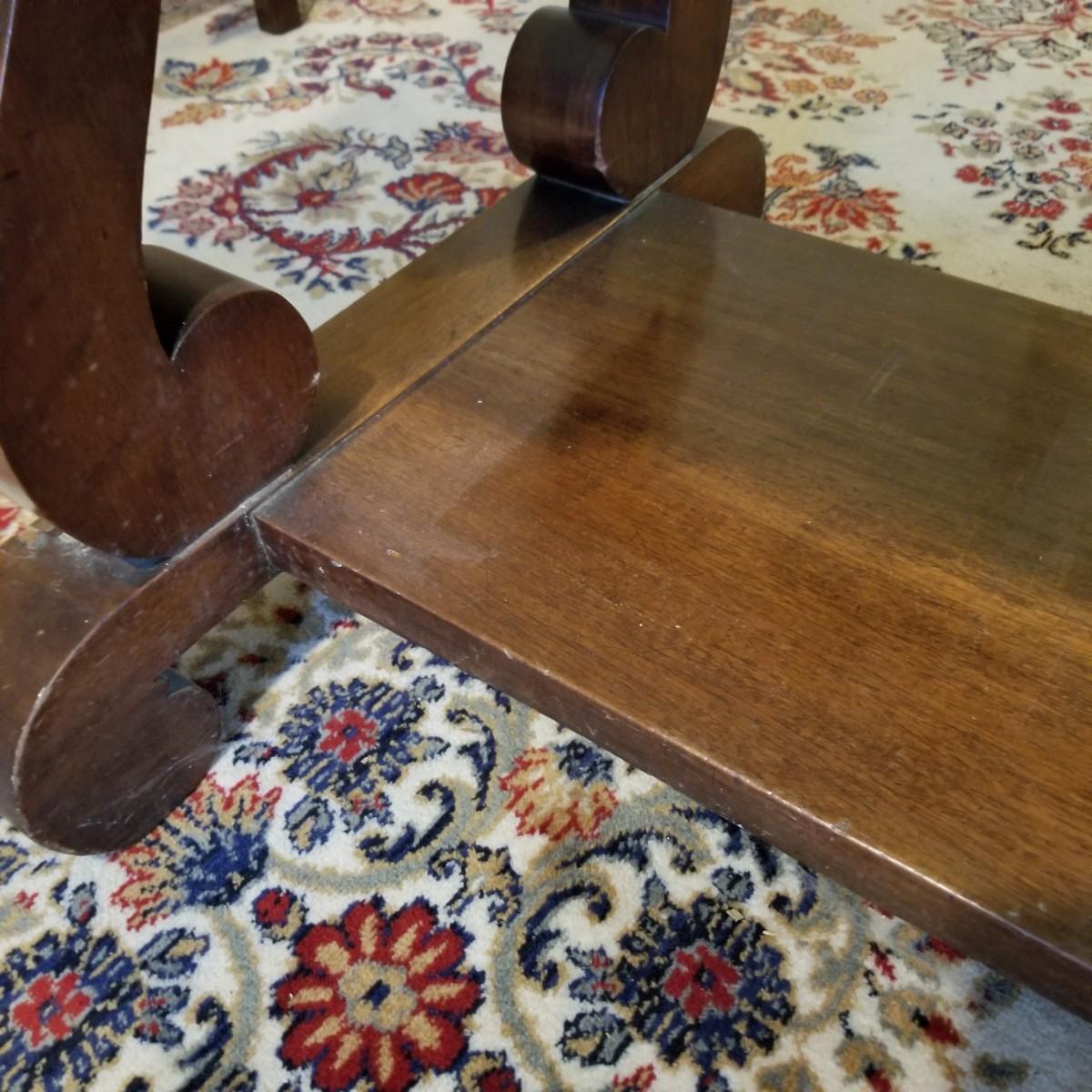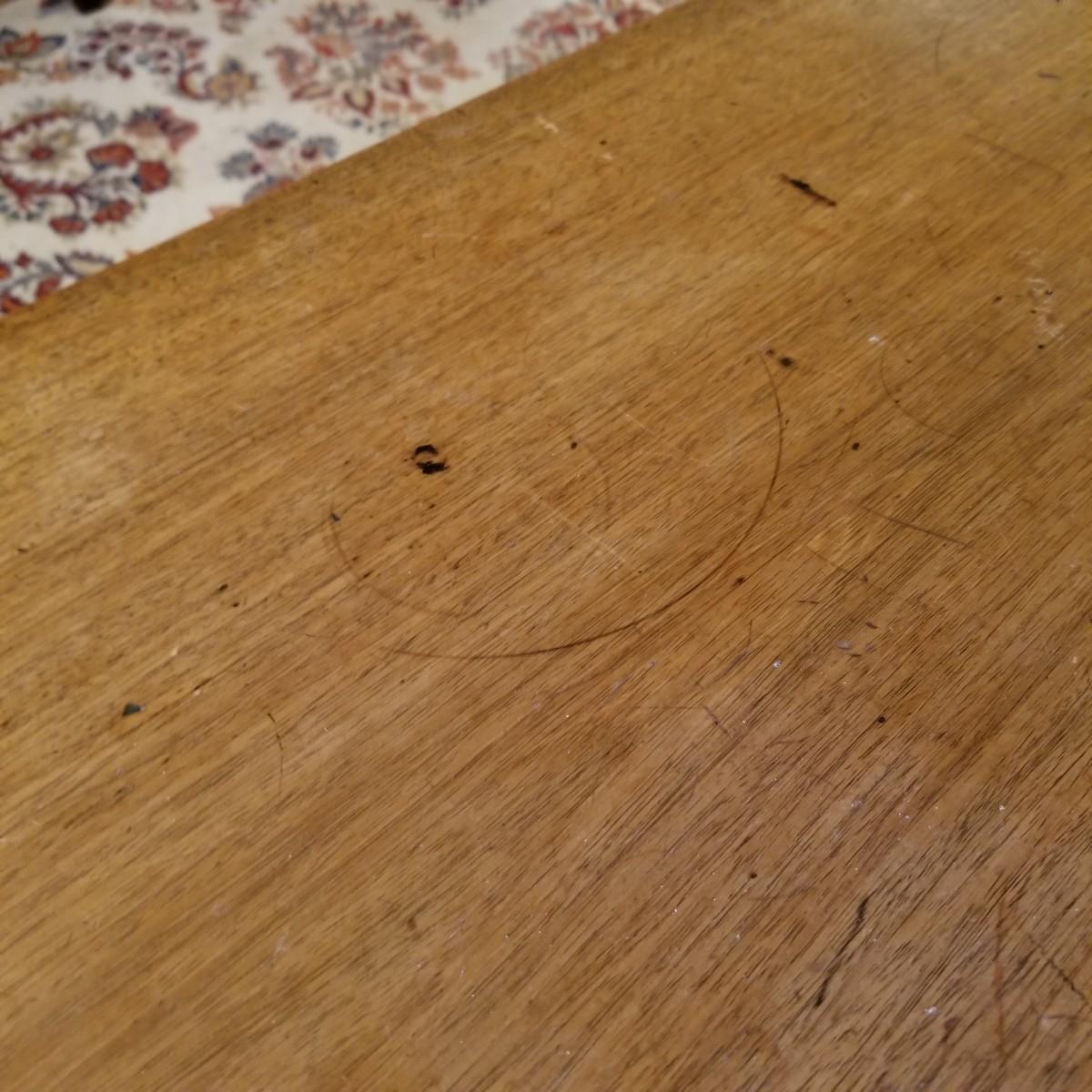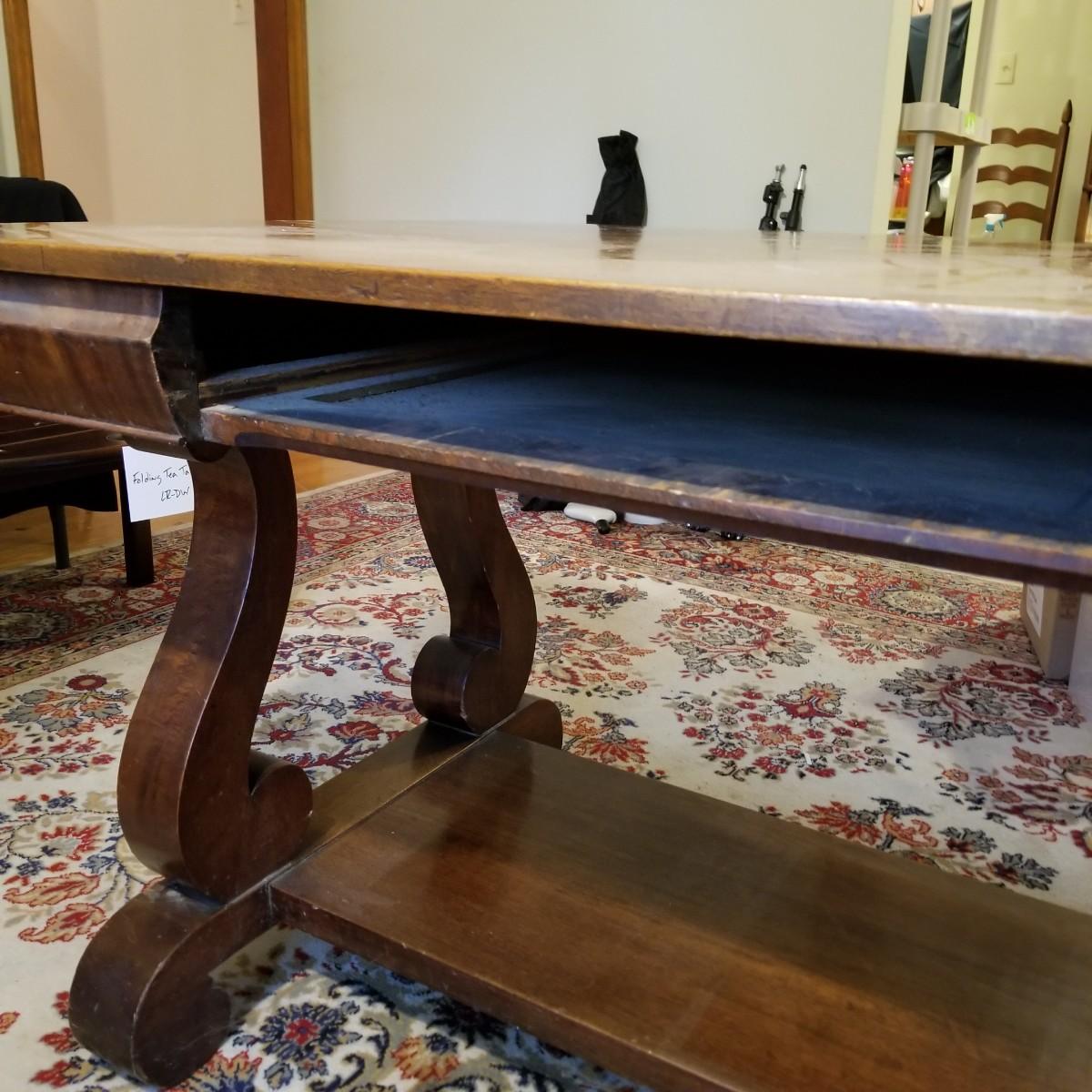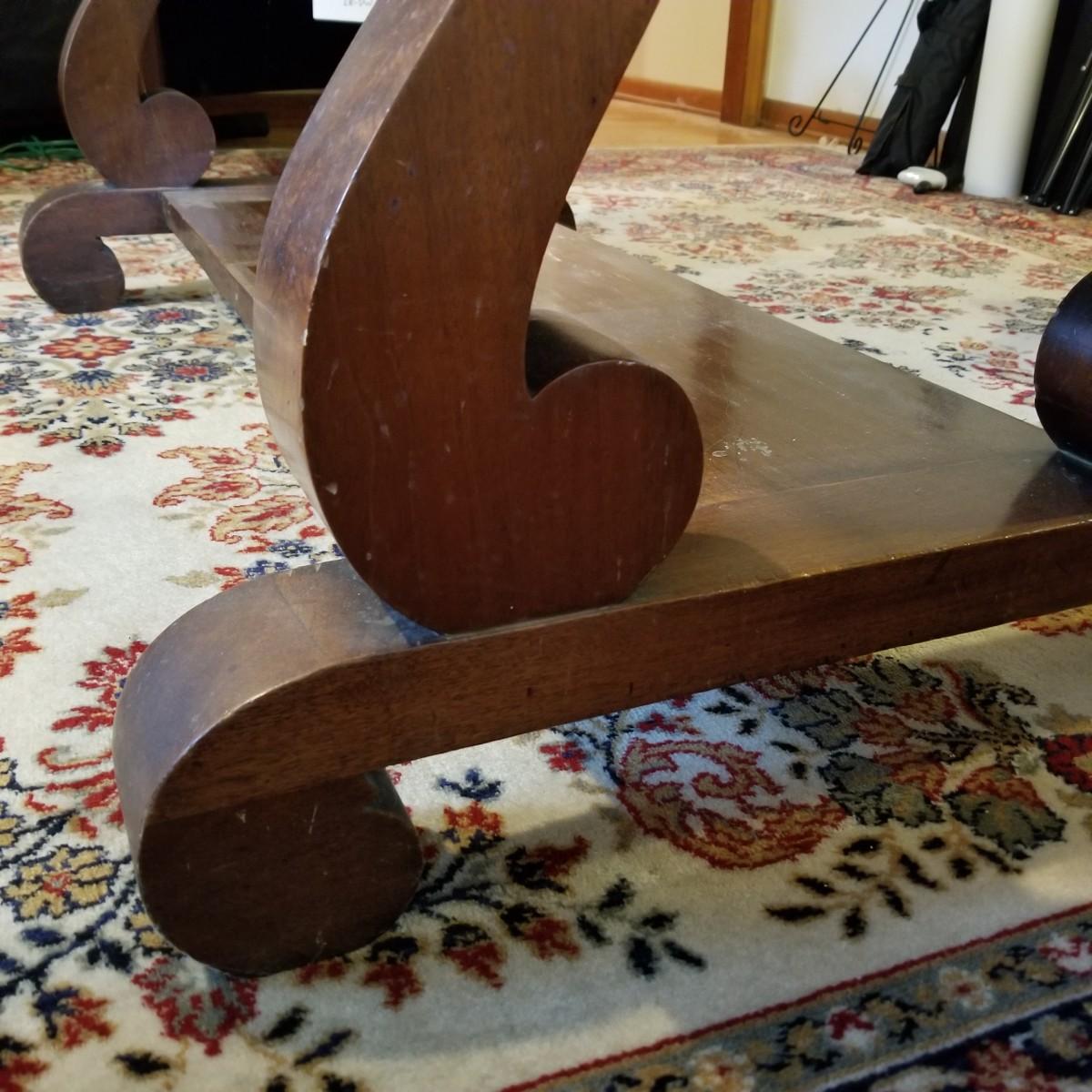 A decorative oak table with lower shelf. Table measures 54"x32"x28", shelf is 40"x15". Some slight imperfections on table top, and is missing the original drawer. See photos for details. Local pickup only.