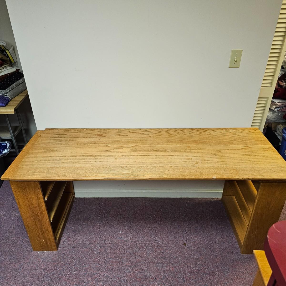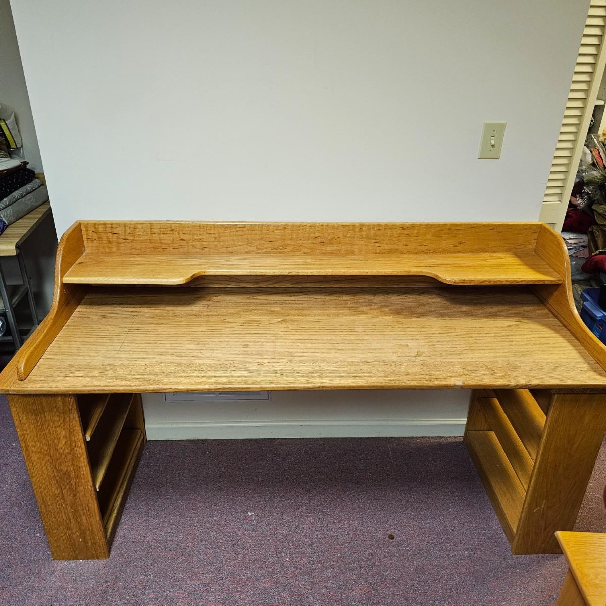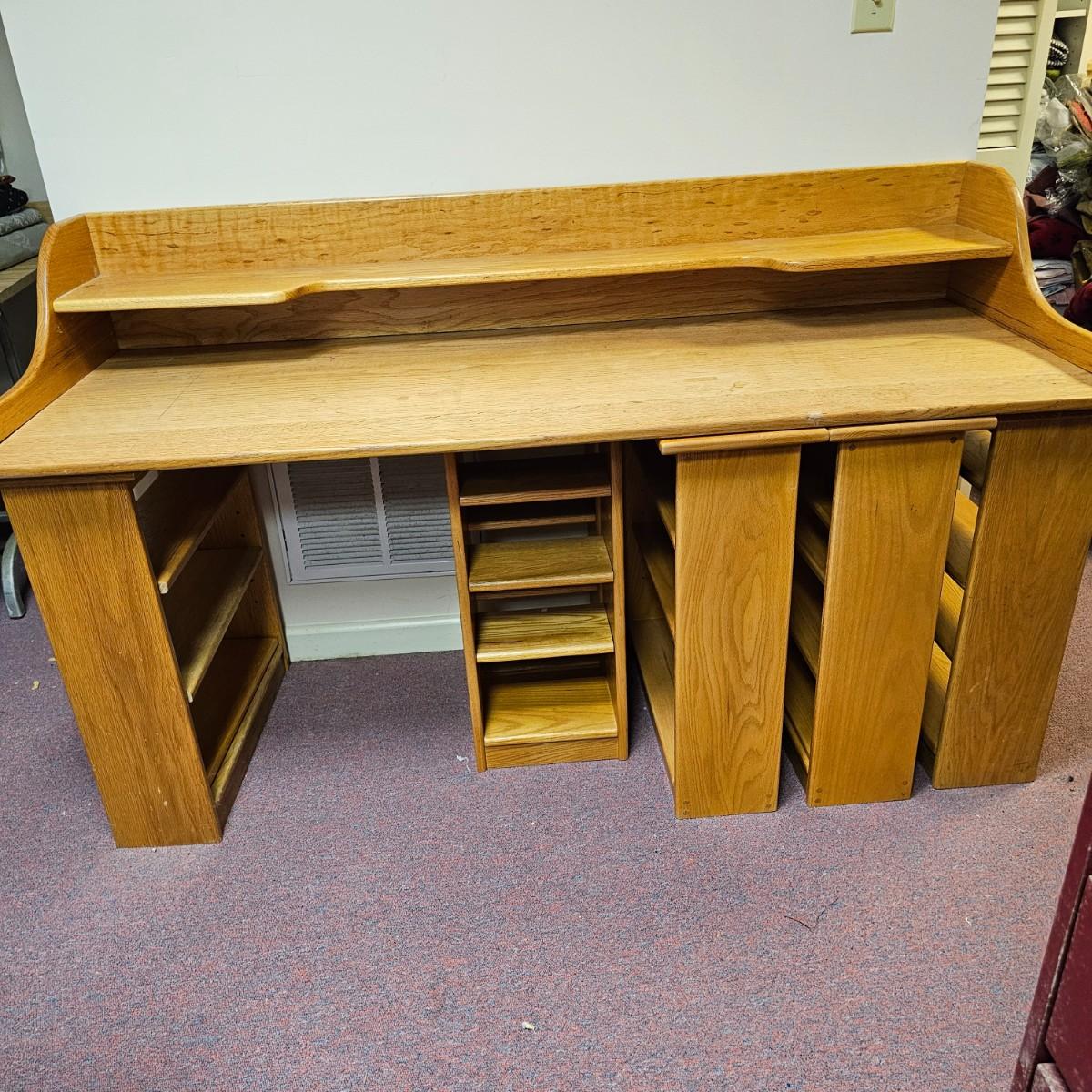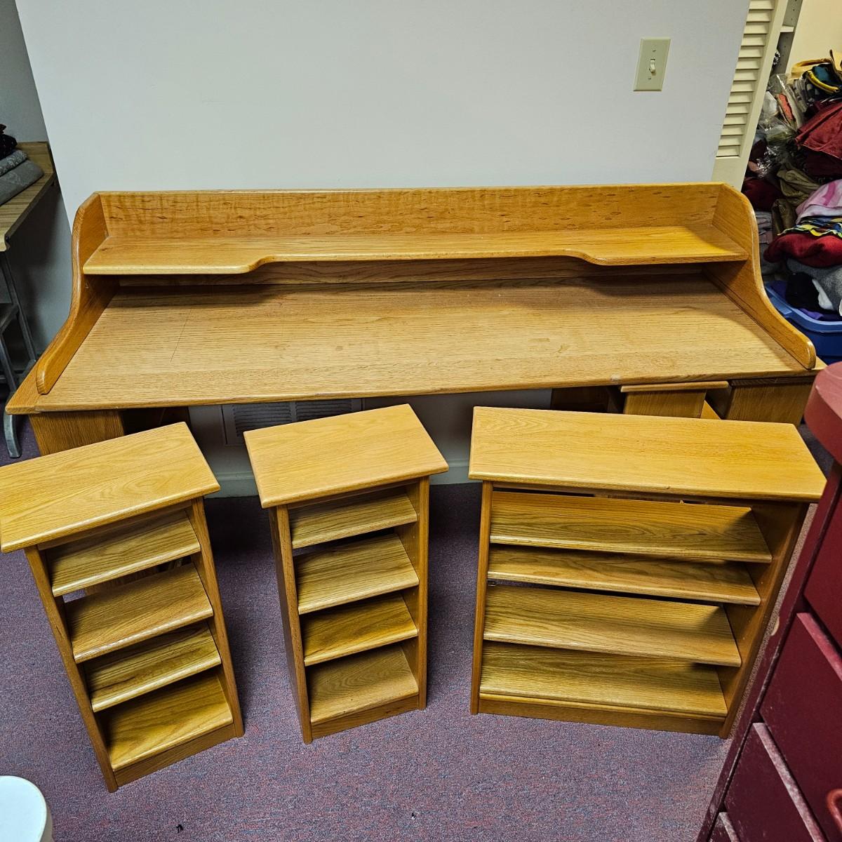 Solid oak desk top with short credenza piece. Desk portion measures 63.5" x 24" x 1" thick. Credenza unit is 62" x 23" x 9.5"H. Both pieces sit on wider shelving units which are 24" x 9" x 27"H, four pieces the same. Smaller pair of shelves are 13" x 9" x 27"H. All units have adjustable shelving pieces. Desk top has some minor blemishes. See photos for details. Local pickup only. This item is located in the basement with a flight of stairs or alternatively a garden path with approximately 15 steps that can be used to go around the side of the house.
