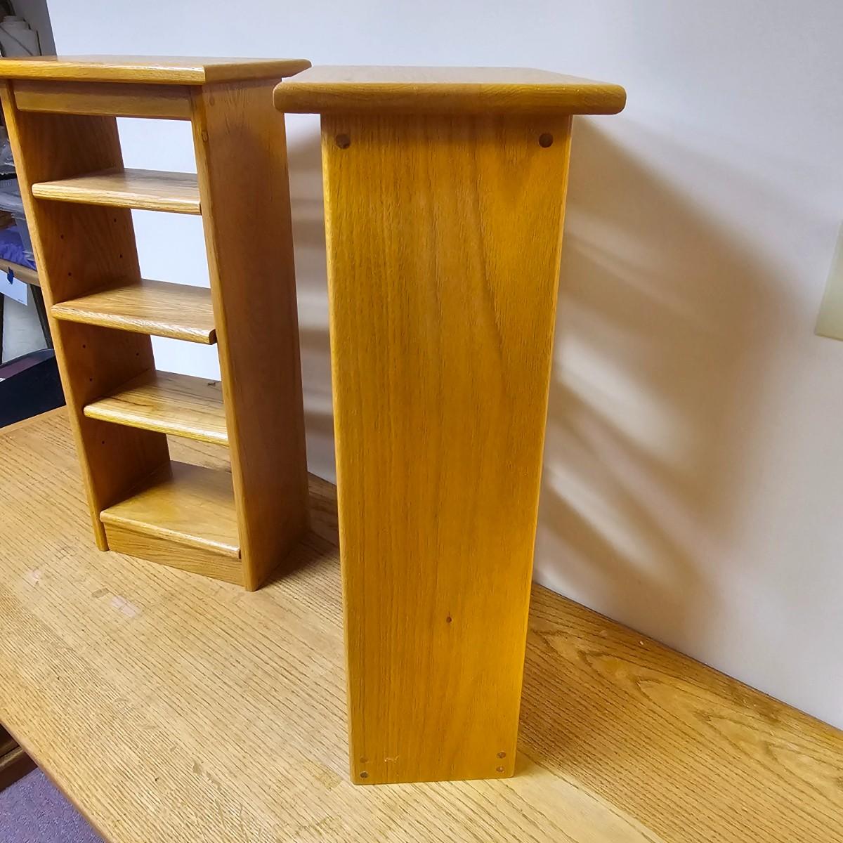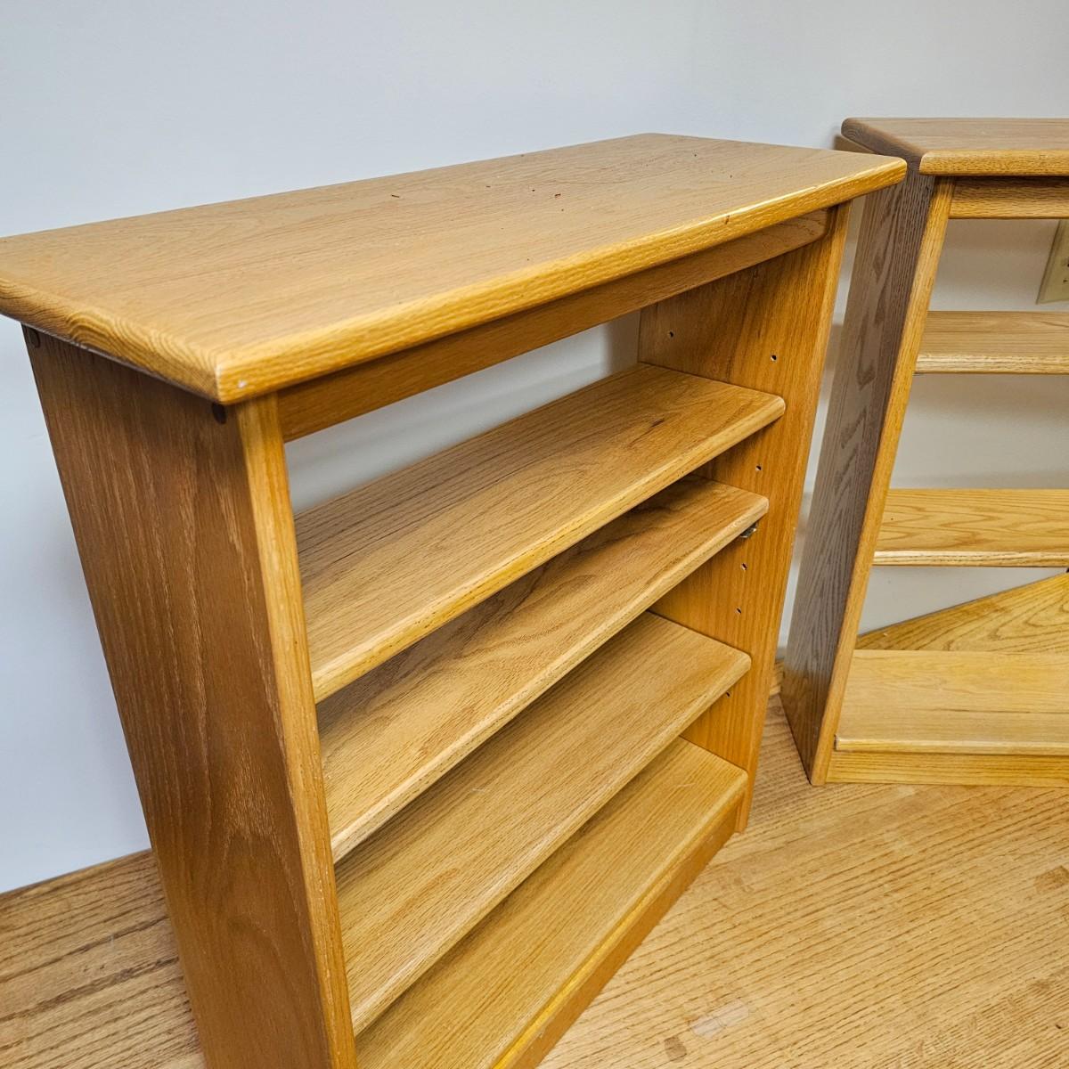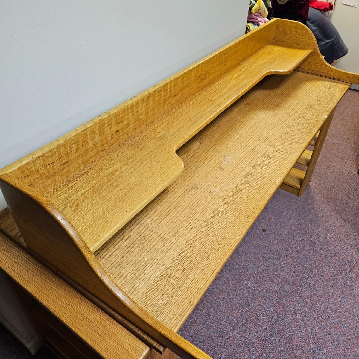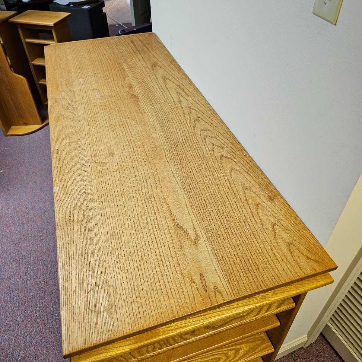 Solid oak desk top with short credenza piece. Desk portion measures 63.5" x 24" x 1" thick. Credenza unit is 62" x 23" x 9.5"H. Both pieces sit on wider shelving units which are 24" x 9" x 27"H, four pieces the same. Smaller pair of shelves are 13" x 9" x 27"H. All units have adjustable shelving pieces. Desk top has some minor blemishes. See photos for details. Local pickup only. This item is located in the basement with a flight of stairs or alternatively a garden path with approximately 15 steps that can be used to go around the side of the house.