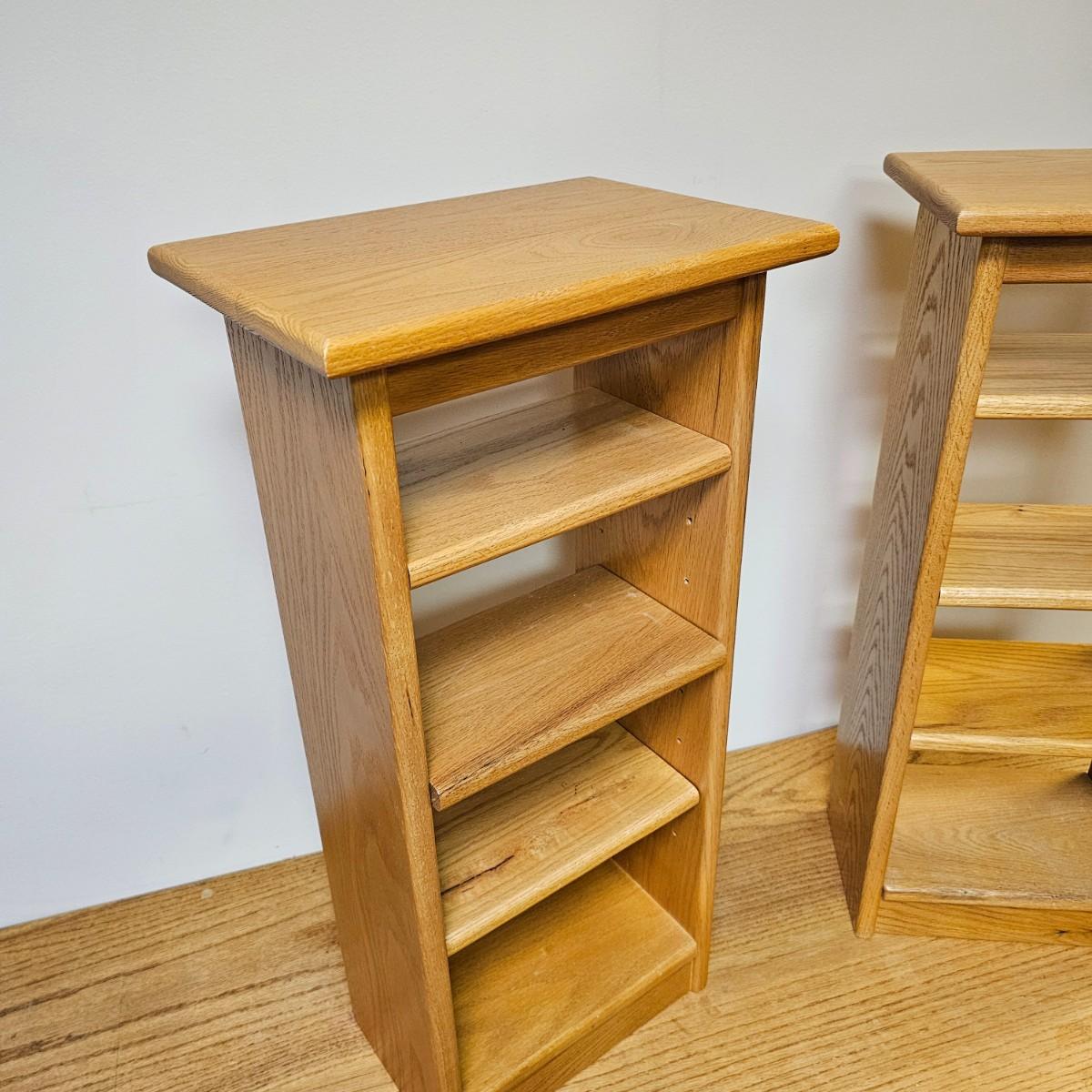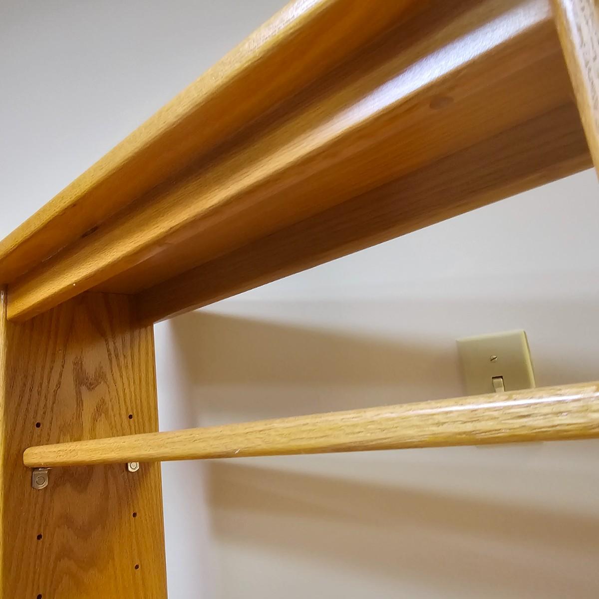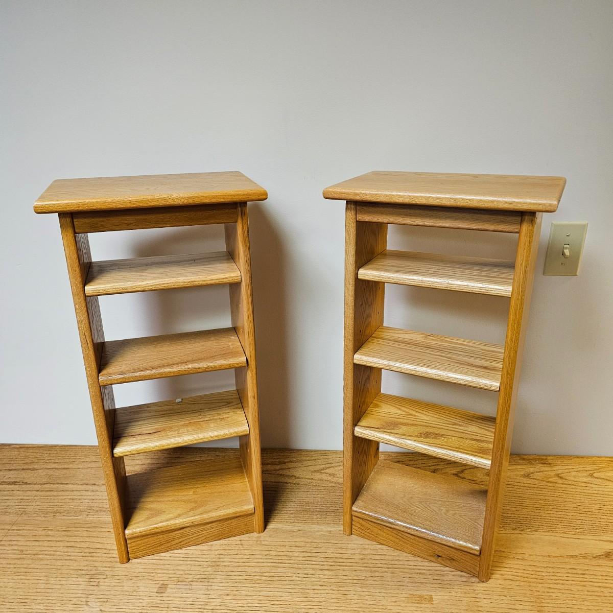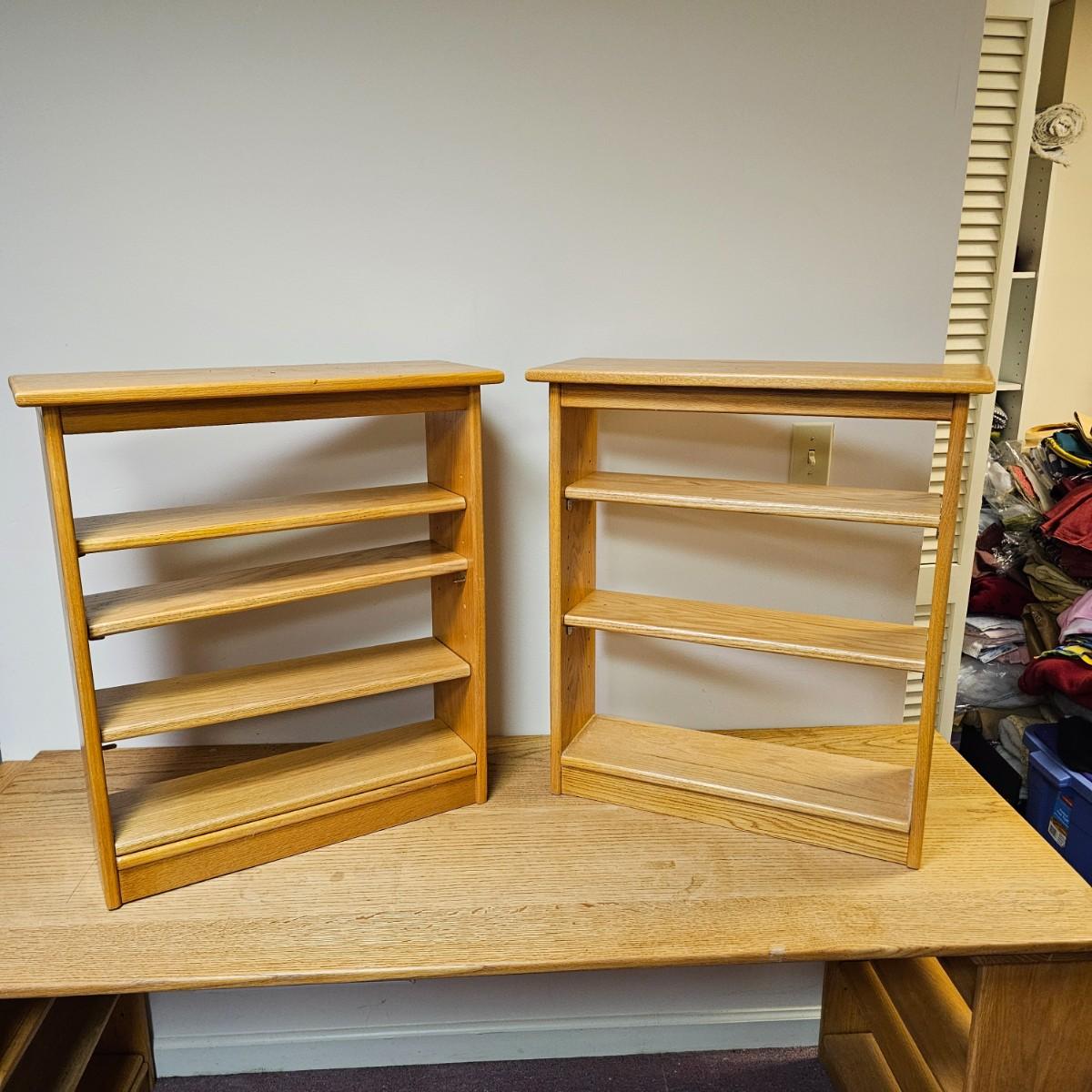 Solid oak desk top with short credenza piece. Desk portion measures 63.5" x 24" x 1" thick. Credenza unit is 62" x 23" x 9.5"H. Both pieces sit on wider shelving units which are 24" x 9" x 27"H, four pieces the same. Smaller pair of shelves are 13" x 9" x 27"H. All units have adjustable shelving pieces. Desk top has some minor blemishes. See photos for details. Local pickup only. This item is located in the basement with a flight of stairs or alternatively a garden path with approximately 15 steps that can be used to go around the side of the house.