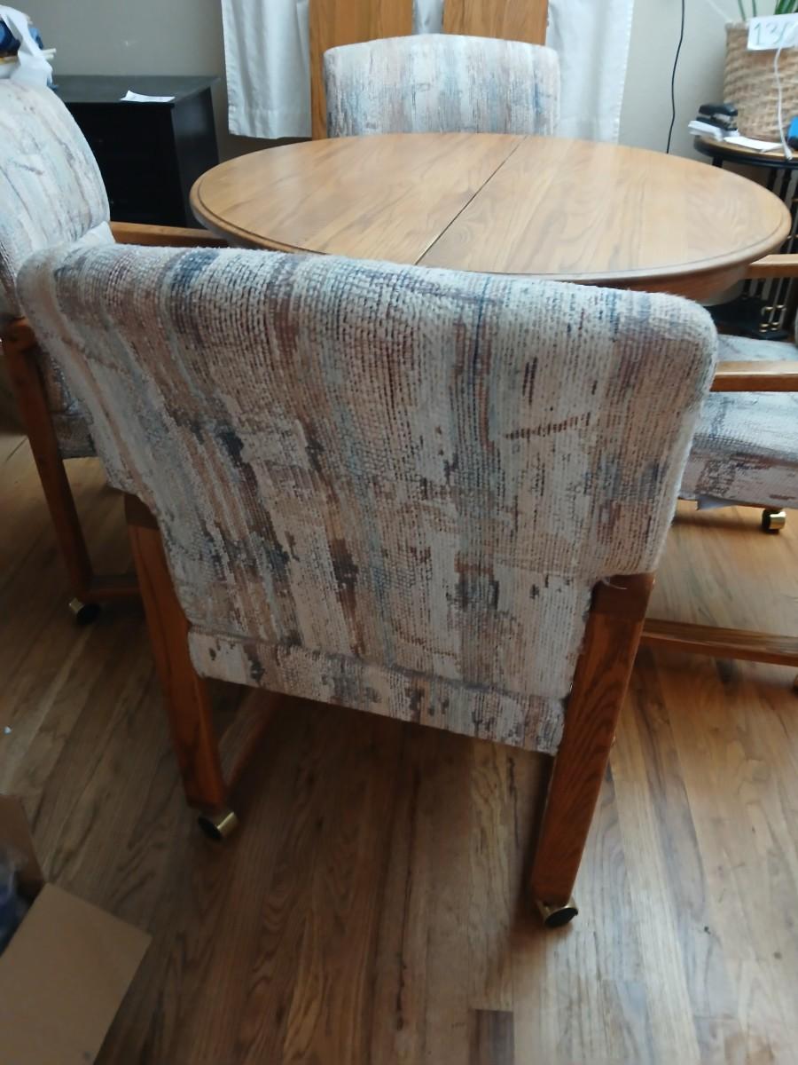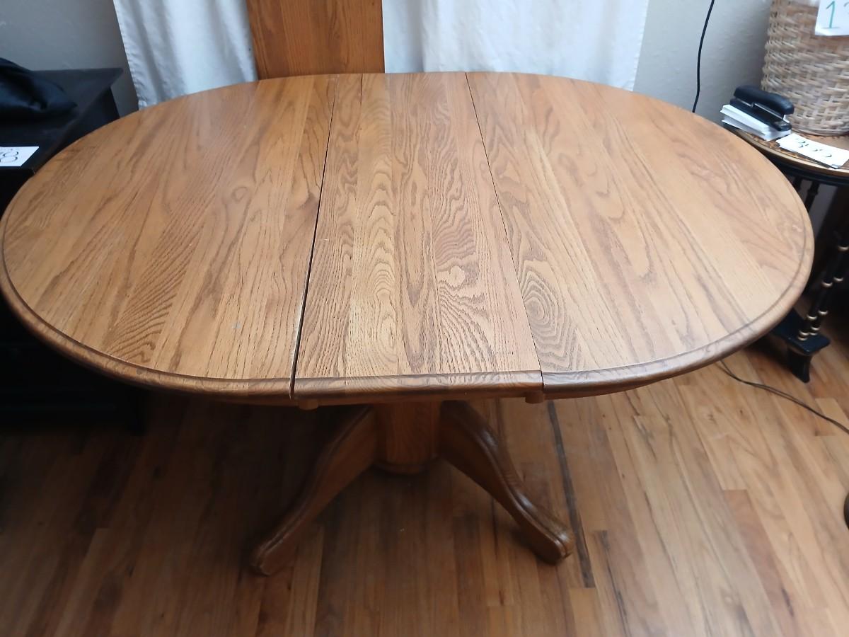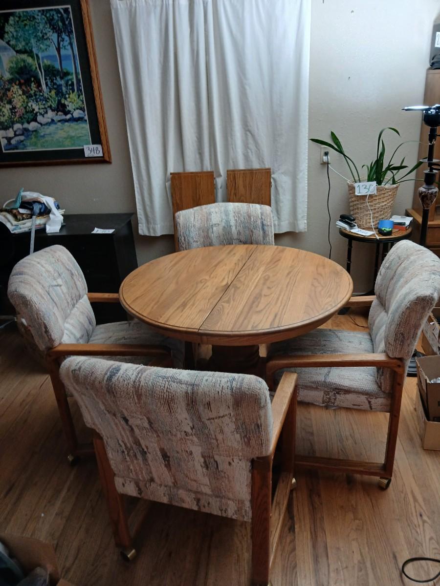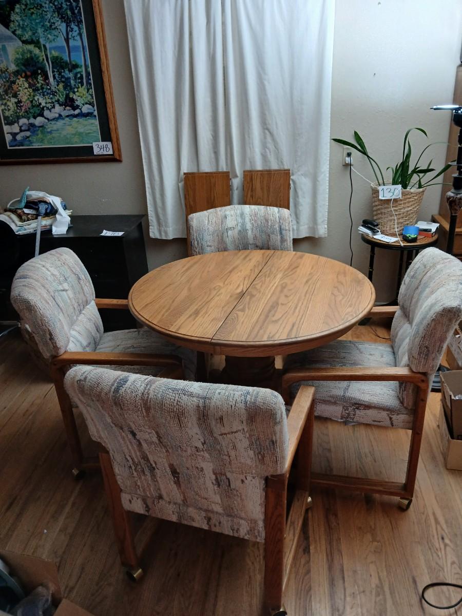 Oak diningroom table with claw foot base - 4 fabric covered chairs and two table leafs.