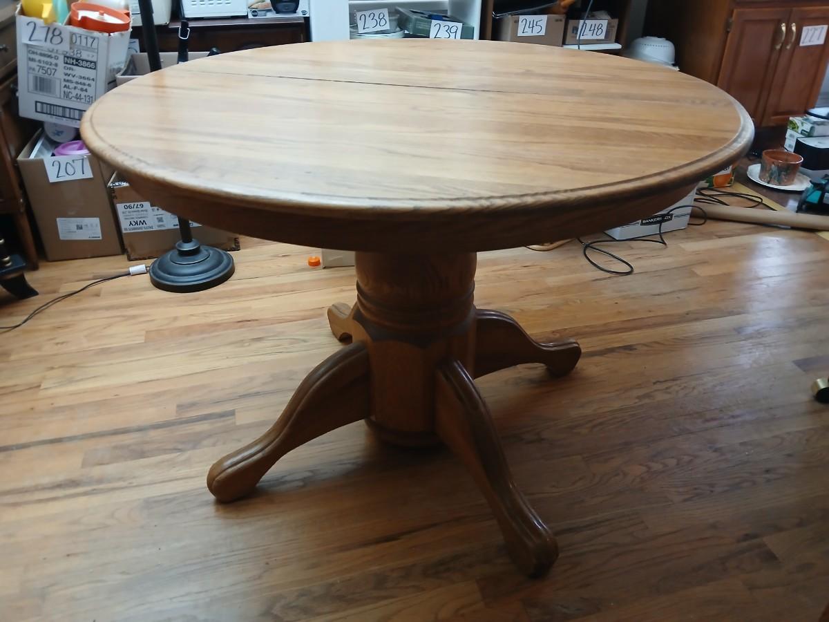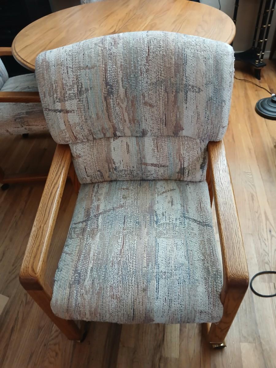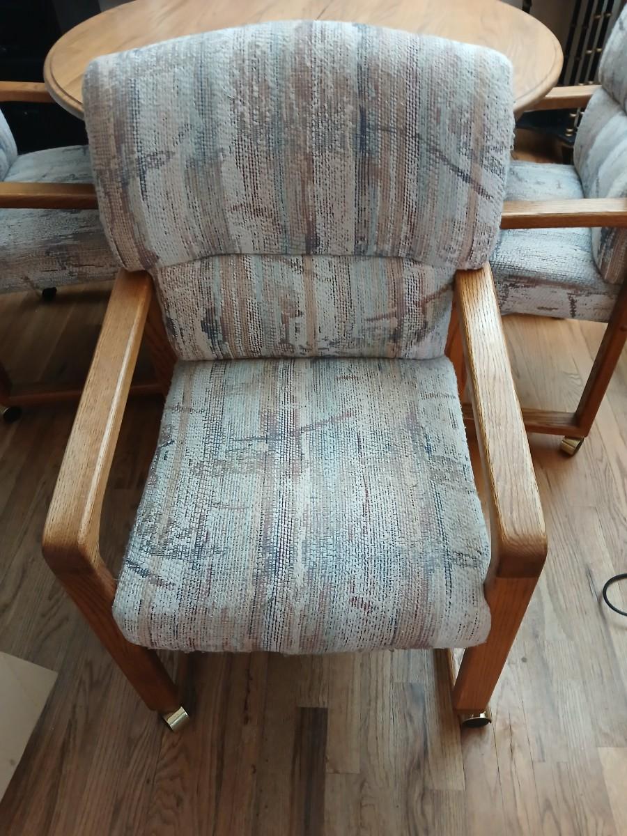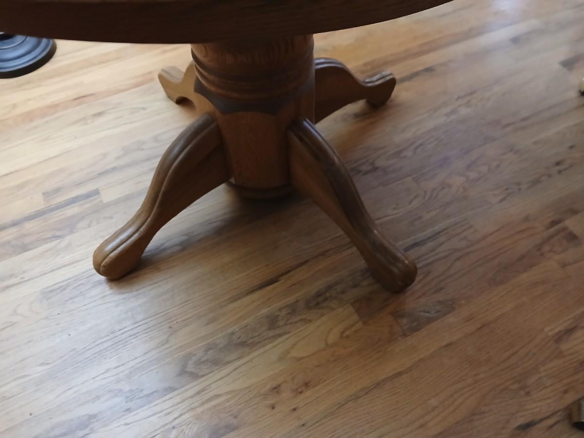 Oak diningroom table with claw foot base - 4 fabric covered chairs and two table leafs.