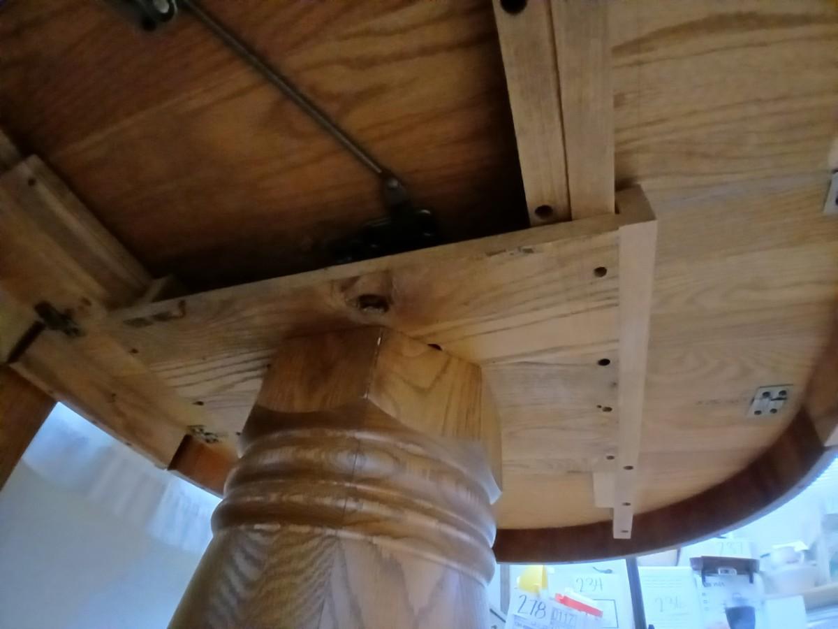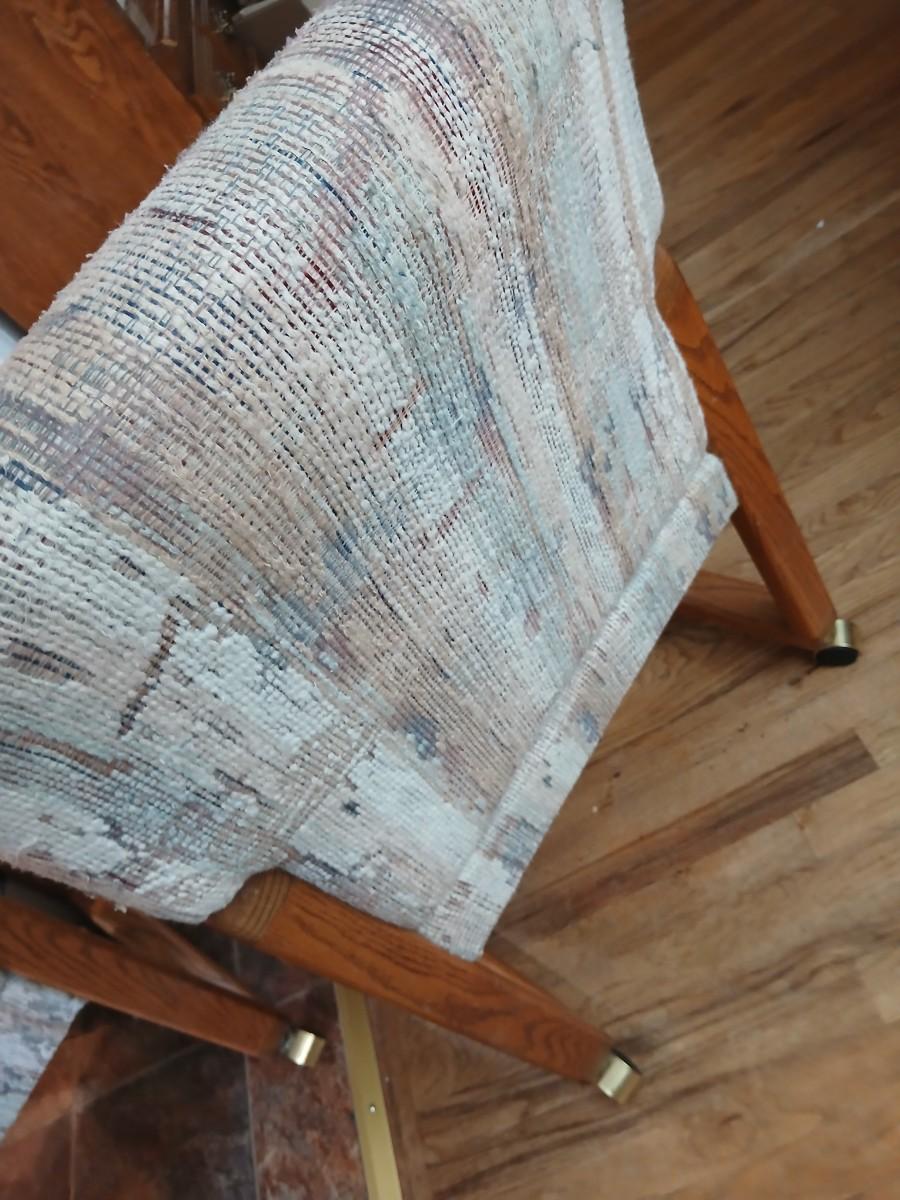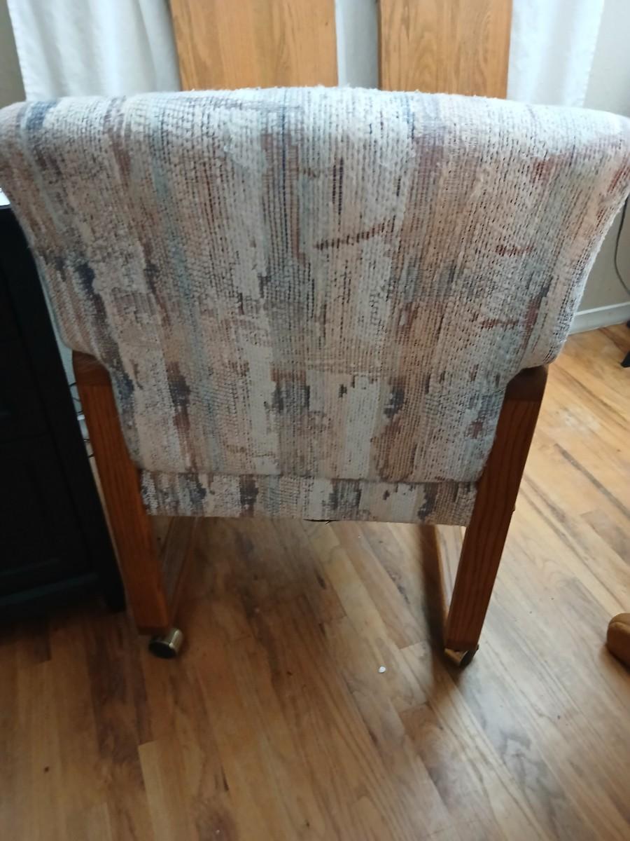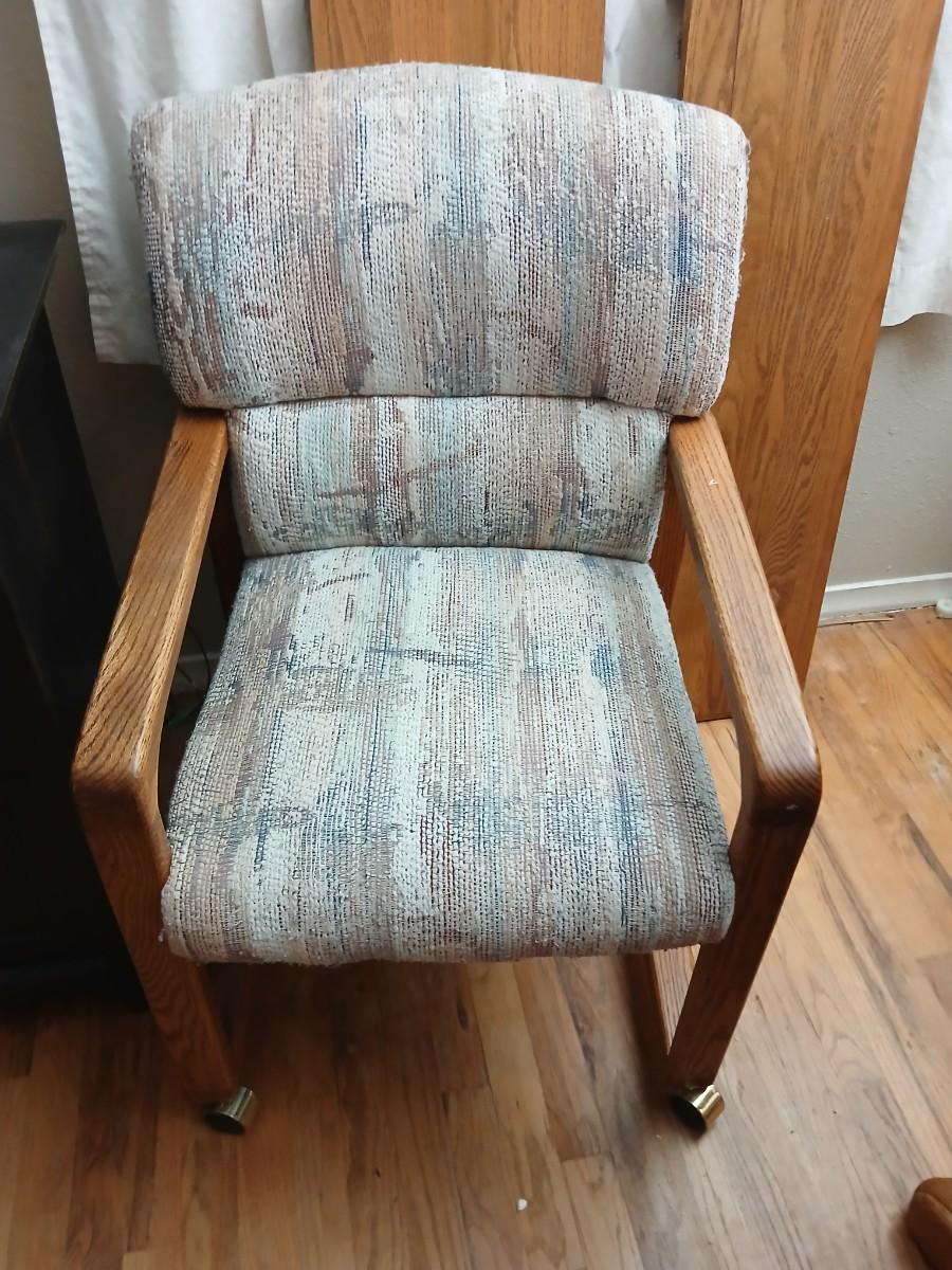 Oak diningroom table with claw foot base - 4 fabric covered chairs and two table leafs.