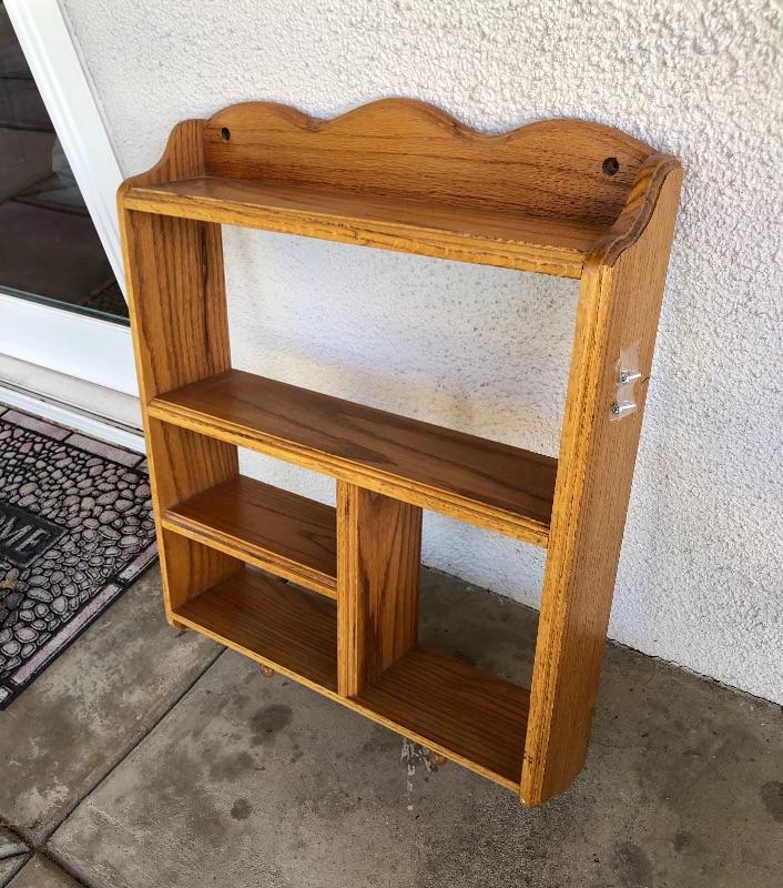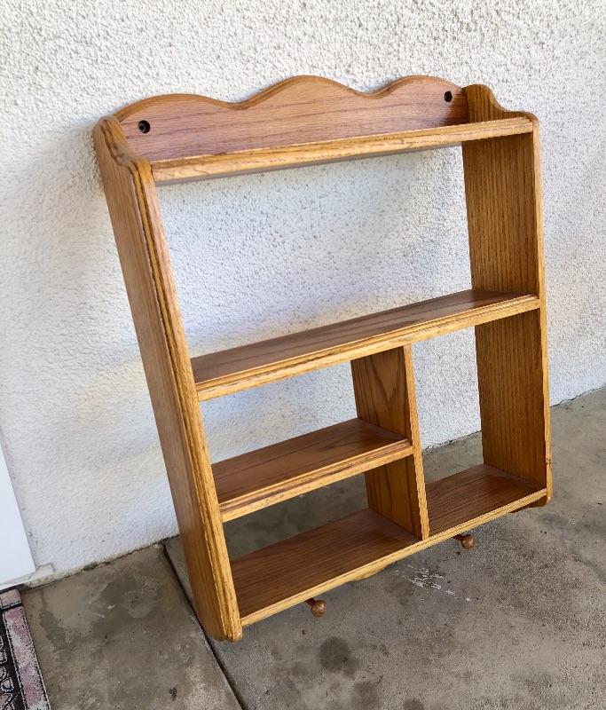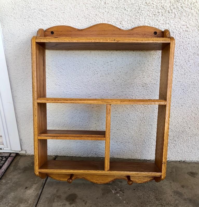 Oak display shelf, can hold many small items and hangs on wall. Approx 2’ x 3’