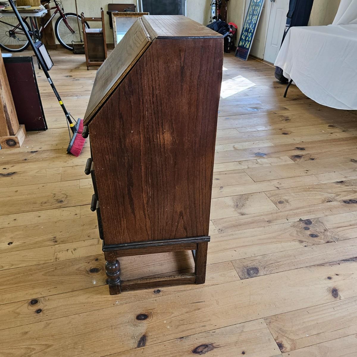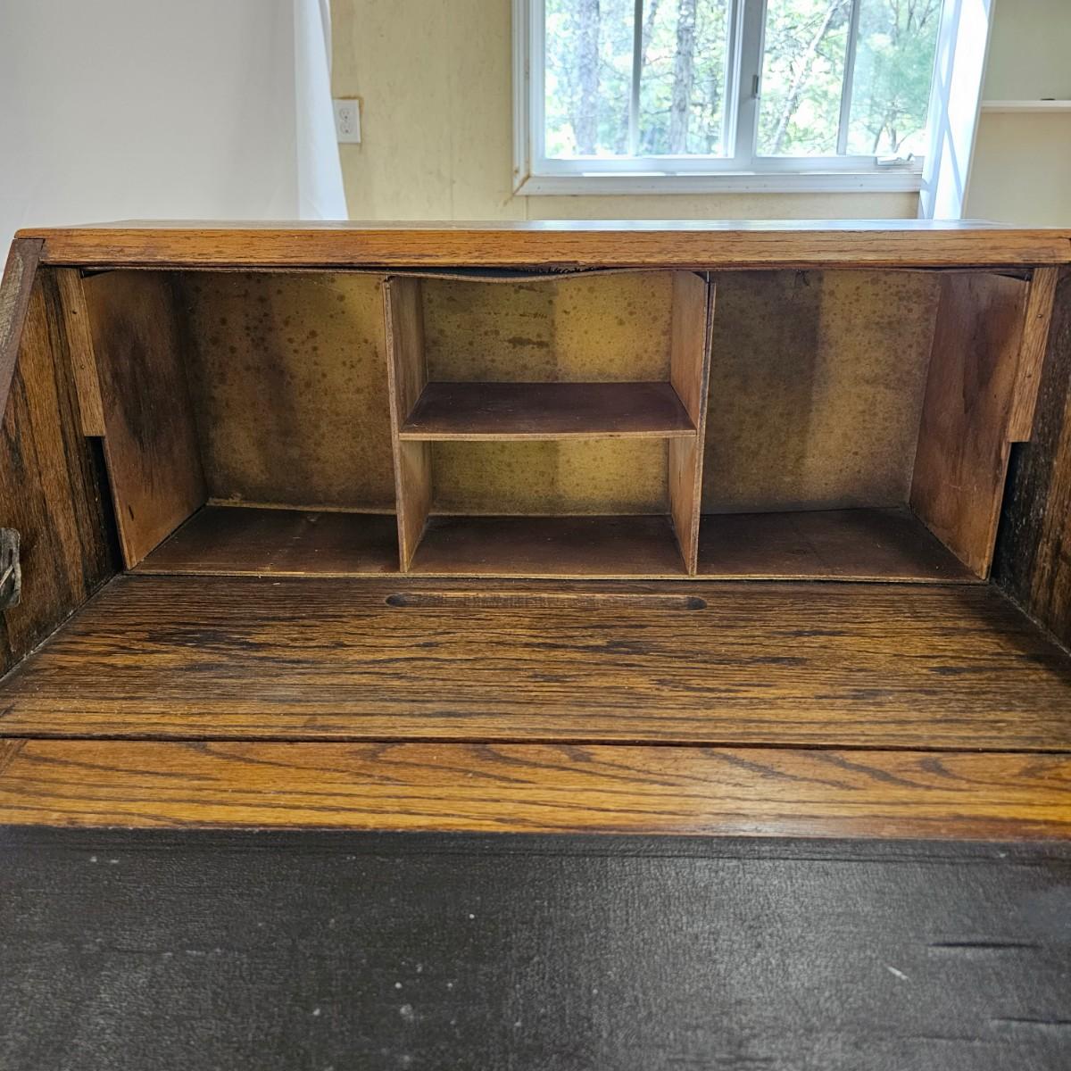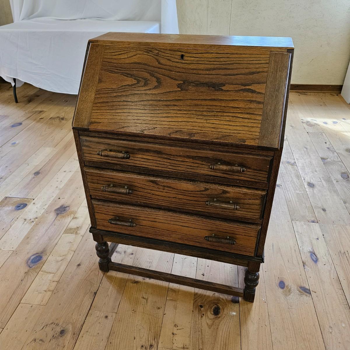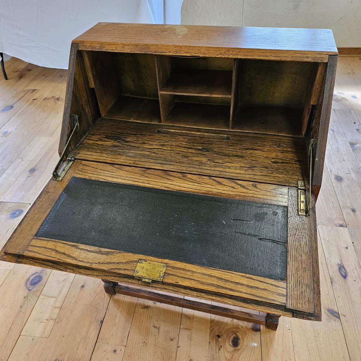 A vintage drop front desk that appears to be made of oak. Several storage cubbies inside, a cutout for pencils/pens. Brass hardware and embossed leather top. Also three drawers with dovetail joints. Desk measures 27" x 16" x 38"H. No key for lock. Some water rings on top of desk. See photos for details. Local pickup only.