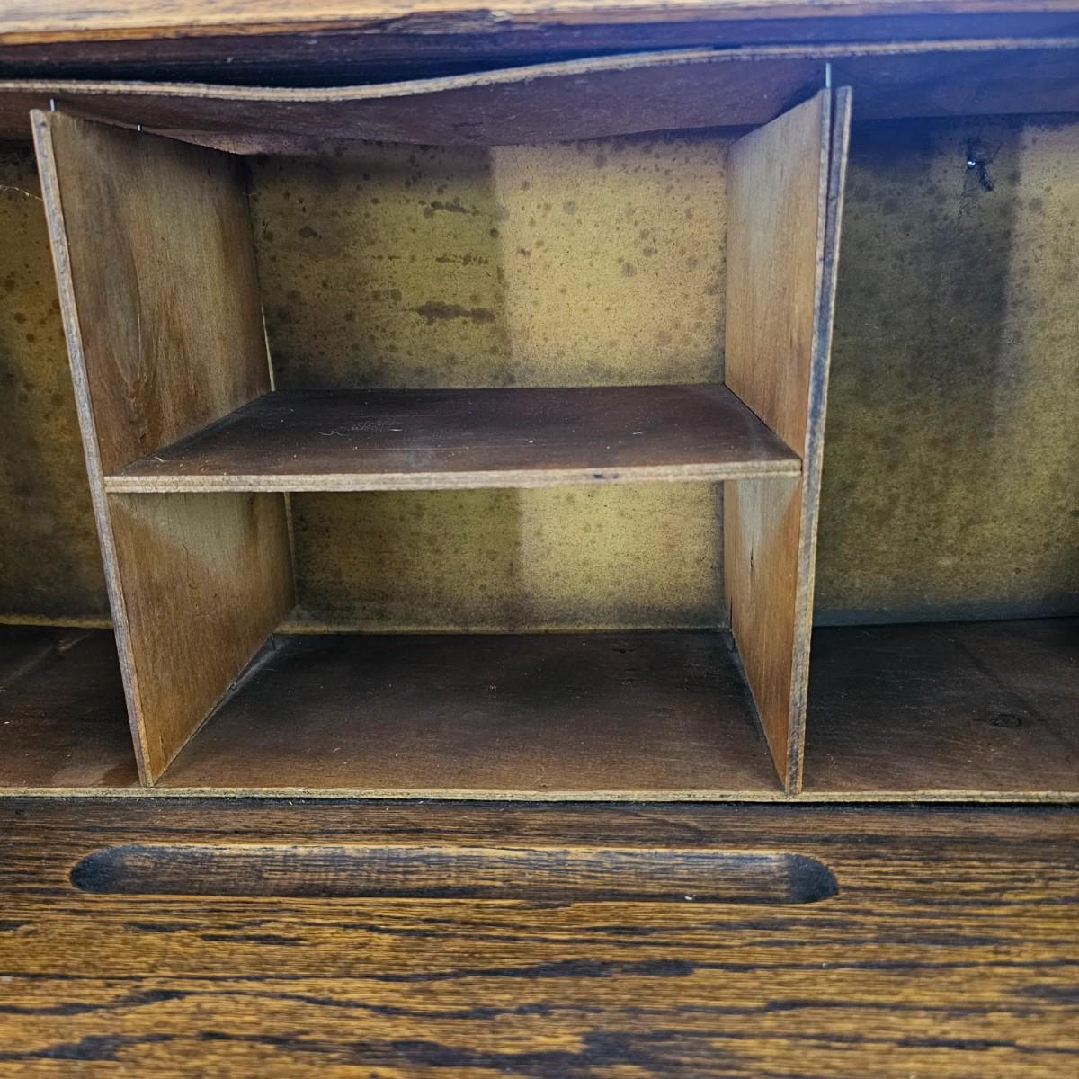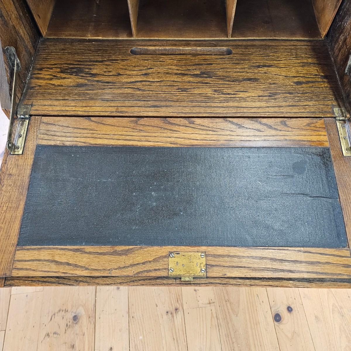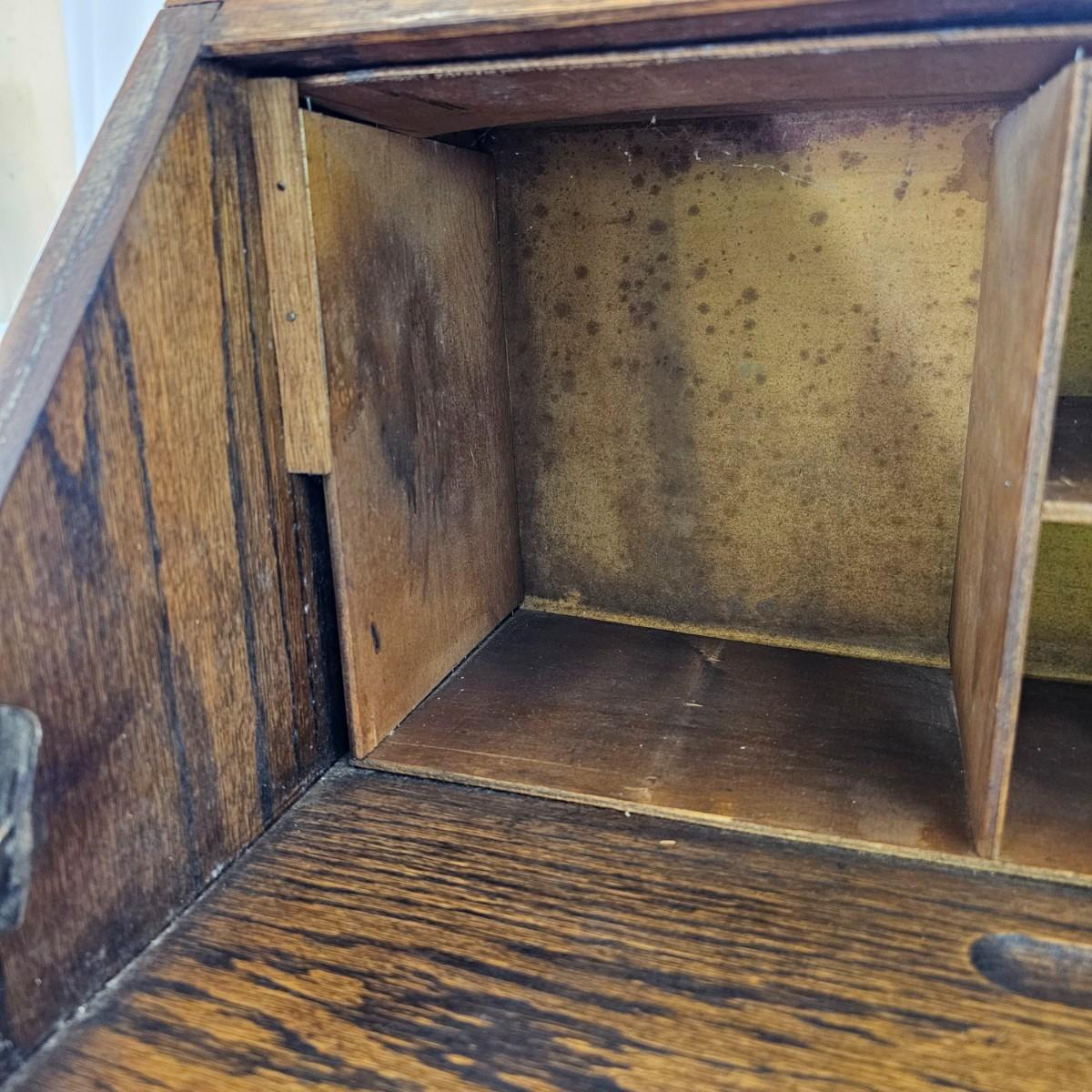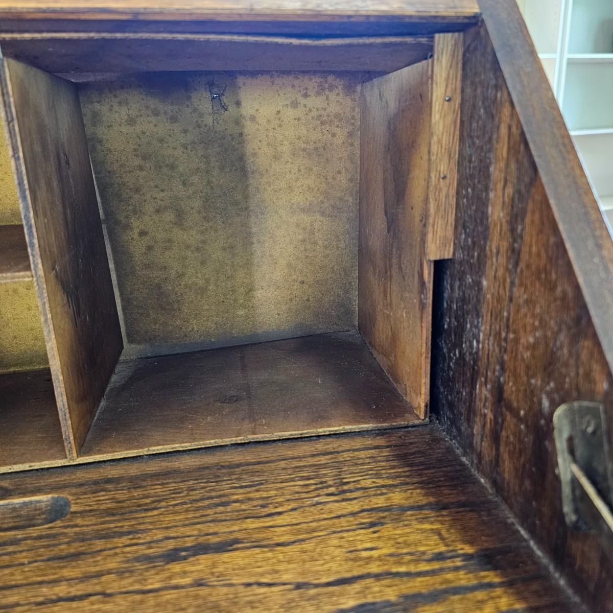 A vintage drop front desk that appears to be made of oak. Several storage cubbies inside, a cutout for pencils/pens. Brass hardware and embossed leather top. Also three drawers with dovetail joints. Desk measures 27" x 16" x 38"H. No key for lock. Some water rings on top of desk. See photos for details. Local pickup only.