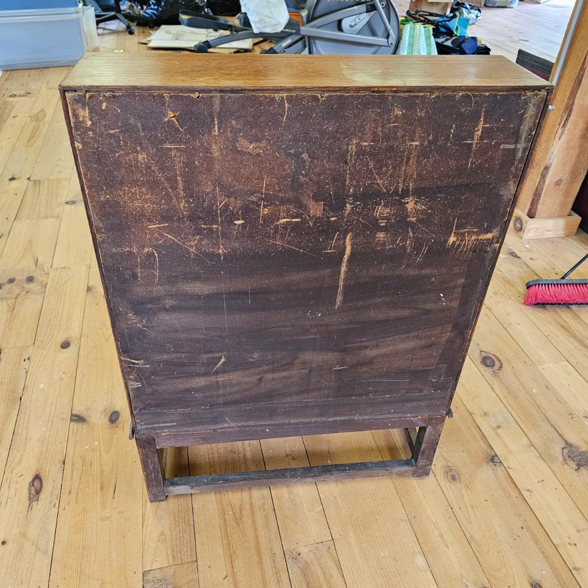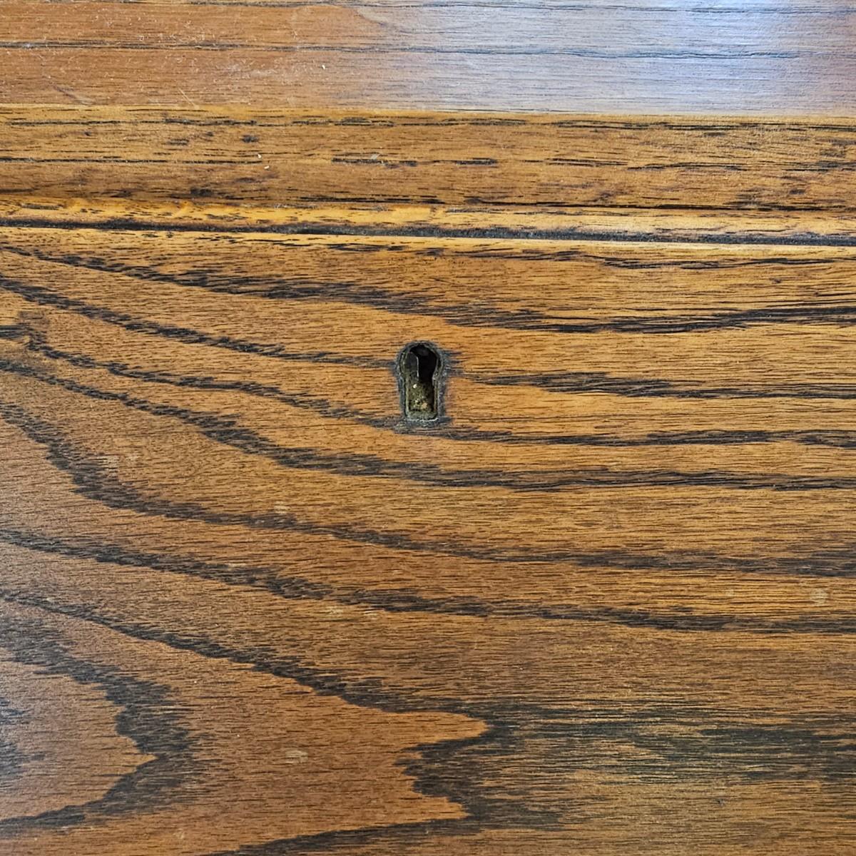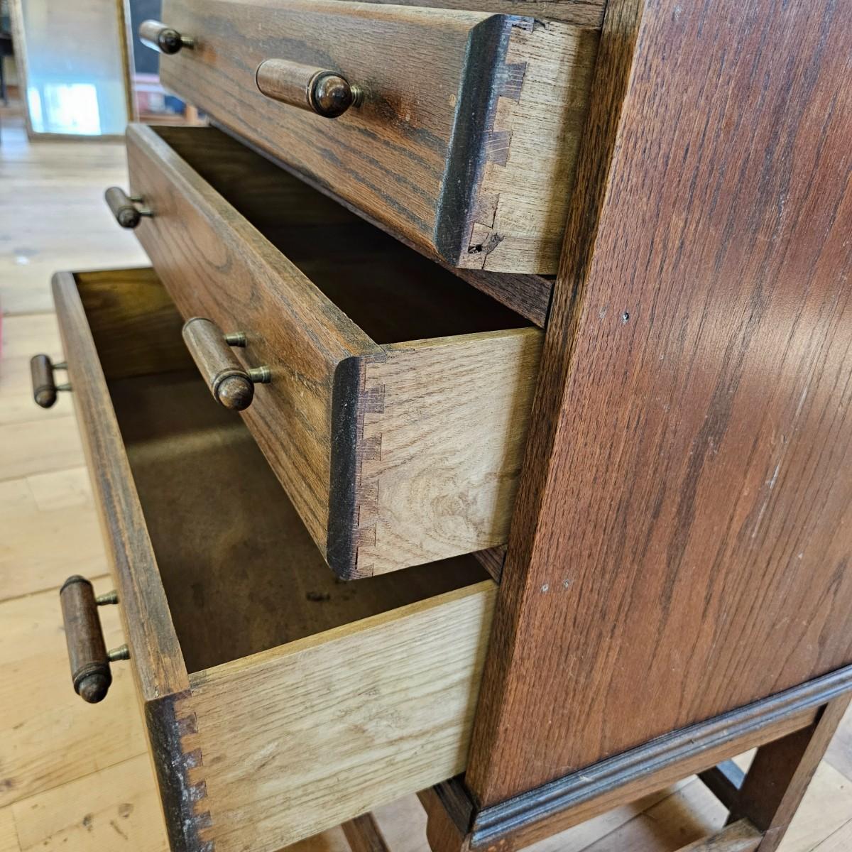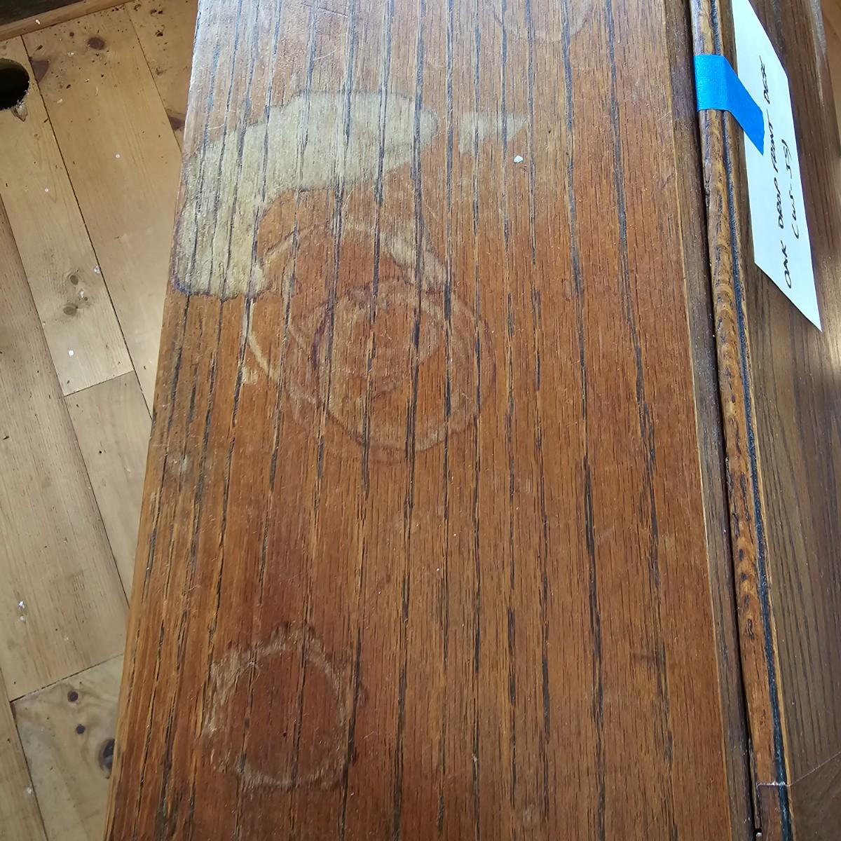A vintage drop front desk that appears to be made of oak. Several storage cubbies inside, a cutout for pencils/pens. Brass hardware and embossed leather top. Also three drawers with dovetail joints. Desk measures 27" x 16" x 38"H. No key for lock. Some water rings on top of desk. See photos for details. Local pickup only.