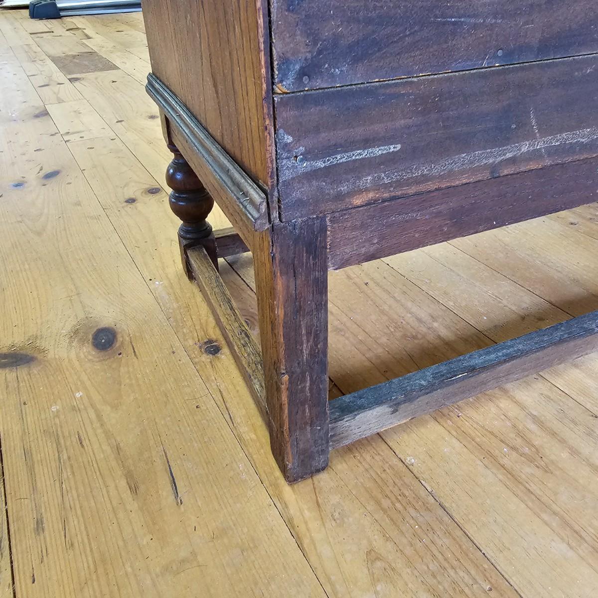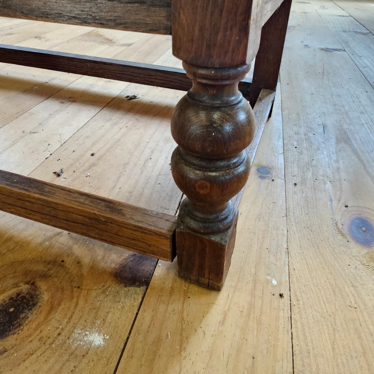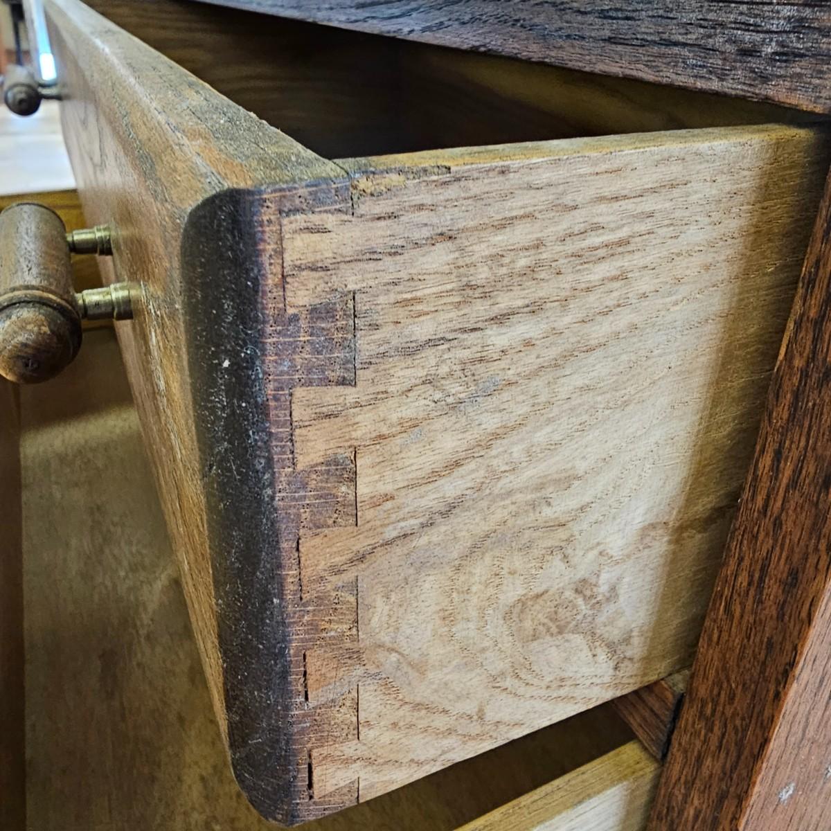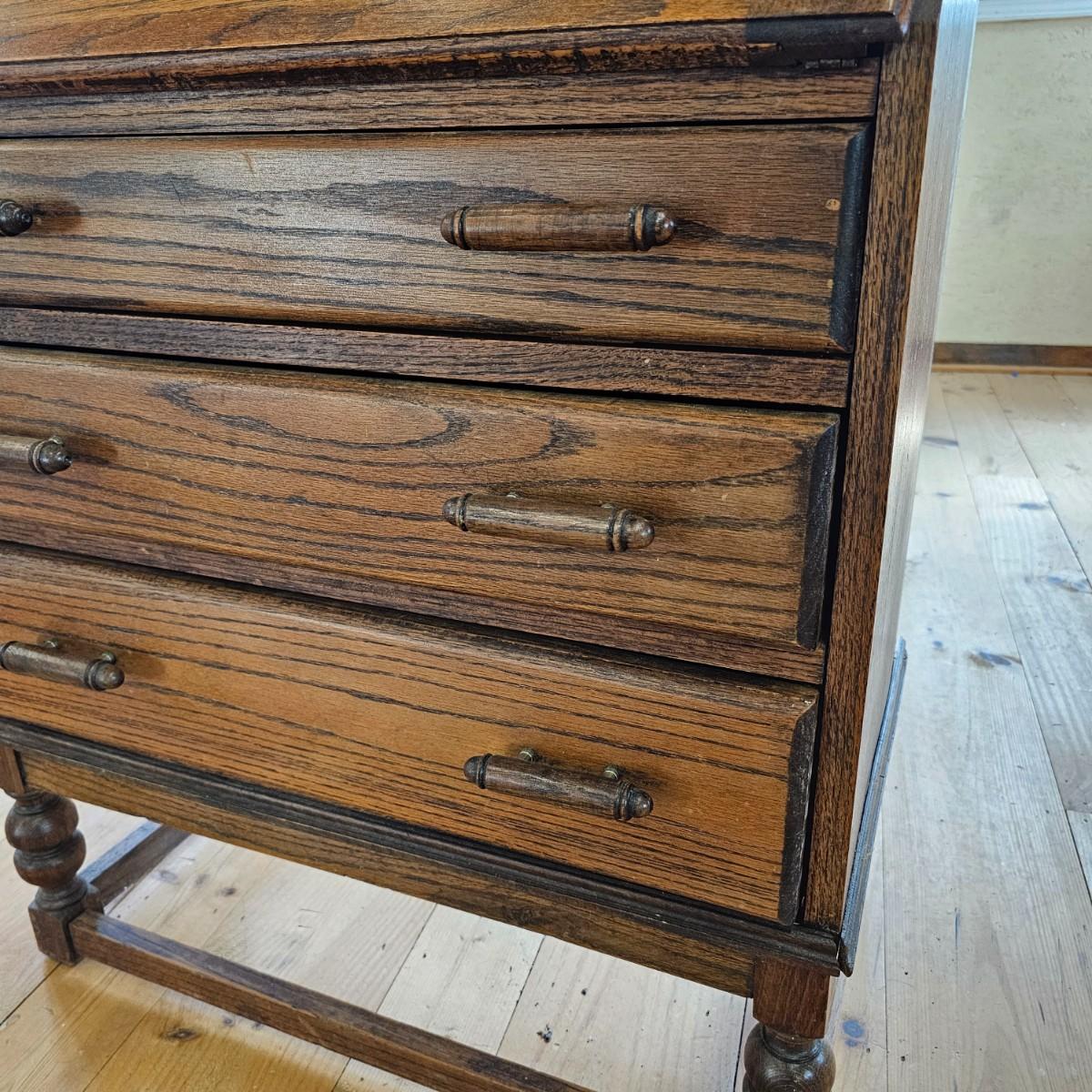 A vintage drop front desk that appears to be made of oak. Several storage cubbies inside, a cutout for pencils/pens. Brass hardware and embossed leather top. Also three drawers with dovetail joints. Desk measures 27" x 16" x 38"H. No key for lock. Some water rings on top of desk. See photos for details. Local pickup only.