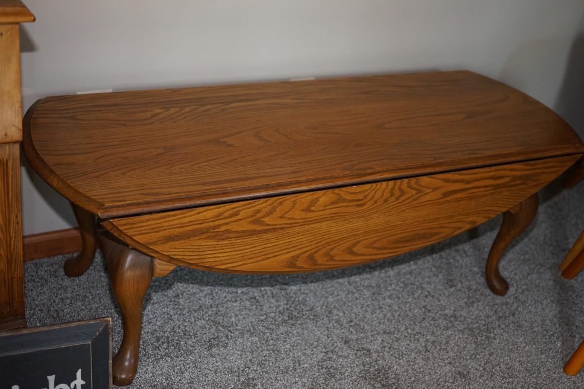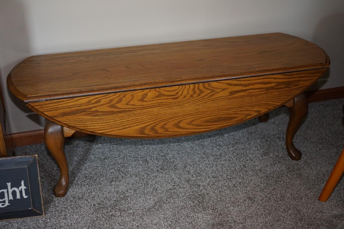 OAK DROP LEAF COFFEE TABLE. SOLID OAK WITH QUEEN ANNE STYLE LEGS