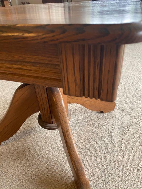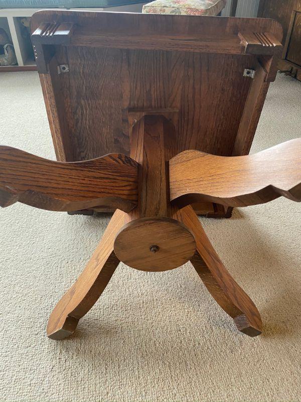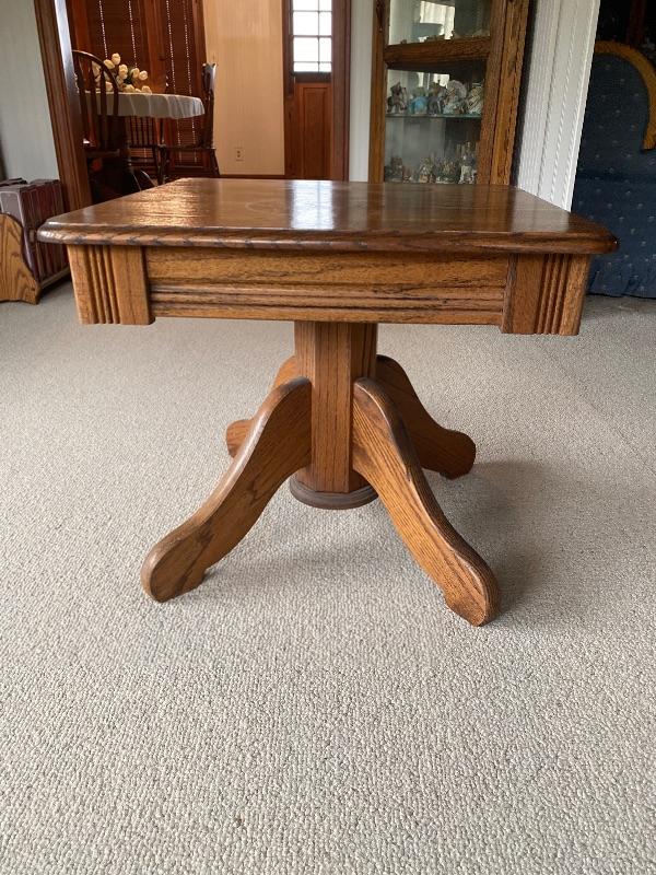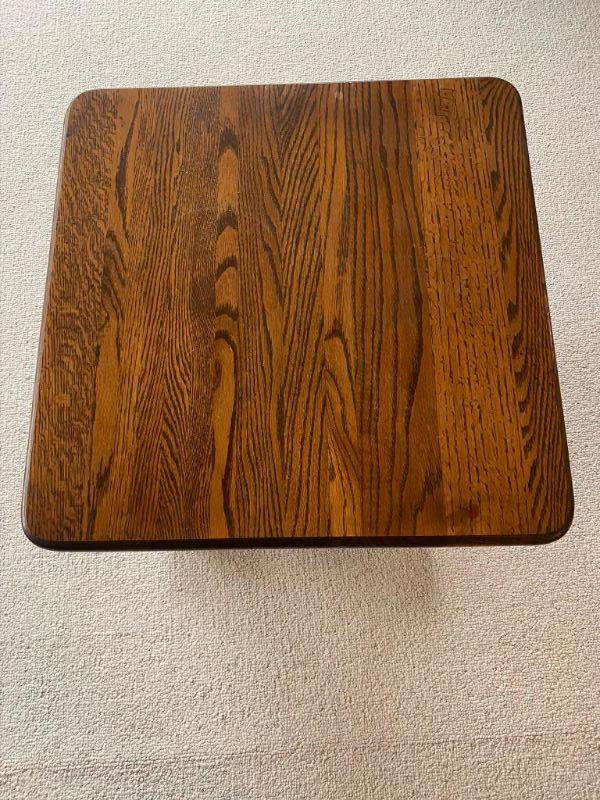 Square oak end table. Measures 24” square. Stands 21” tall. Good Condition.