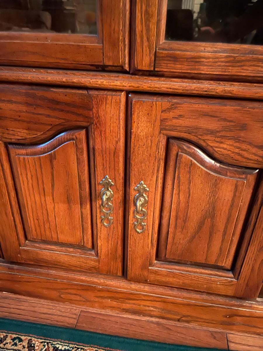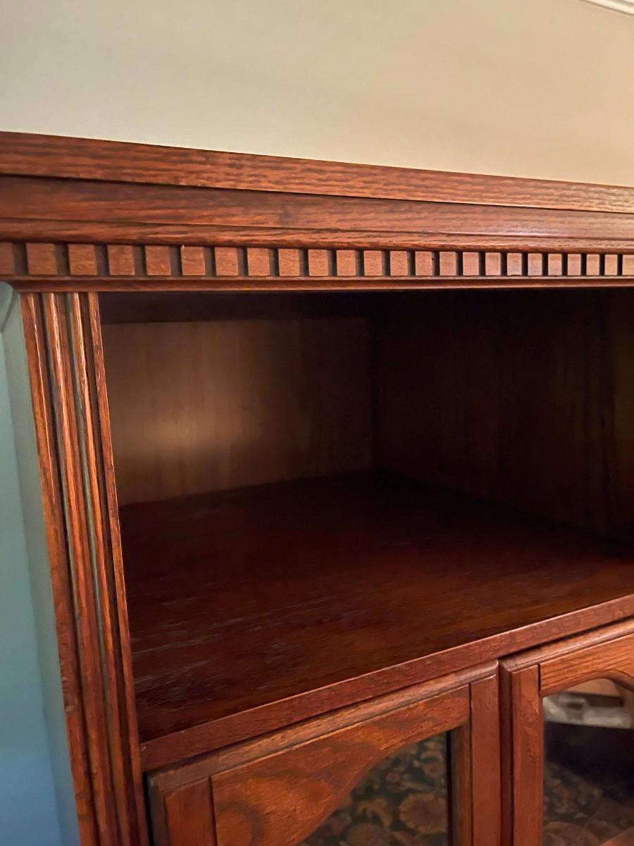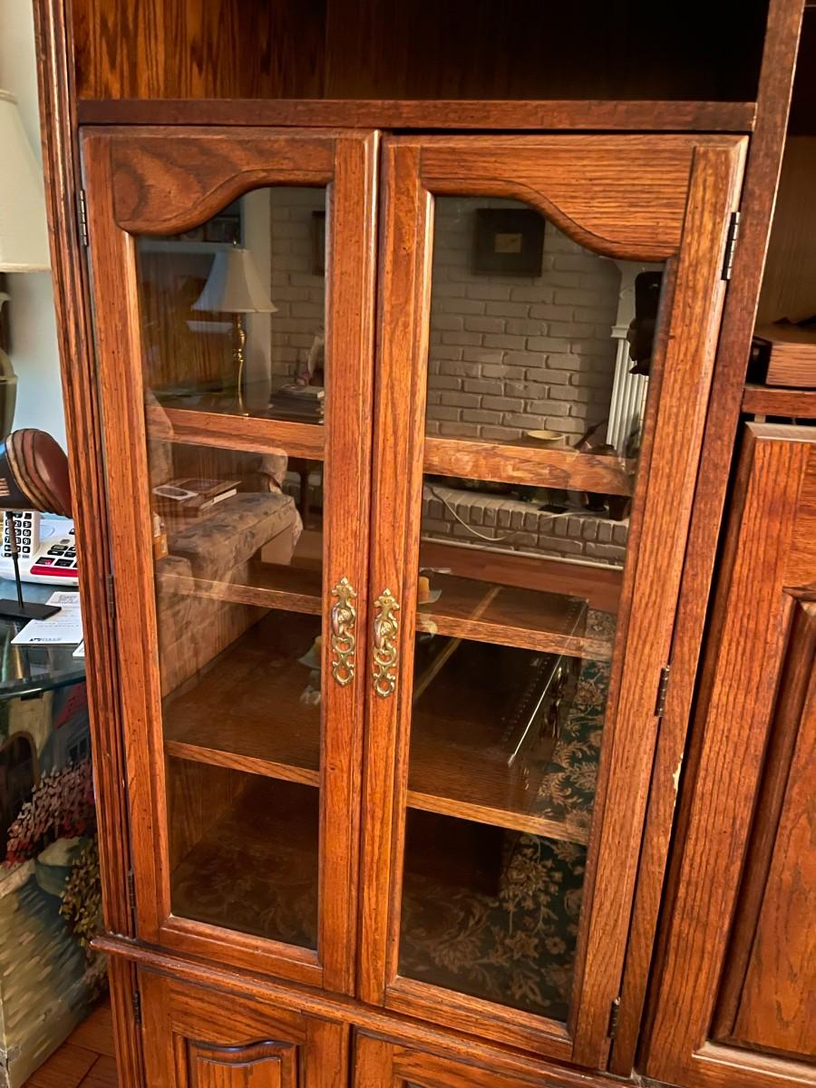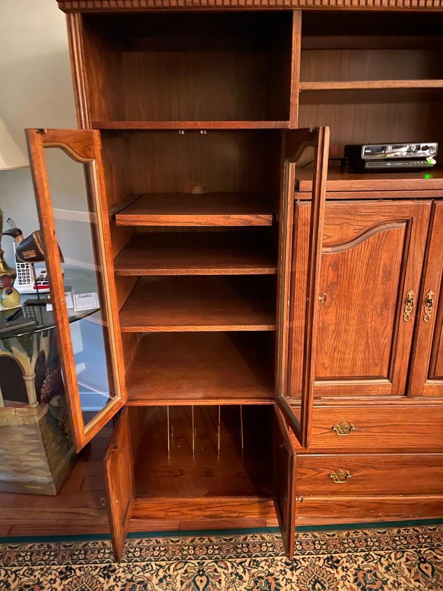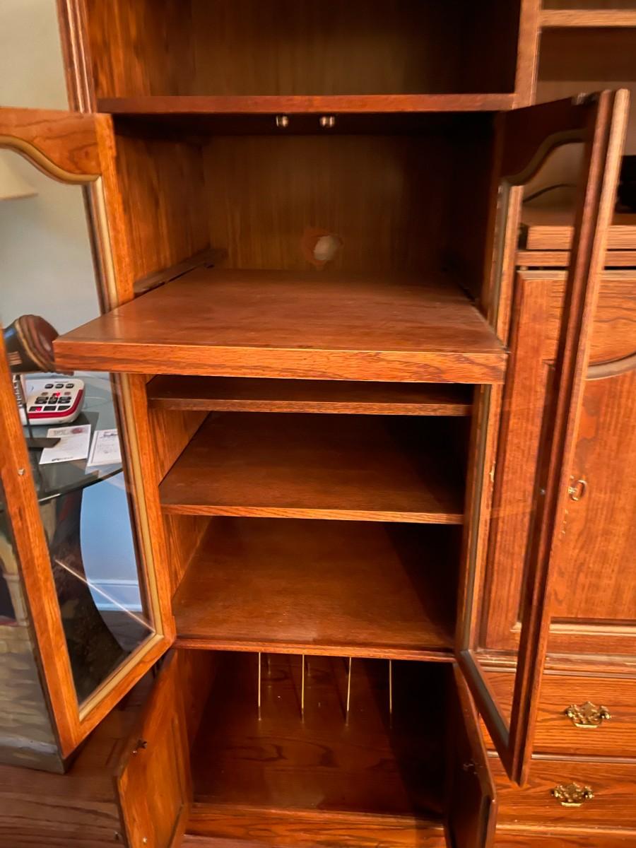 The top shelf behind the glass doors pulls out, as does the shelf above the solid cabinet doors. Inside the solid cabinet doors, there is a pull out shelf. The solid doors can slide in once open.