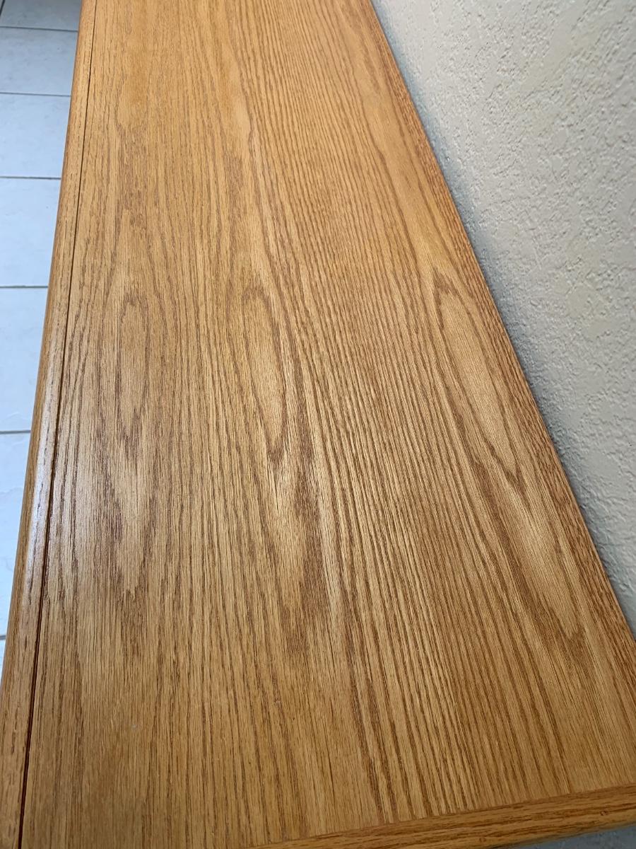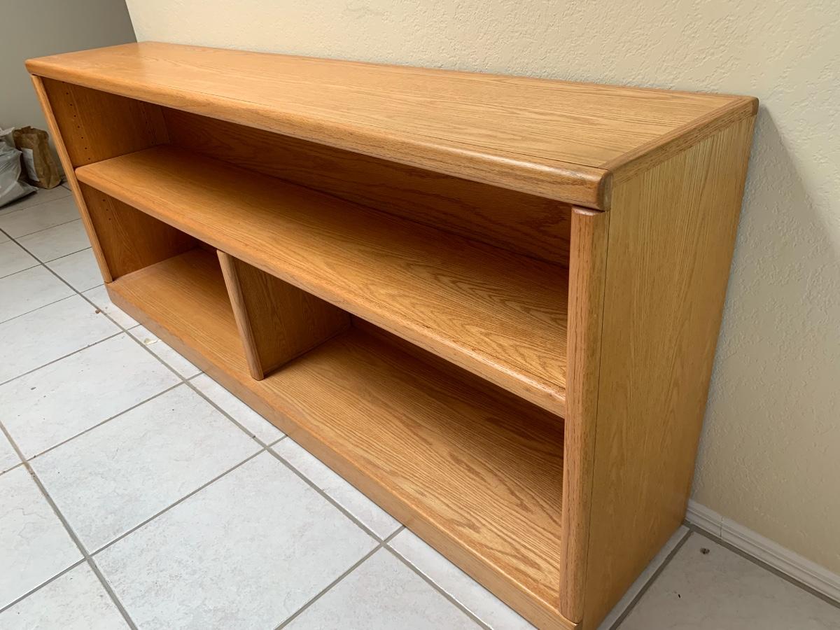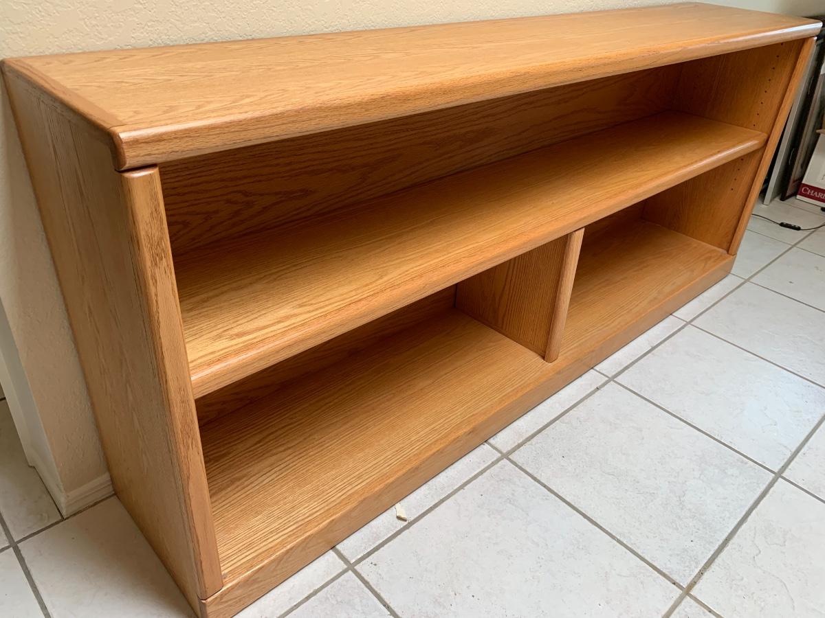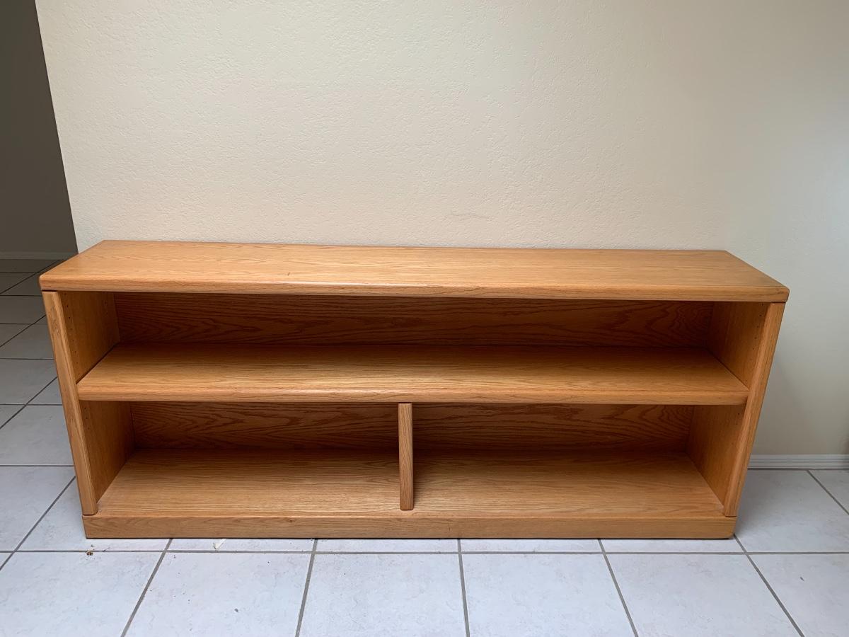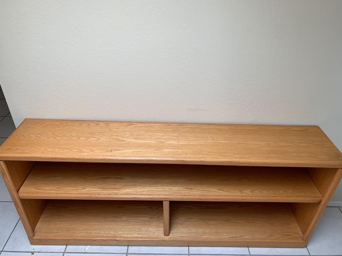 Oak bookshelf in good condition, slight separation where top meets the back *please see photos* (72 inches in length, 14 inches in depth, 30 inches in height)
