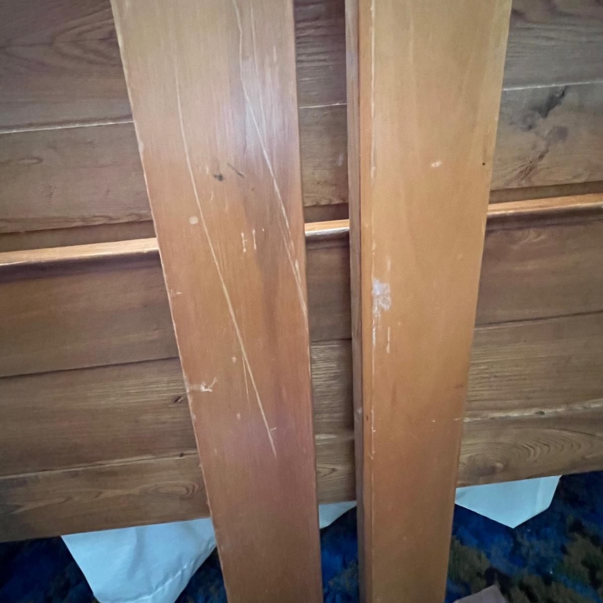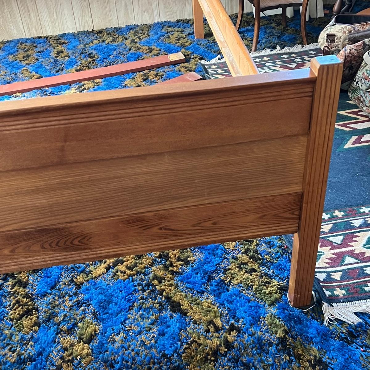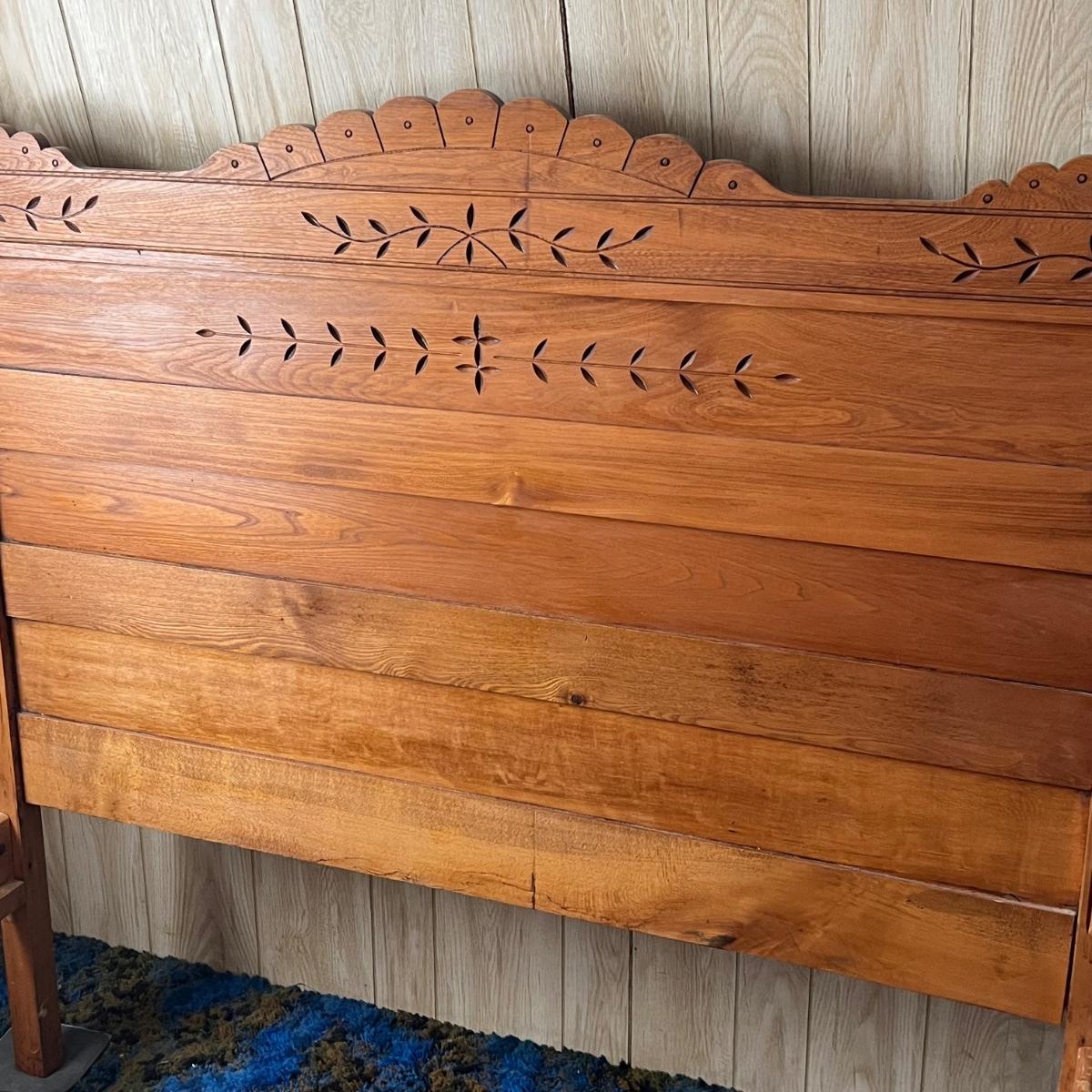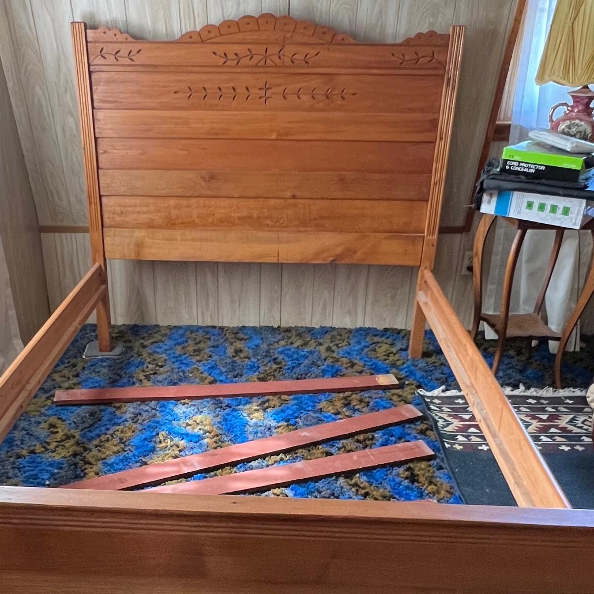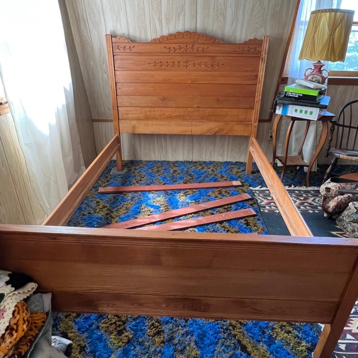The seller of this solid wood Butter Mold style bed has stated the wood is hickory. Comes complete with headboard, footboard, side rails and slats. Note the side rails have some scratches, see image. Slats rest on the frame and were not in place when photographed.