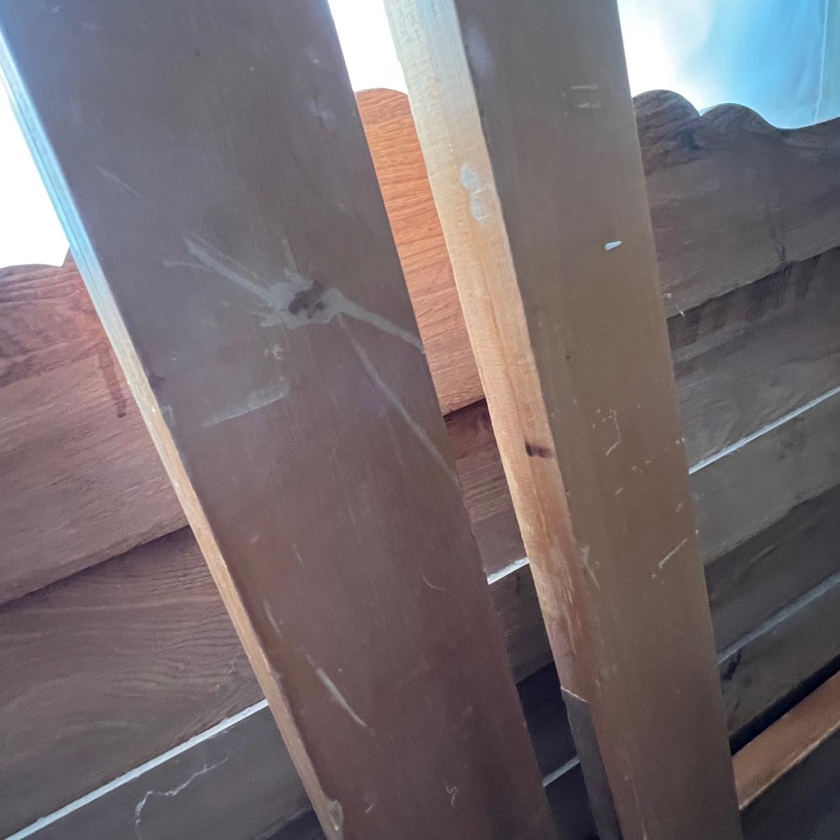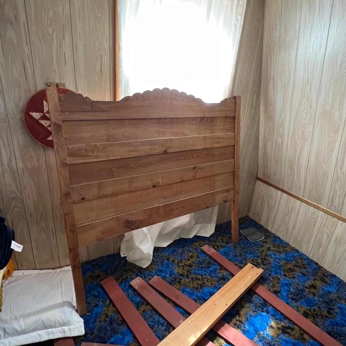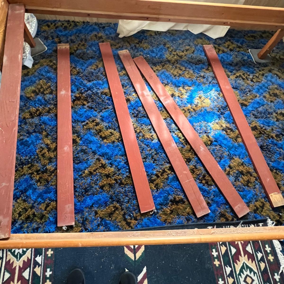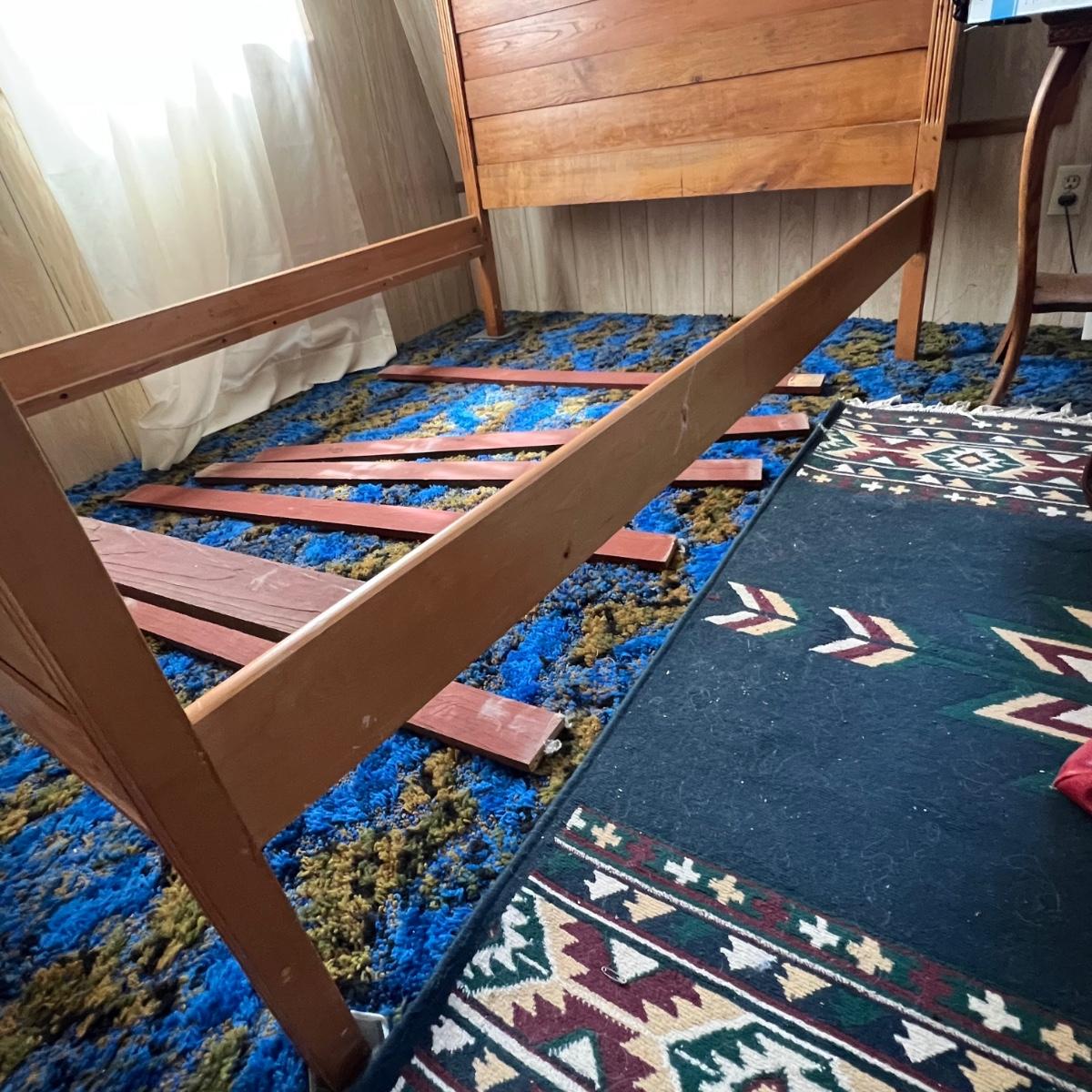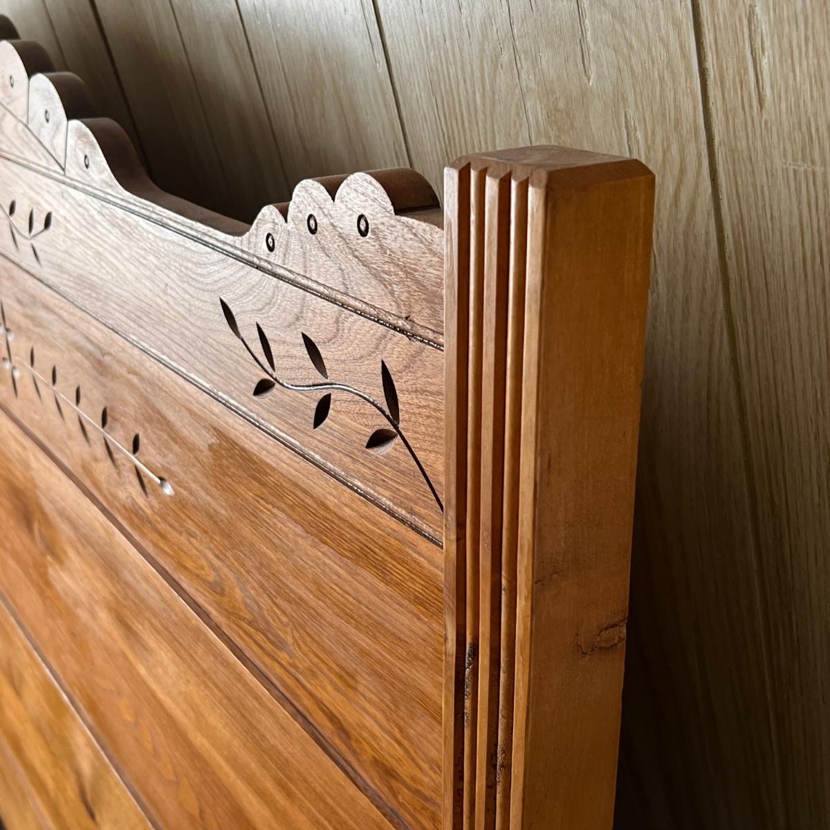 The seller of this solid wood Butter Mold style bed has stated the wood is hickory. Comes complete with headboard, footboard, side rails and slats. Note the side rails have some scratches, see image. Slats rest on the frame and were not in place when photographed.