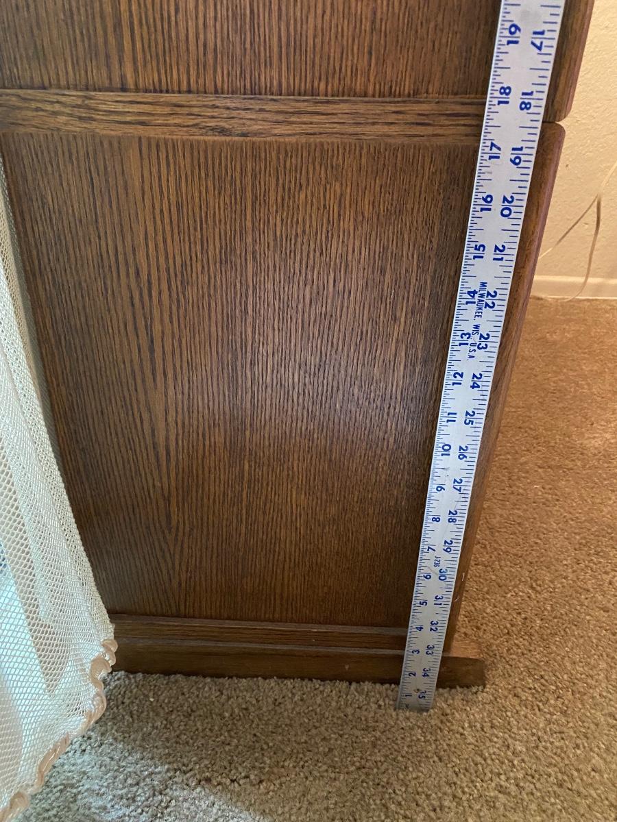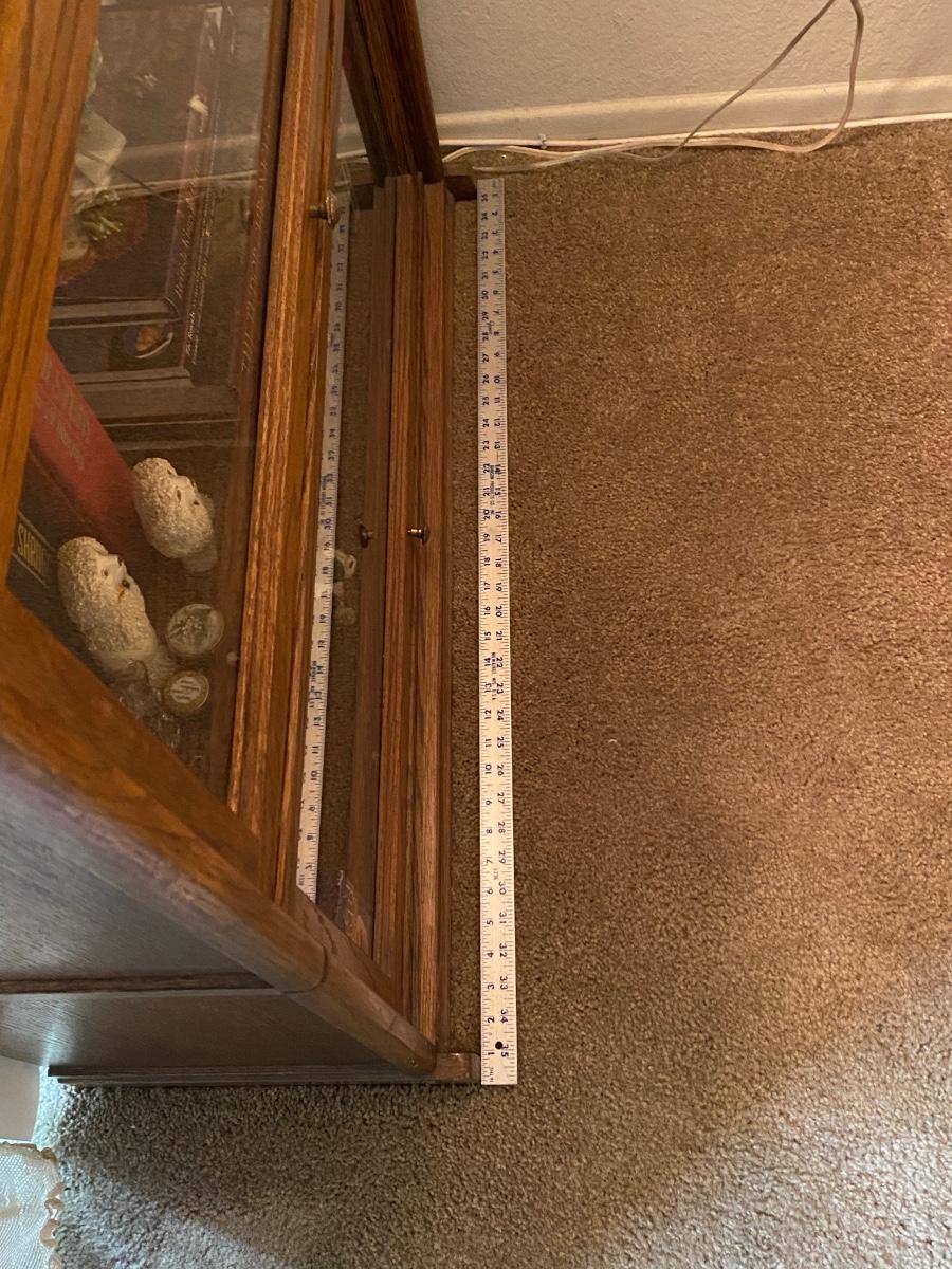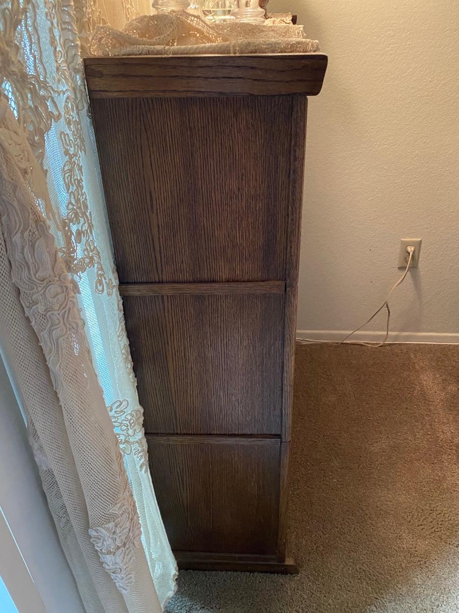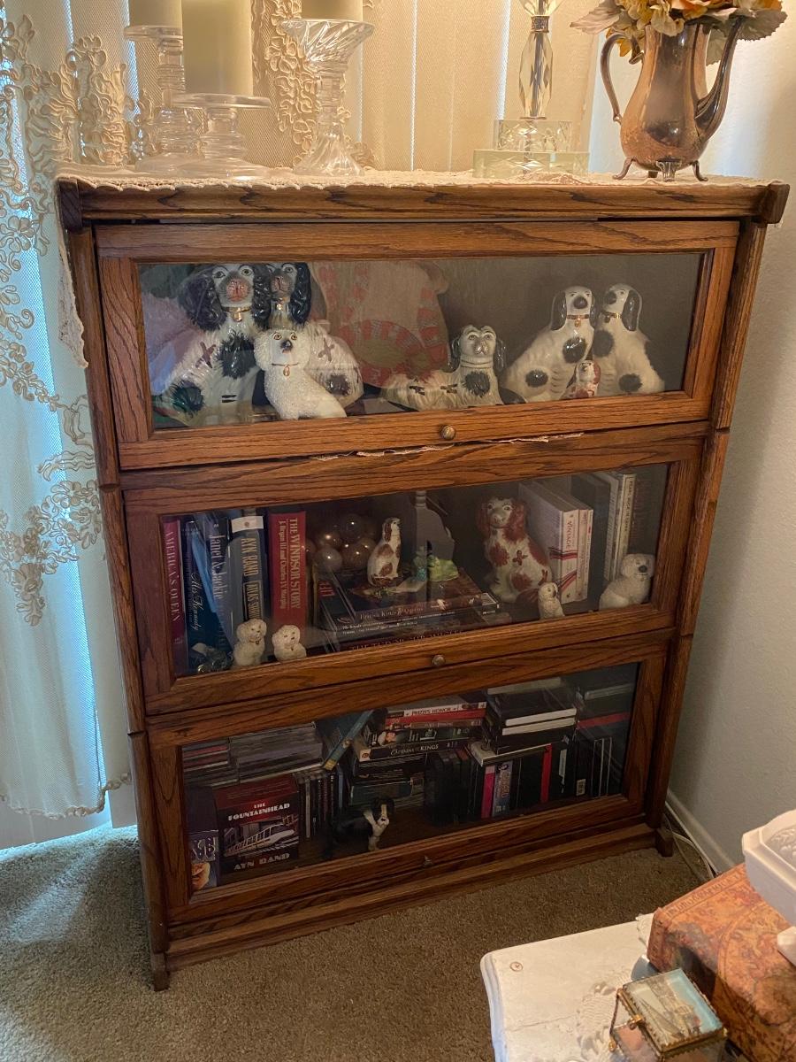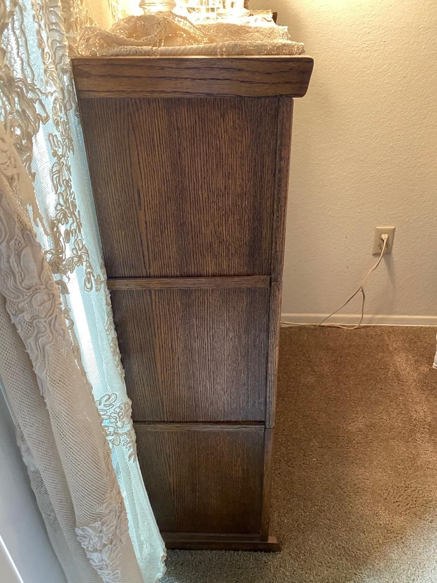 Oak & Glass Three Door Lawyer Bookcase Cabinet. In good condition. There is a light in the top cabinet, not working, may need new bulb. Magnetic closure to keep doors secure when closed. One piece, does not break apart. About 4' tall and 3' wide. Contents not included. **Off site in Brea, owner downsizing. Pick up will be after July 14th, we will schedule with winning bidders after that date.**