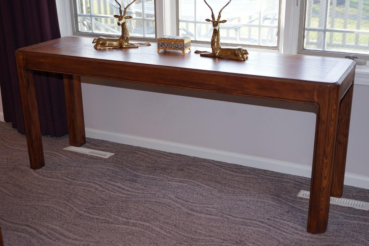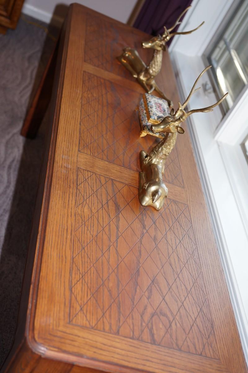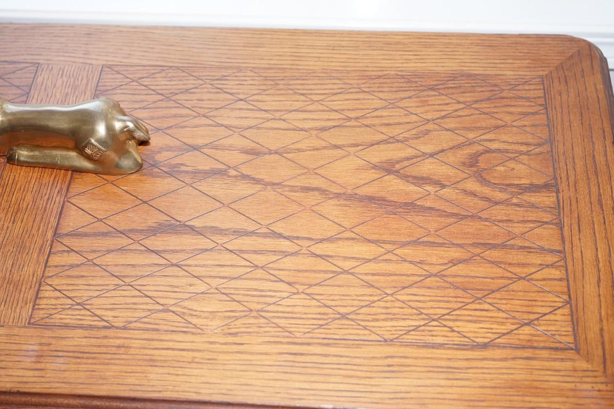 OAK HALL TABLE OF GOOD DESIGN TOP HAS A NICE INLAY- NATURAL FINISH
