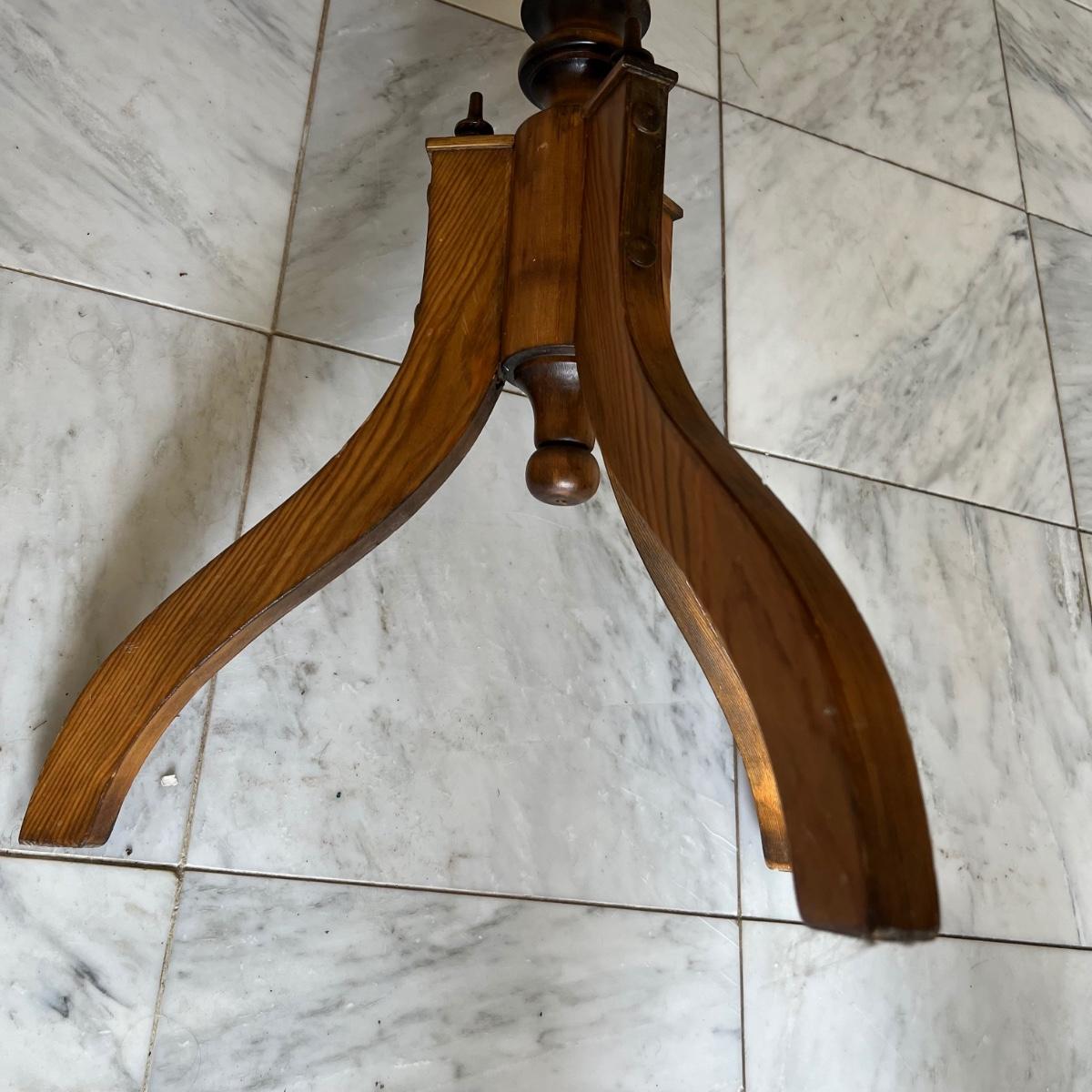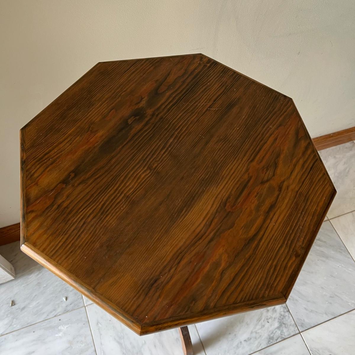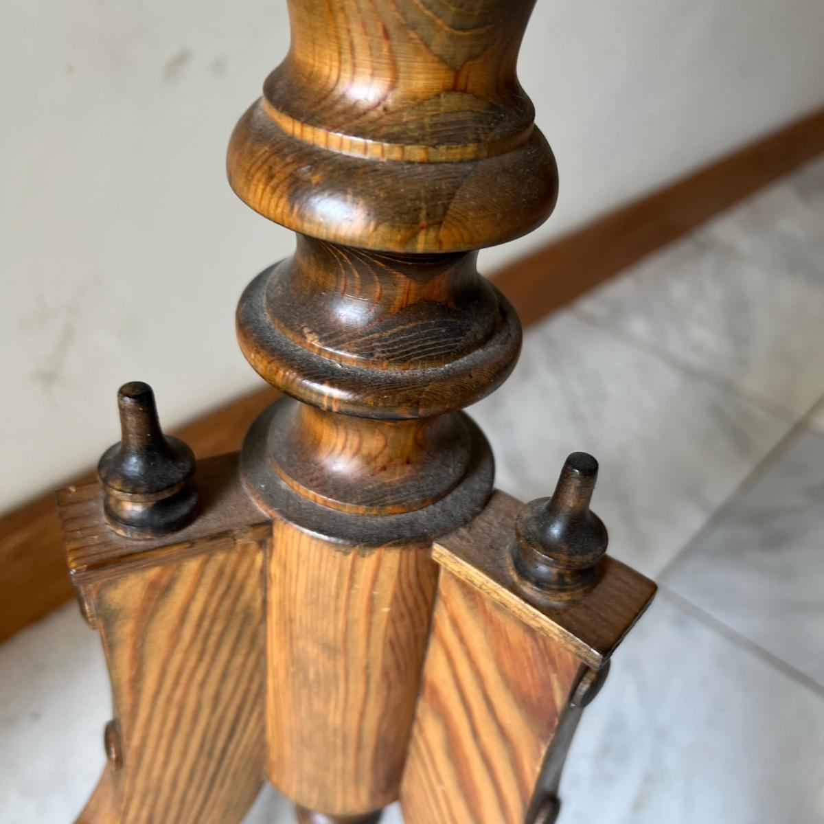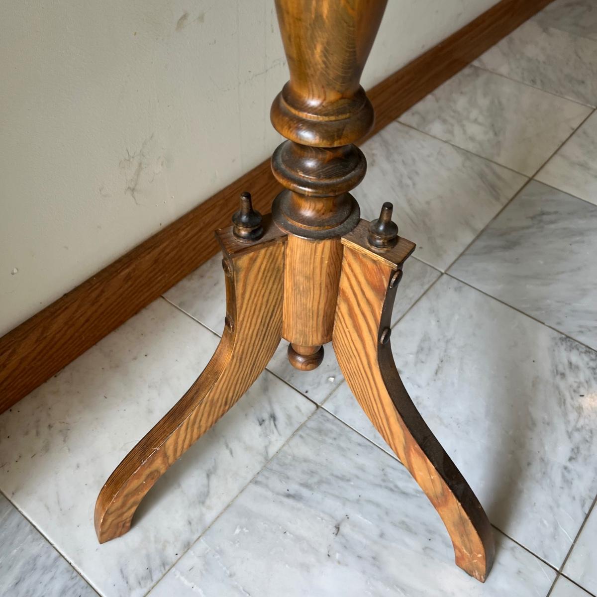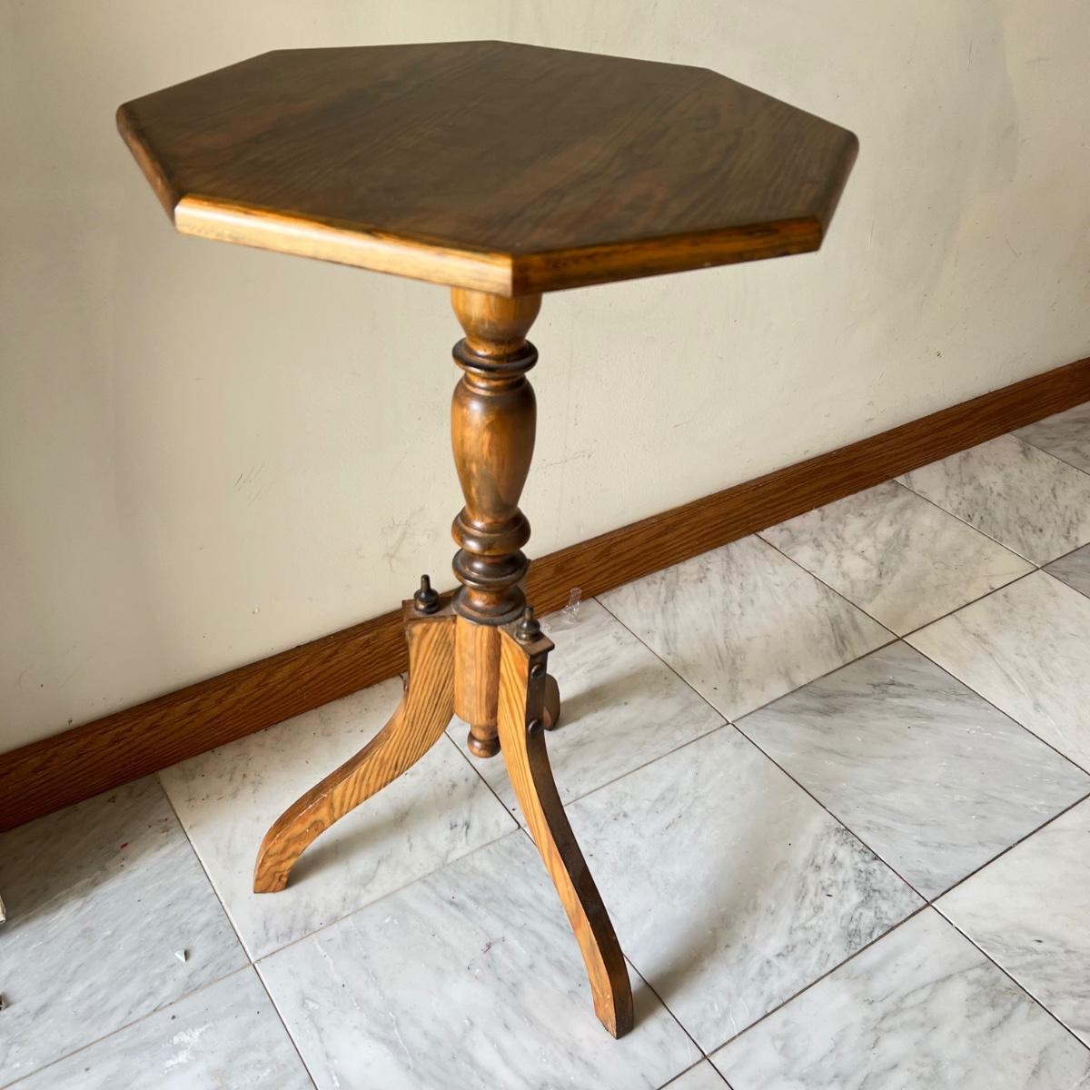 This solid wood occasional/lamp table appears to be oak. It measures approximately 17.5” x 17.5” x 29”H.