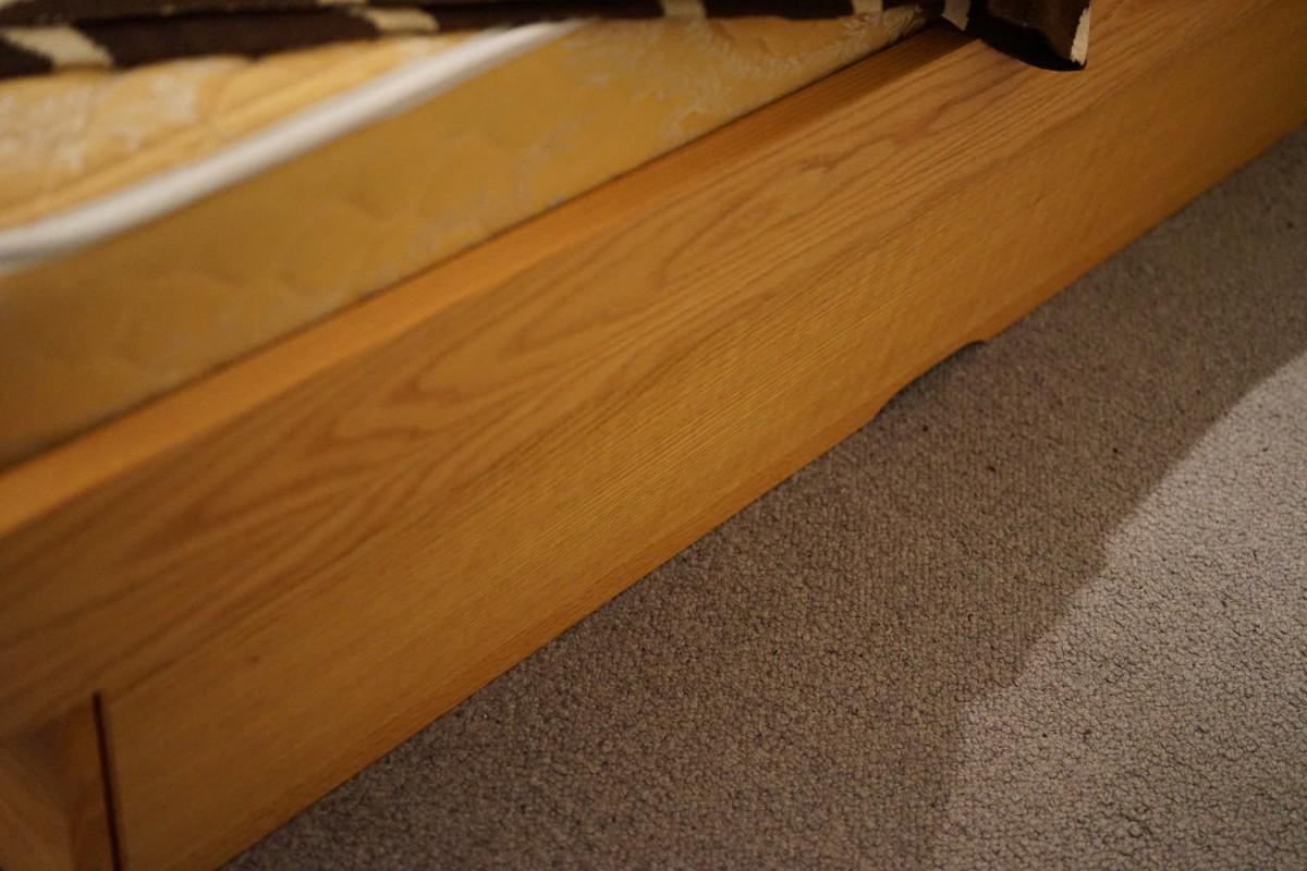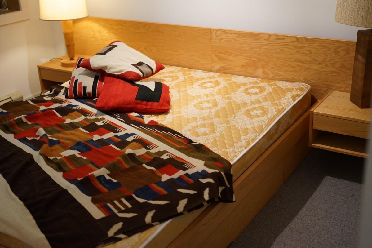 oak frame platform bed in mid century style. headboard which is two pieces has one drawer built in end tables. Two under the bed storage drawers.