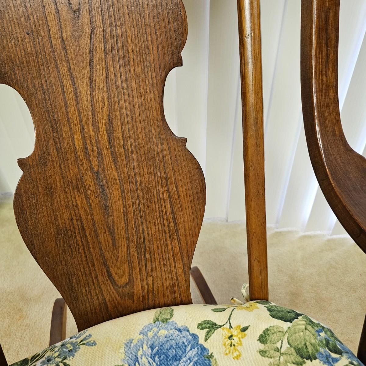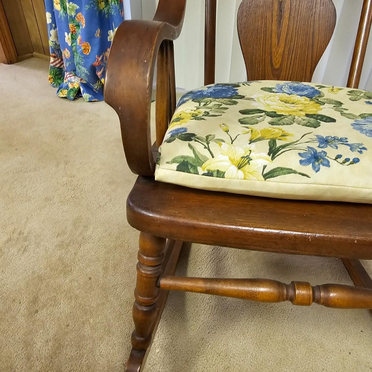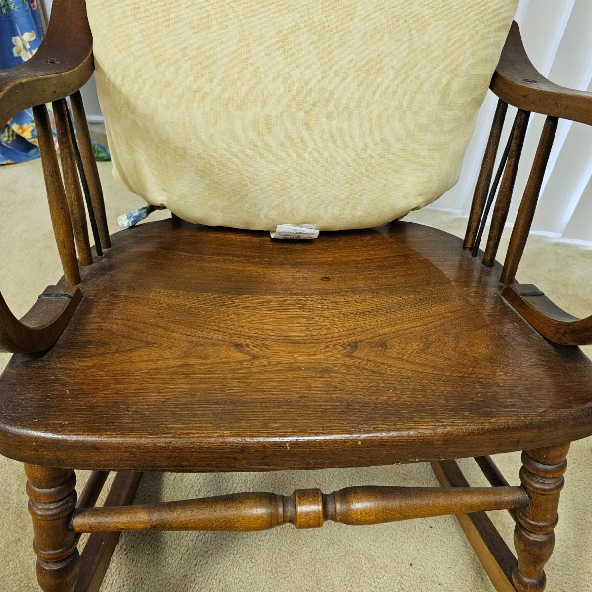 Nice, simple oak rocker with solid seat and cushion. Appears to also have other solid woods in its construction, and possibly hand forged hardware. Chair measures 23.5" x 33" x 39" H and has a 16" seat height. Curved arms with apindle supports. See photos for details. Local pickup only.