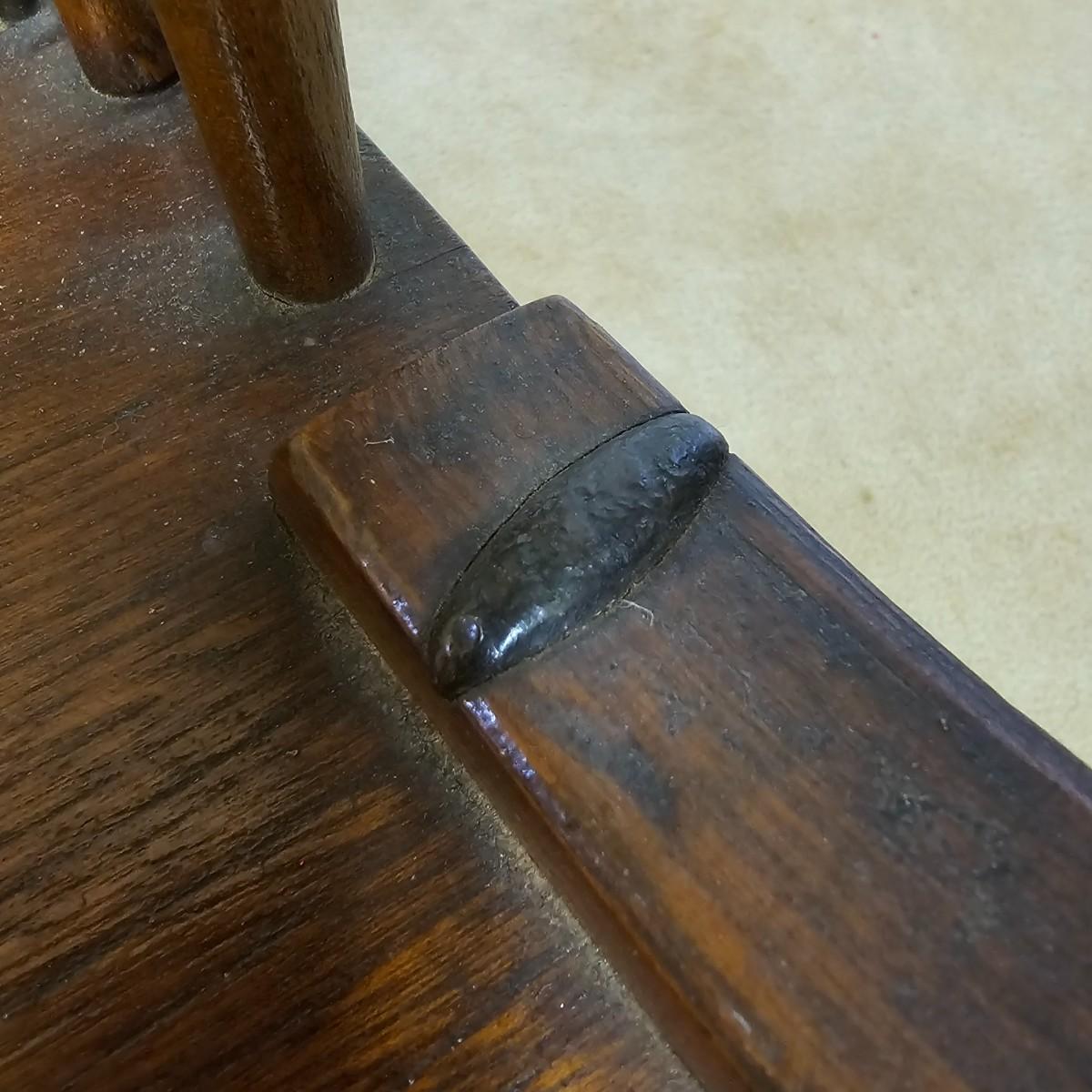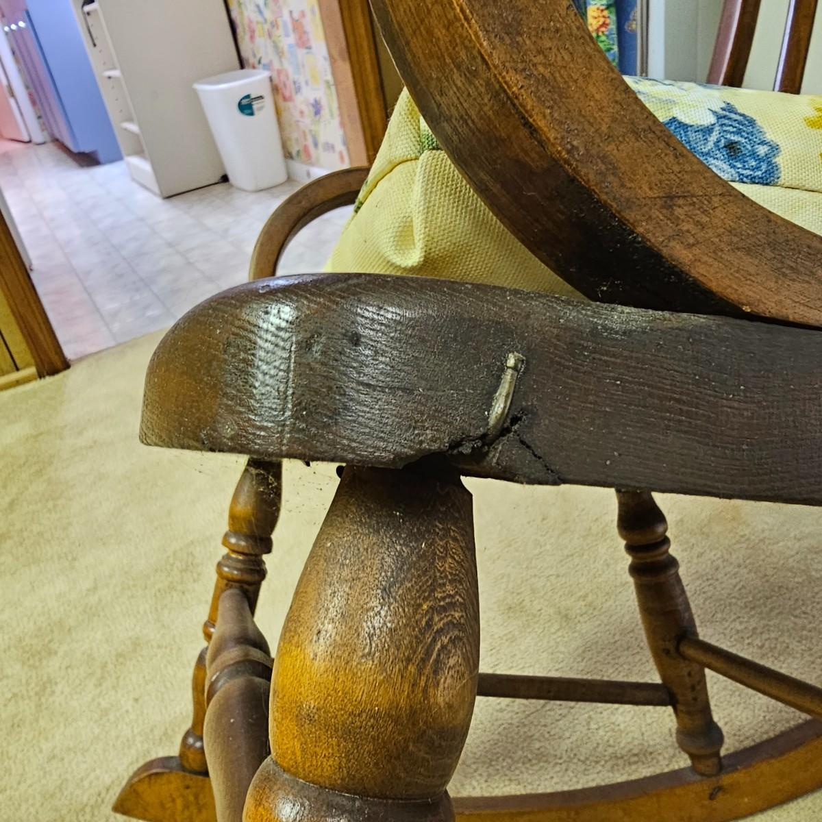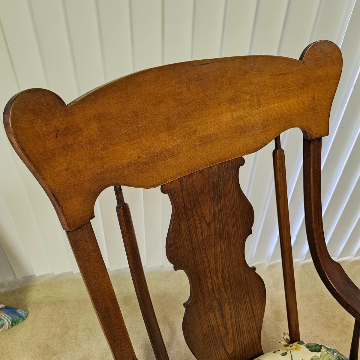 Nice, simple oak rocker with solid seat and cushion. Appears to also have other solid woods in its construction, and possibly hand forged hardware. Chair measures 23.5" x 33" x 39" H and has a 16" seat height. Curved arms with apindle supports. See photos for details. Local pickup only.