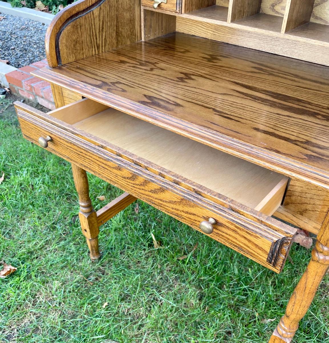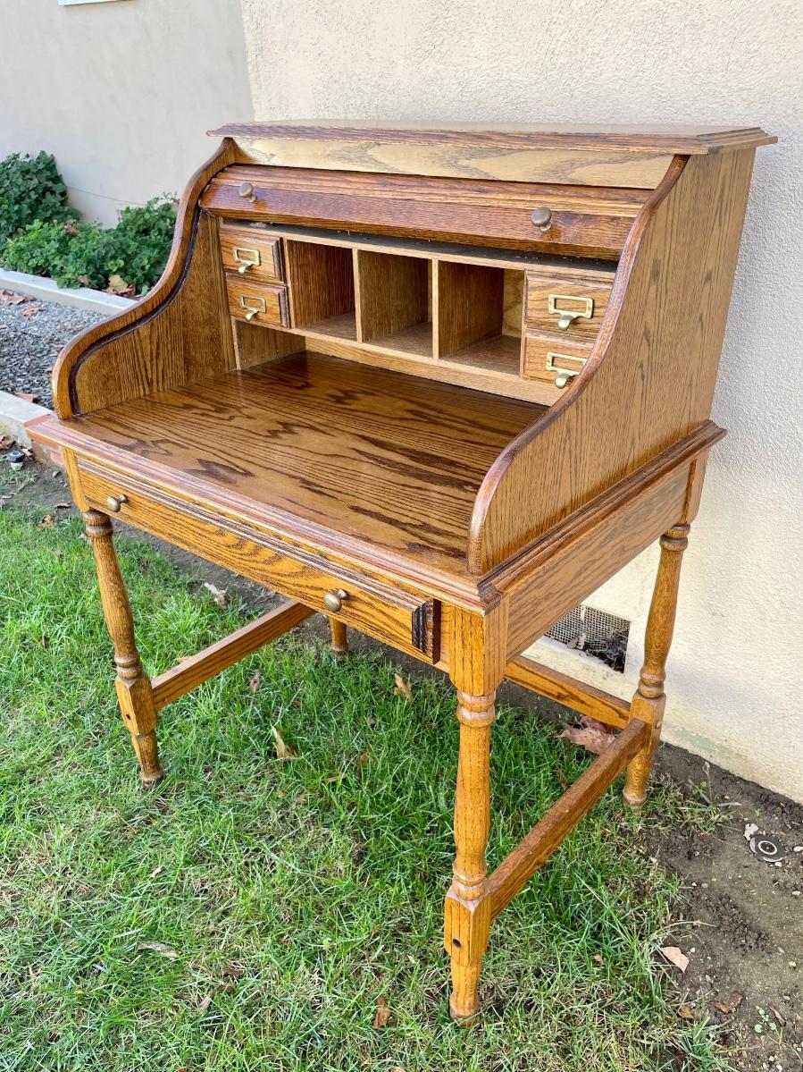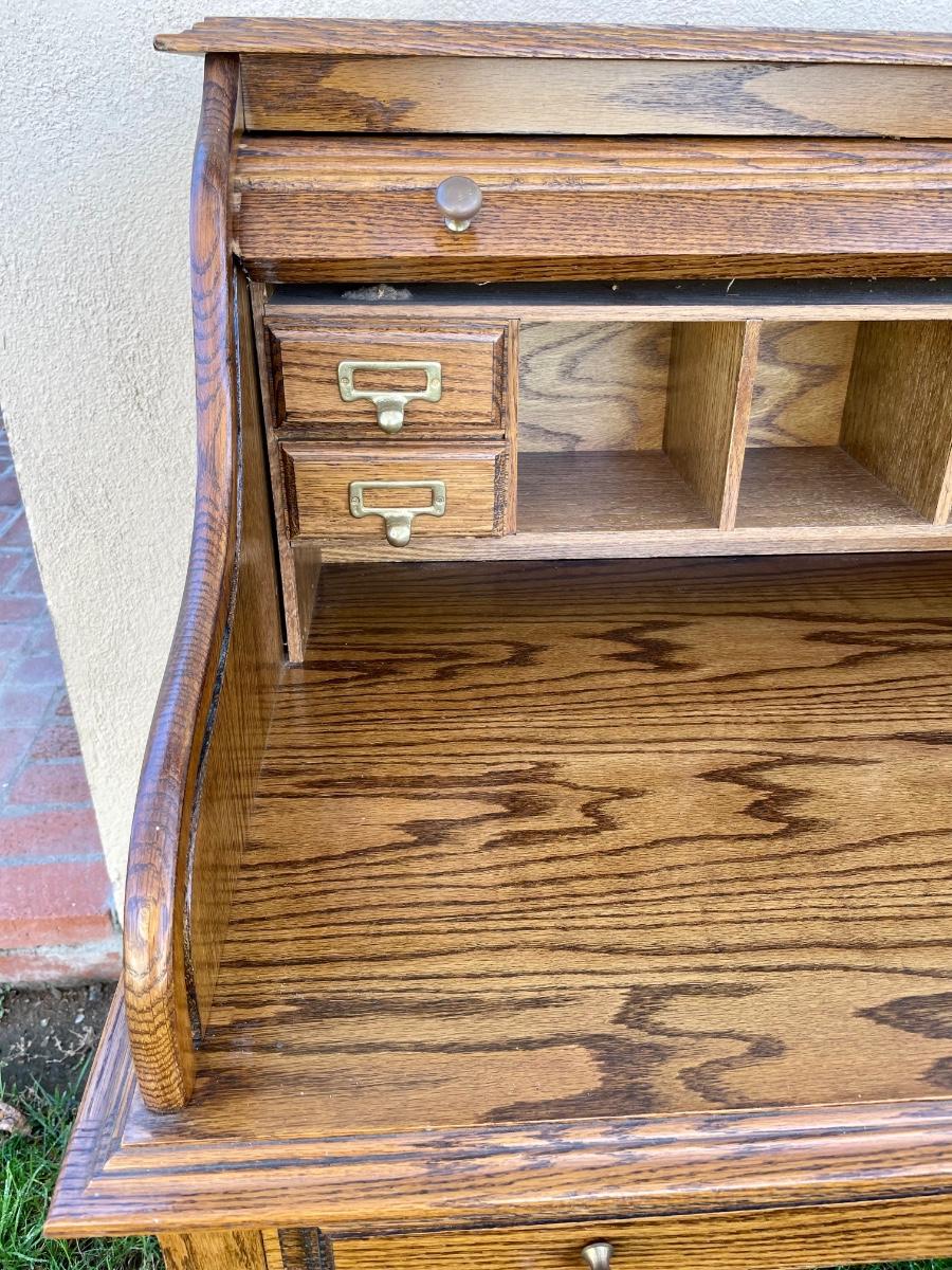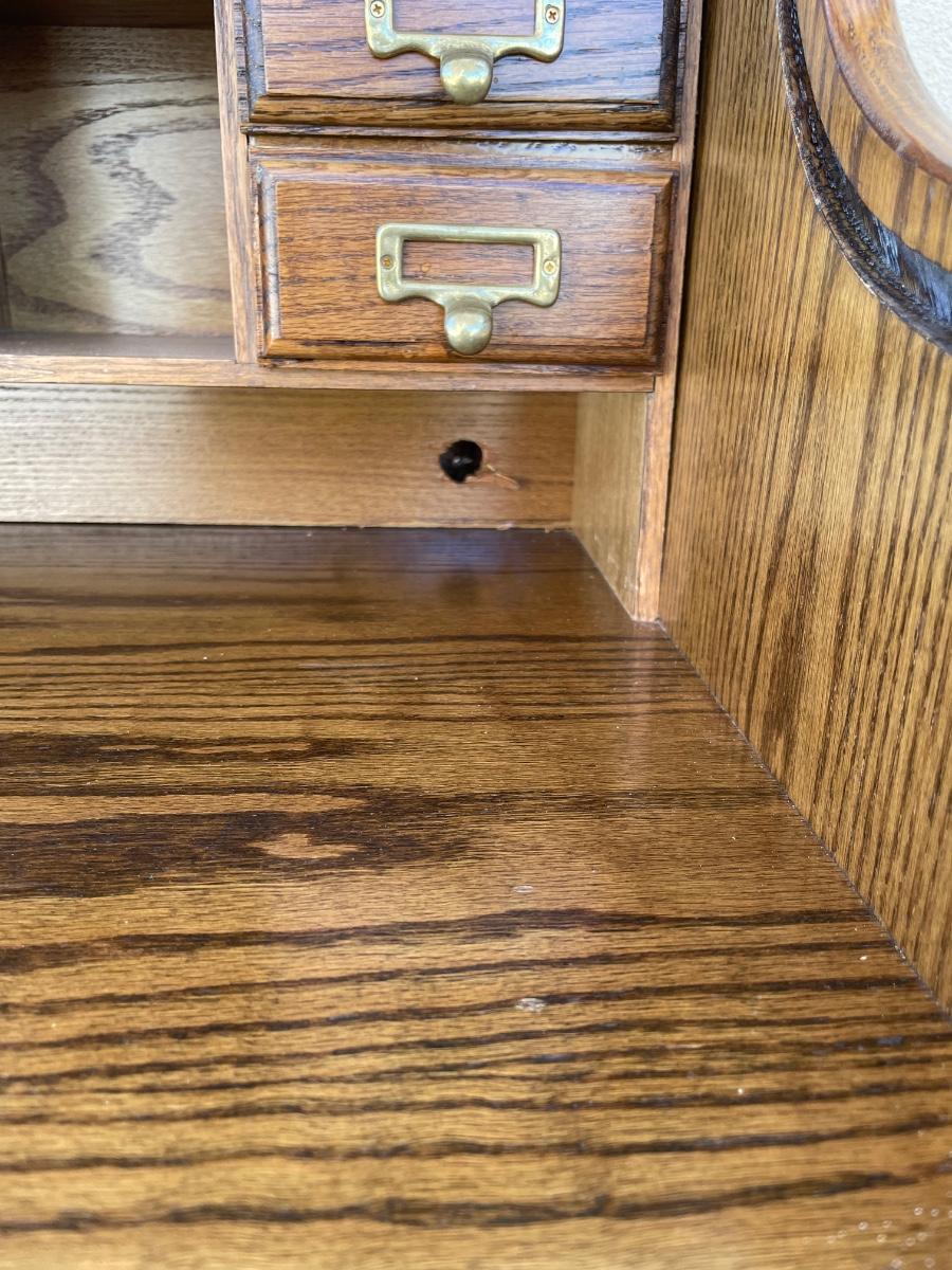 Oak Roll Top Desk, 33” wide x24” deep x 44” tall. Was used as a computer desk, small hole was drilled on the right side (see photos) which caused some damage to the top right corner of the roll top, only visible when to top is fully closed.