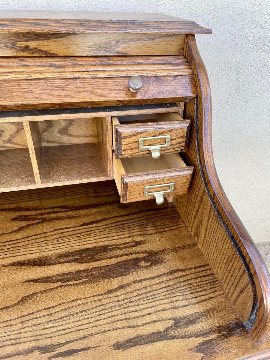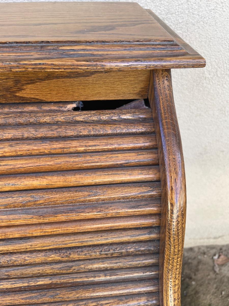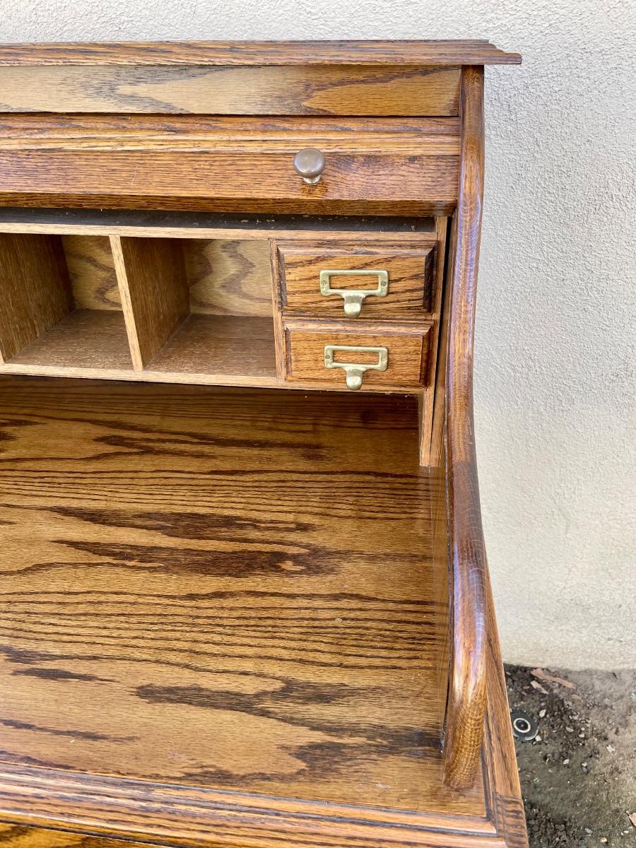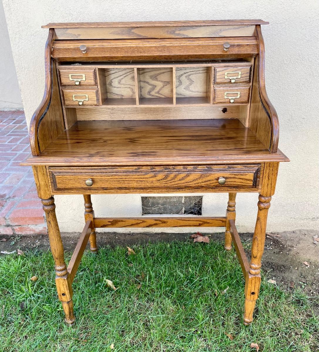 Oak Roll Top Desk, 33” wide x24” deep x 44” tall. Was used as a computer desk, small hole was drilled on the right side (see photos) which caused some damage to the top right corner of the roll top, only visible when to top is fully closed.