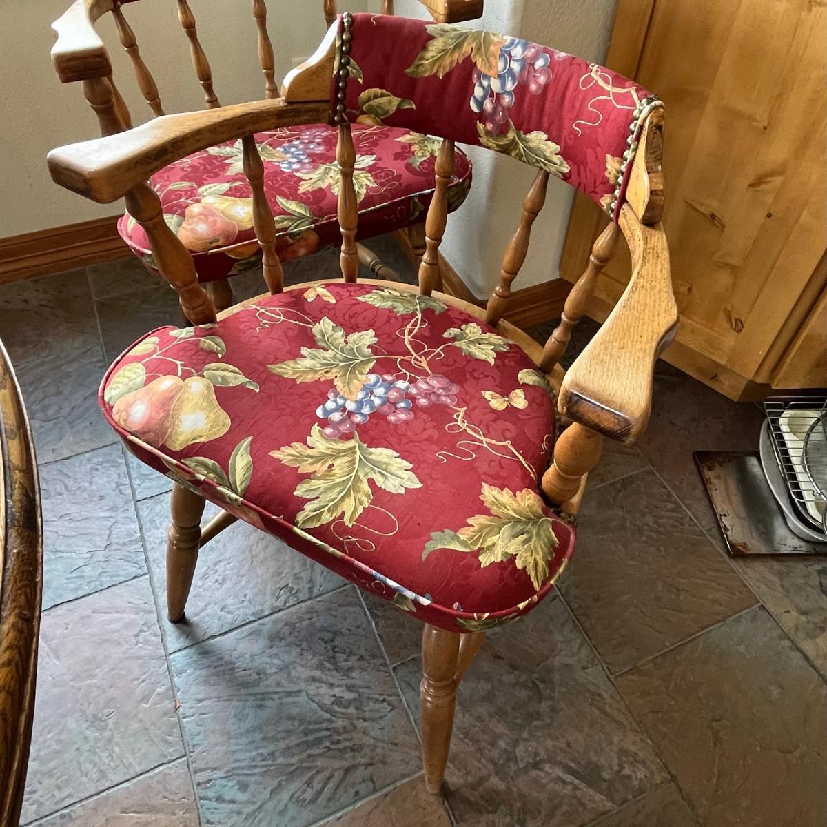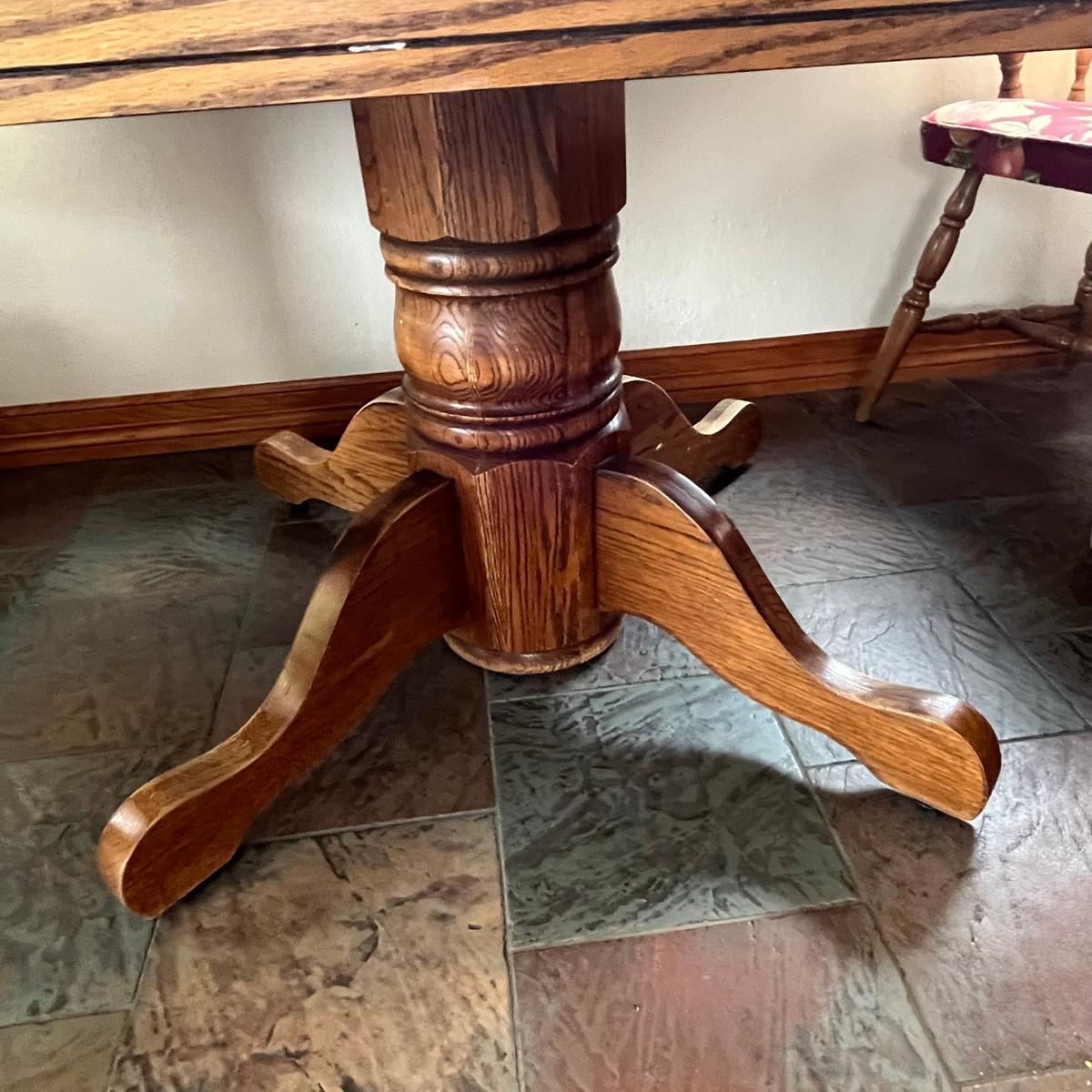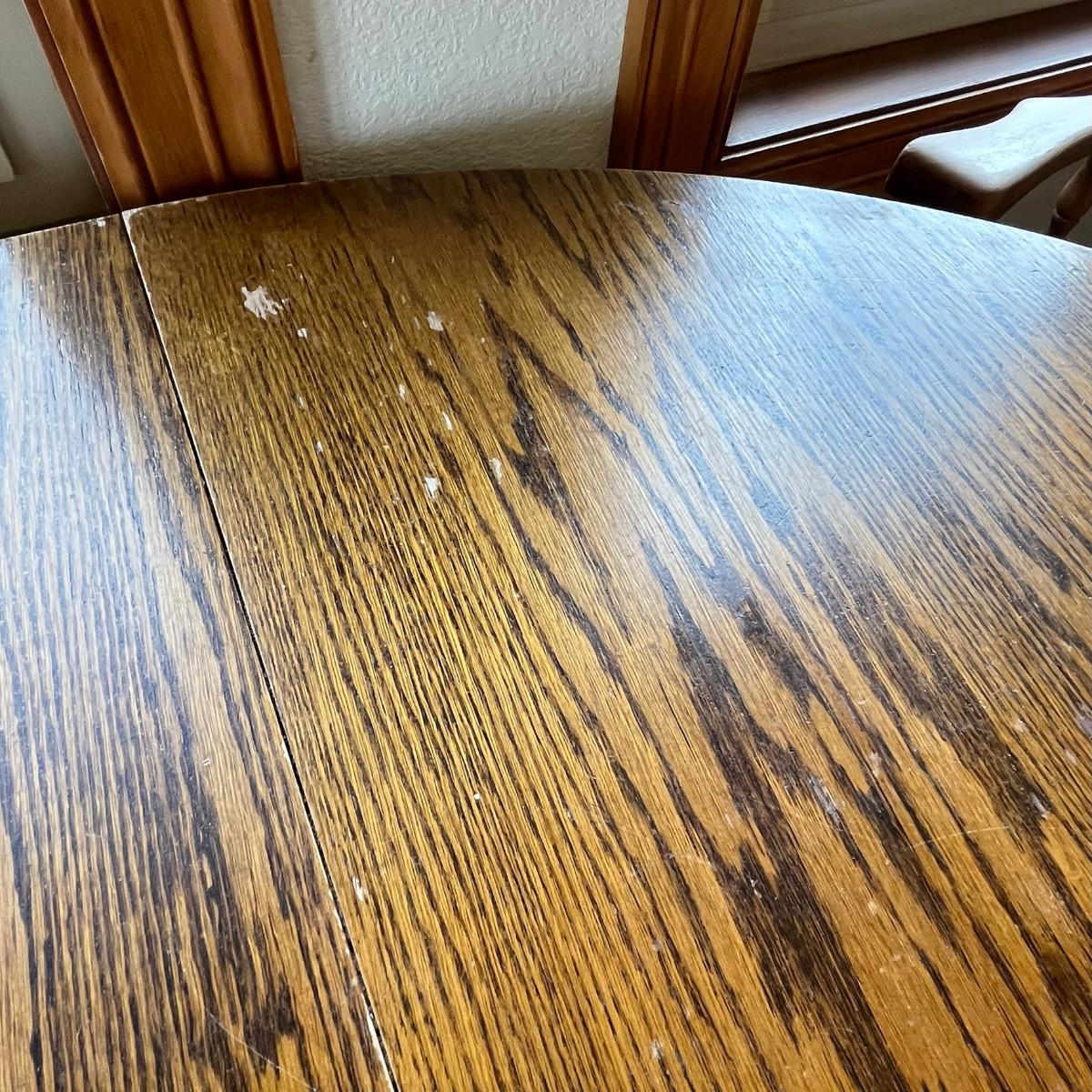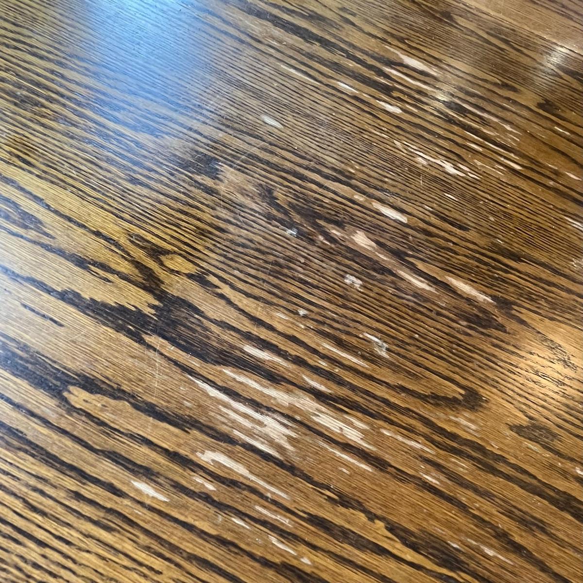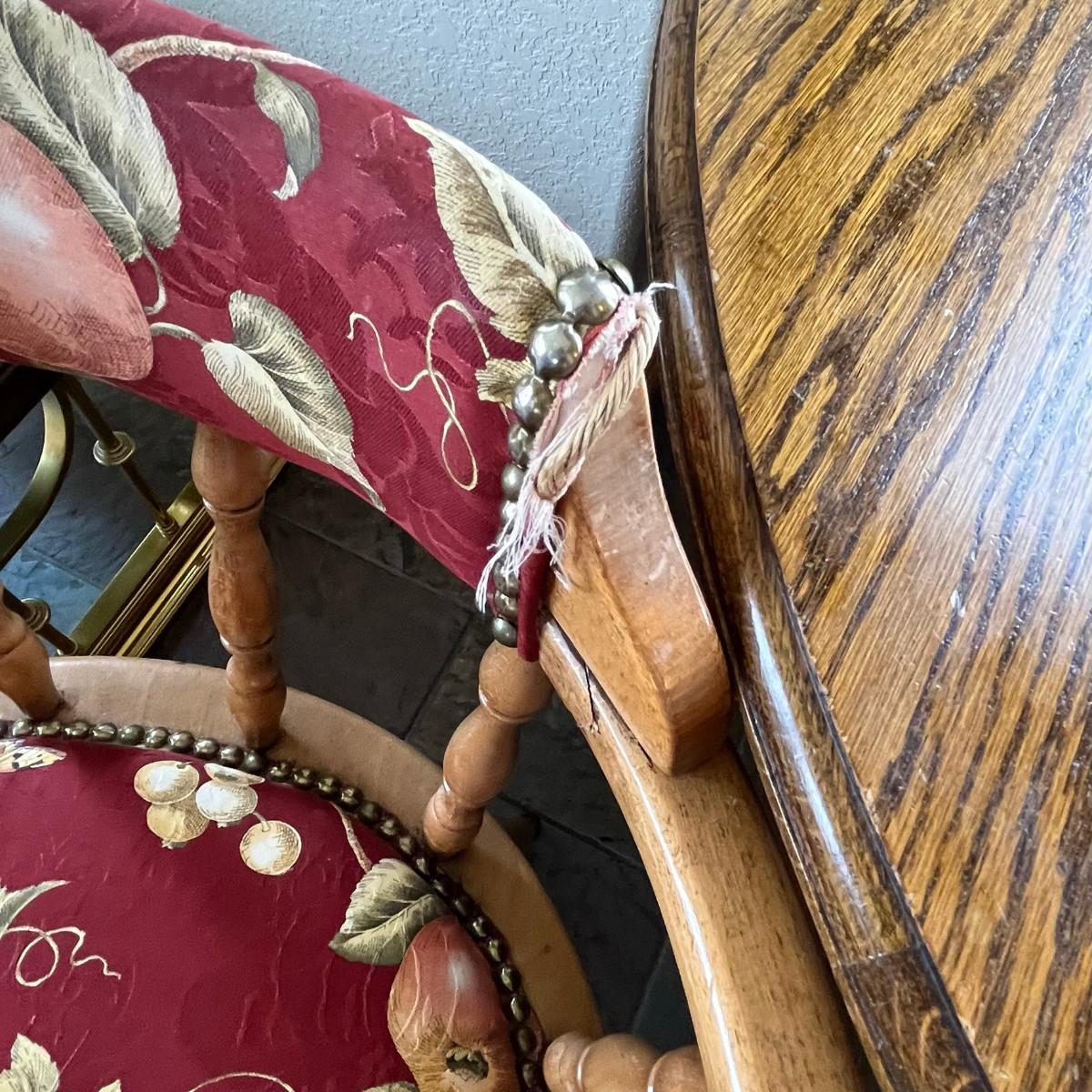 There is some wear to the finish on the table top. Plus the chairs all have upholstery issues. Still a nice set to use as a daily use or beginning set.