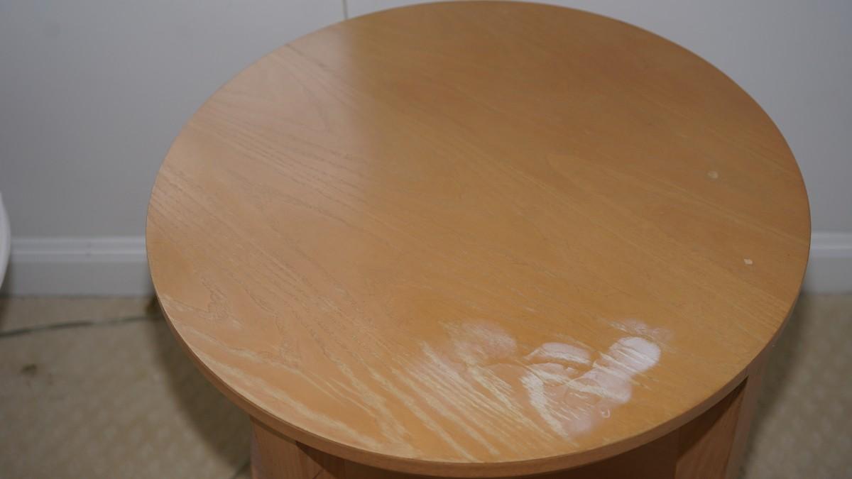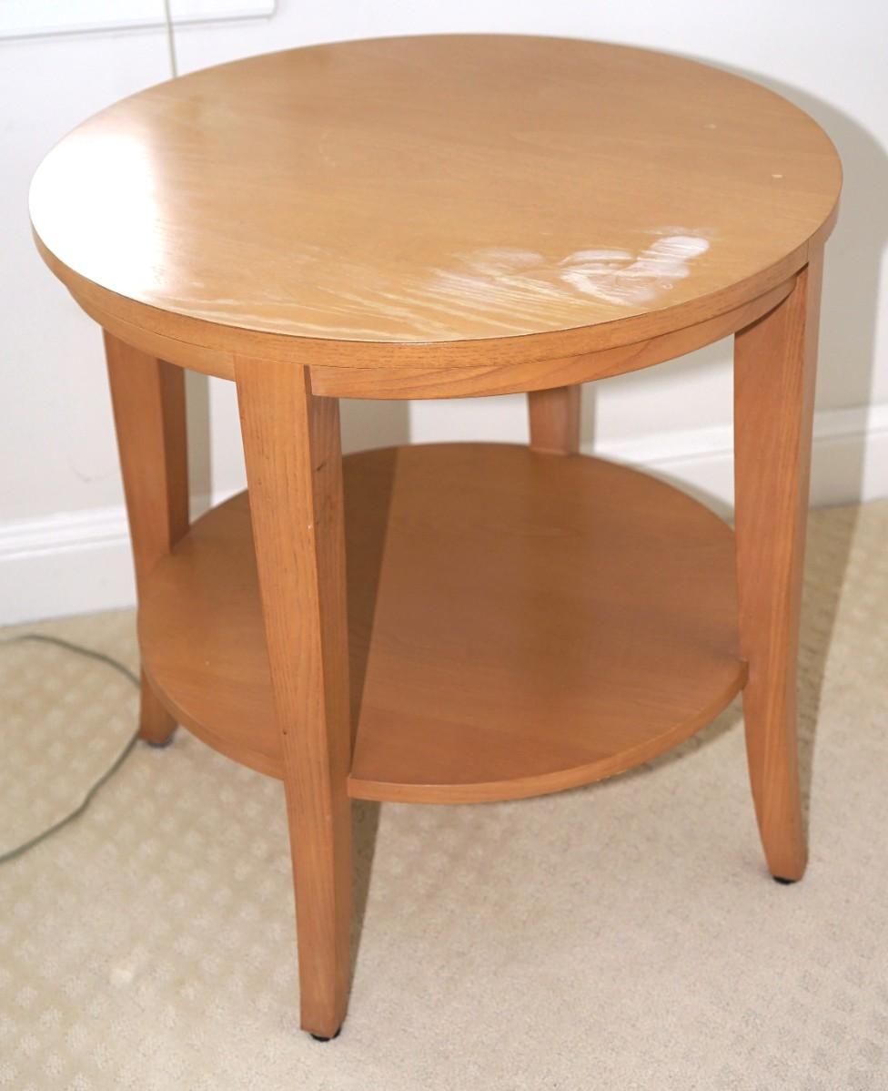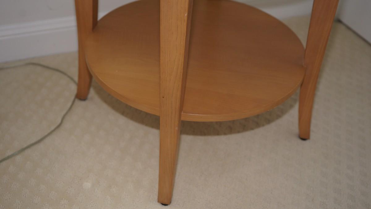 OAK ROUND TOP END TABLE. WITH SHELF BELOW