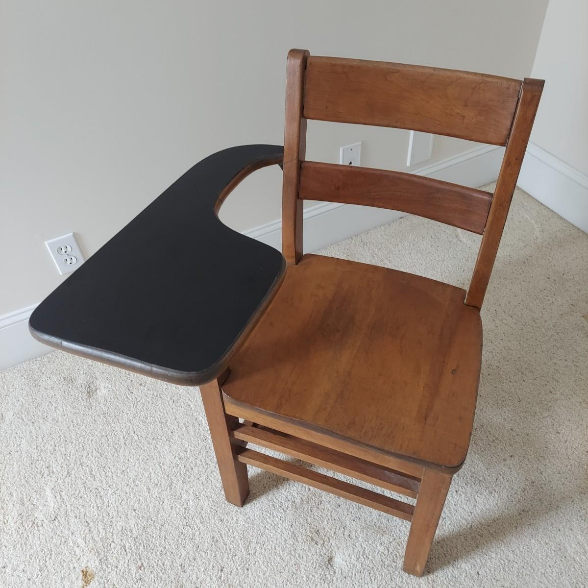 Lot includes an oak school chair with attached writing desk. Piece measures 24” x 25.5” x 32.5”H with a 17” seat height. Writing desk has names that have been carved in, see pictures.