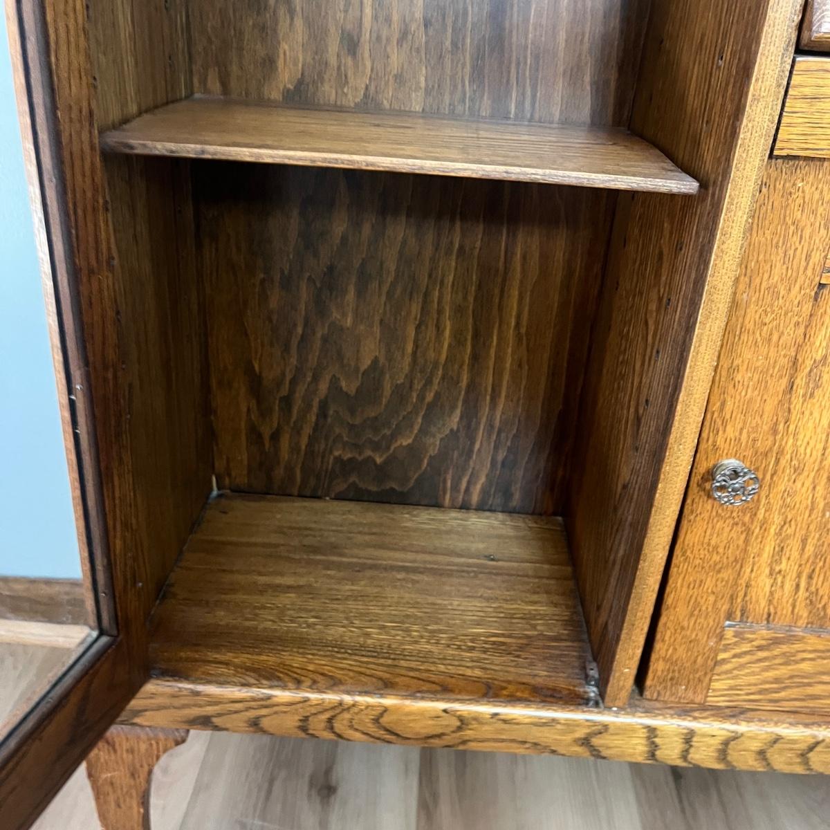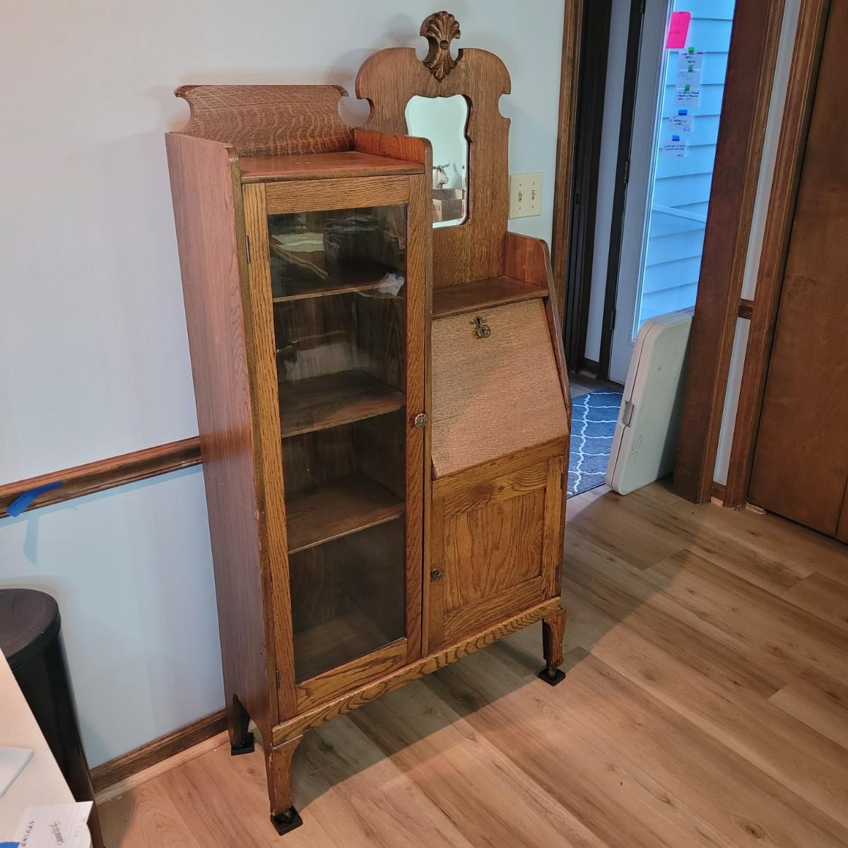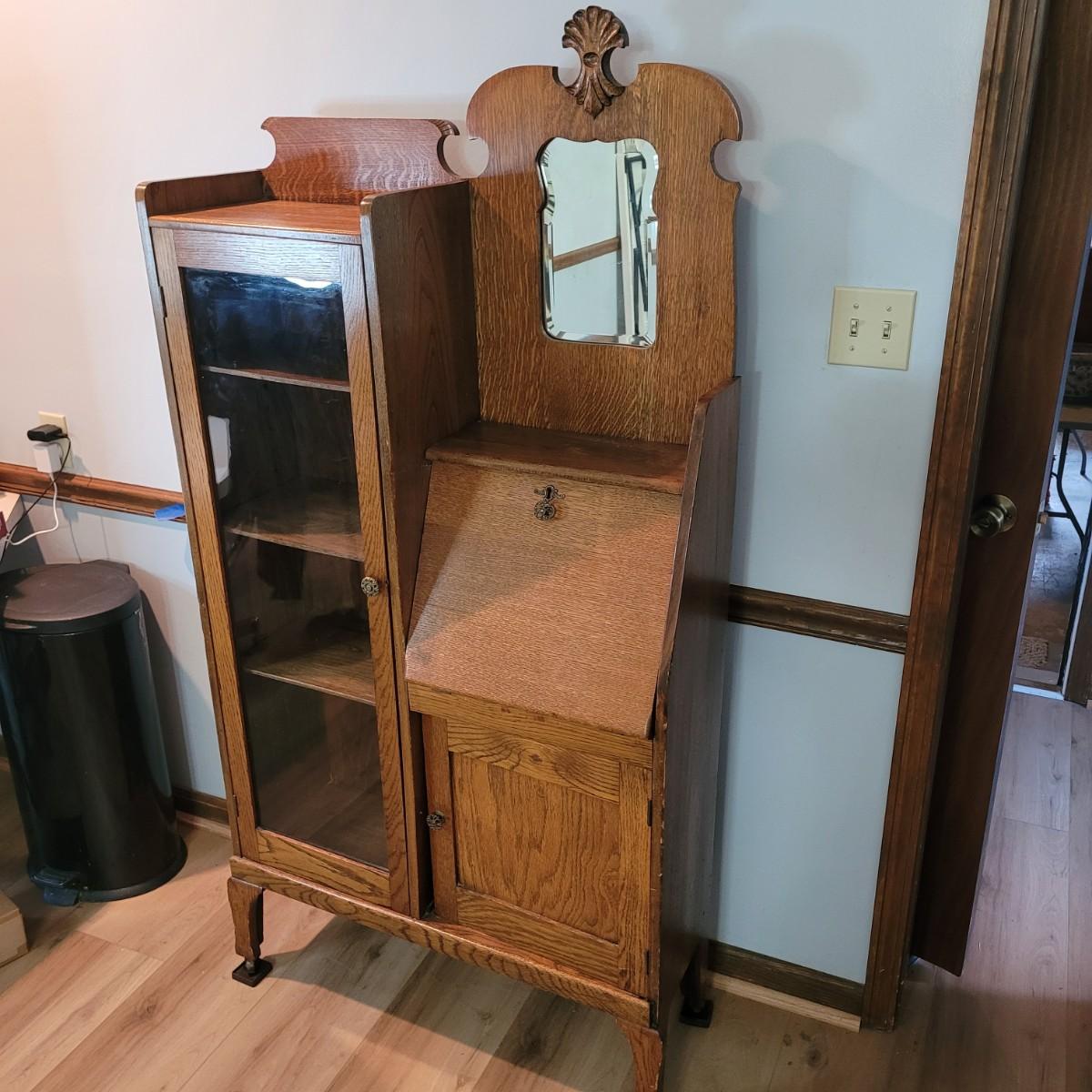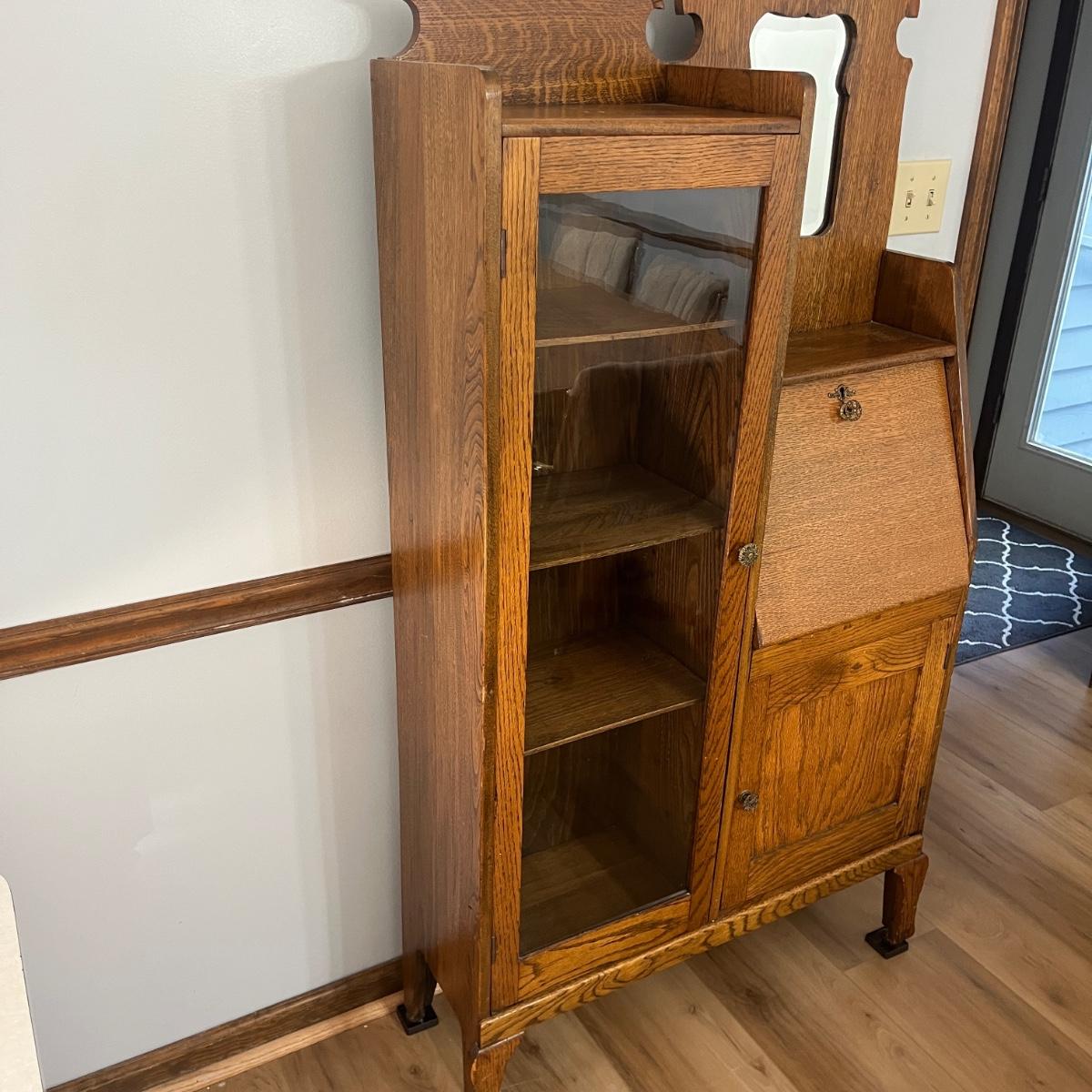 Lot includes an oak secretary with glass door cabinet with three adjustable shelves and a cabinet underneath the breakfront desk. Also has a Beveled mirror and casters. Metal hinge inside right cabinet is detached and not working correctly. See photos. Secretary measures 33” x 11” x 66”H. Secretary has scratches, nicks and the back is loose, see pictures. No key included for breakfront lock.