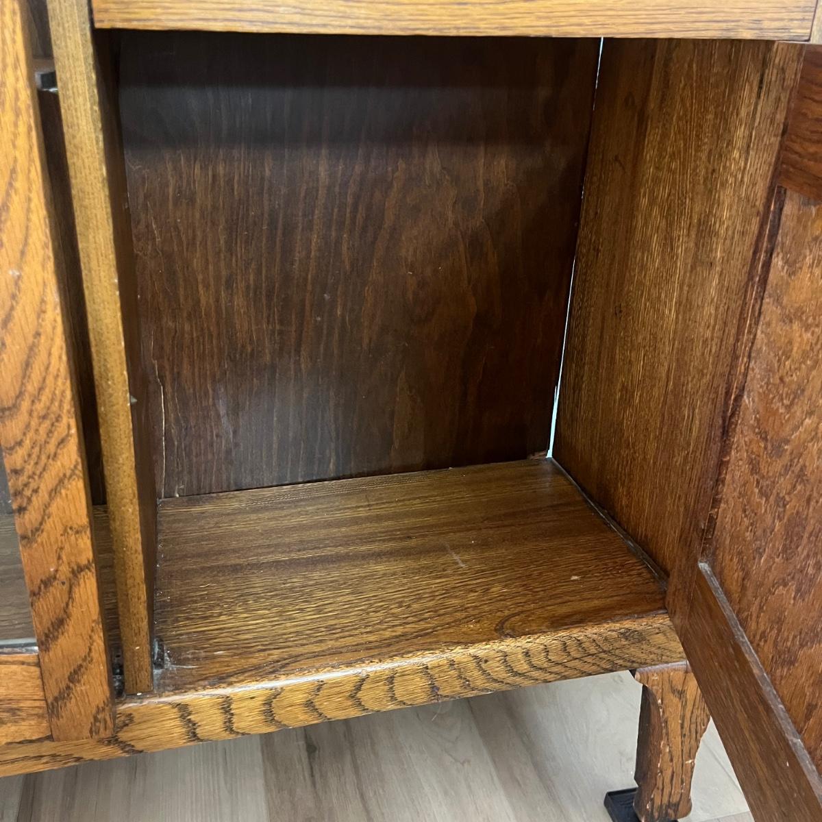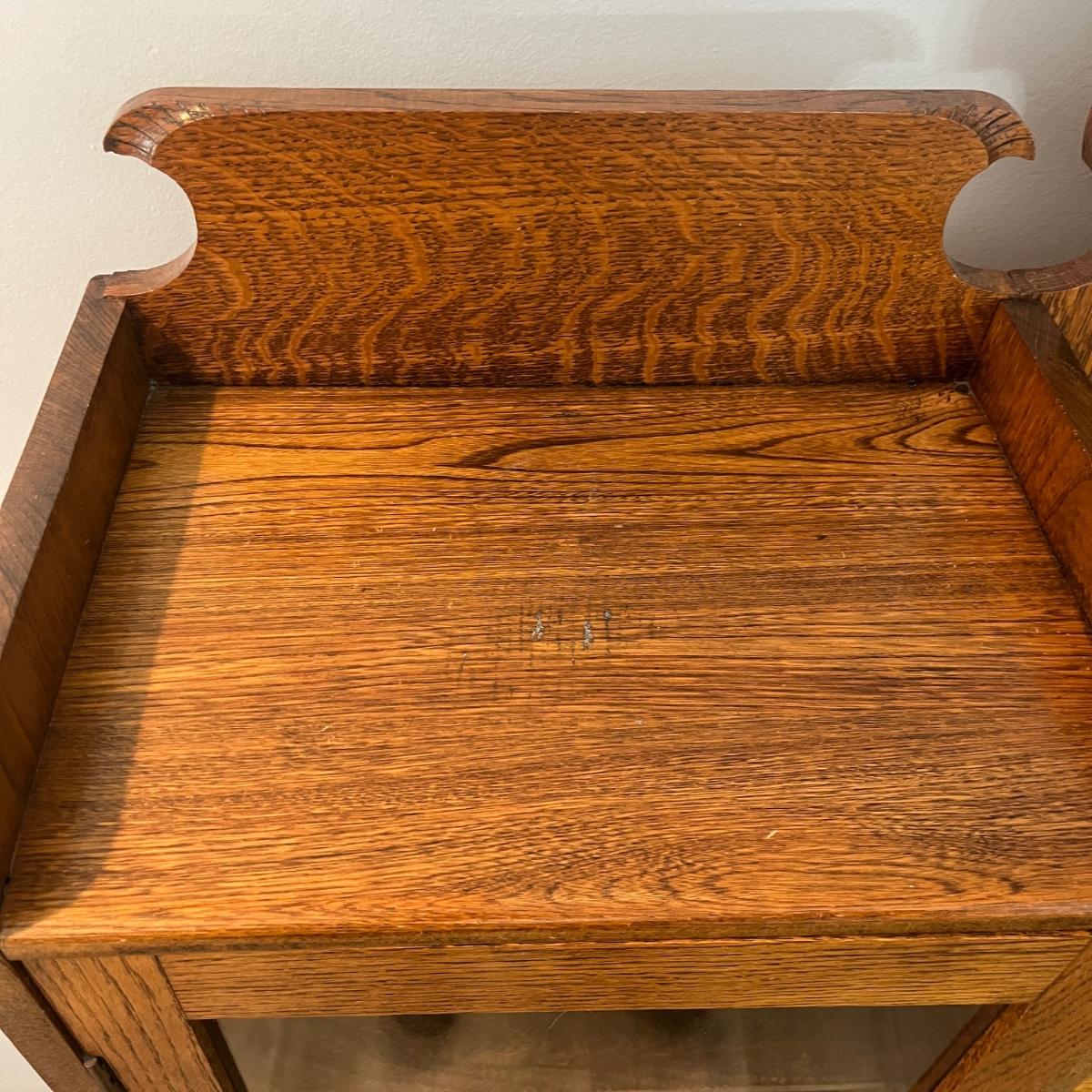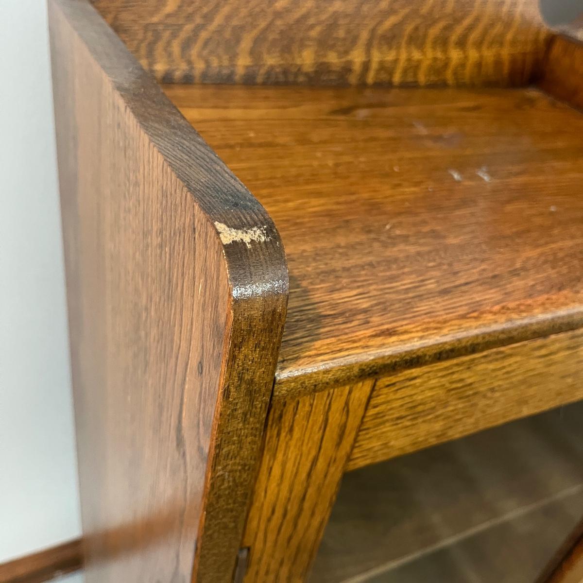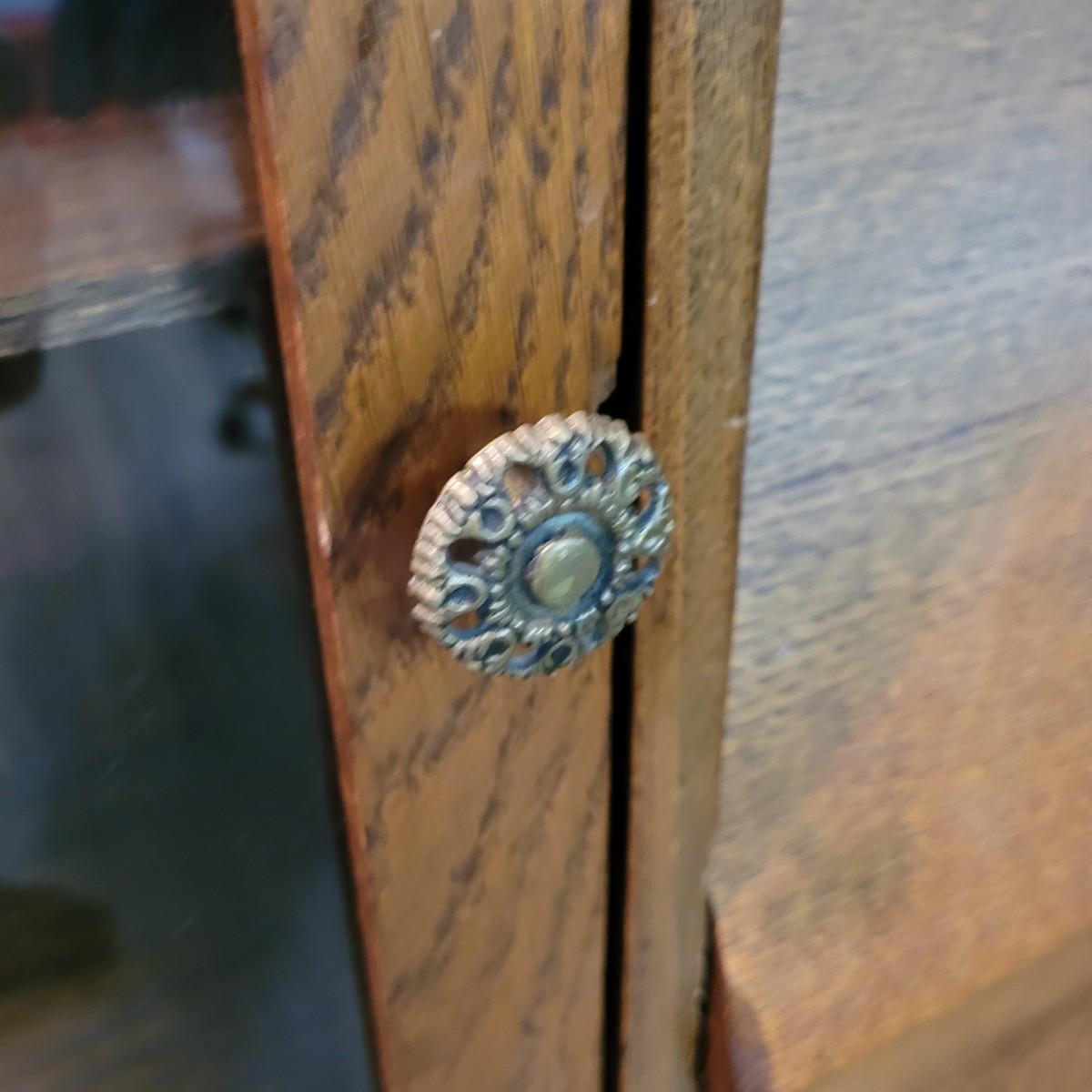 Lot includes an oak secretary with glass door cabinet with three adjustable shelves and a cabinet underneath the breakfront desk. Also has a Beveled mirror and casters. Metal hinge inside right cabinet is detached and not working correctly. See photos. Secretary measures 33” x 11” x 66”H. Secretary has scratches, nicks and the back is loose, see pictures. No key included for breakfront lock.