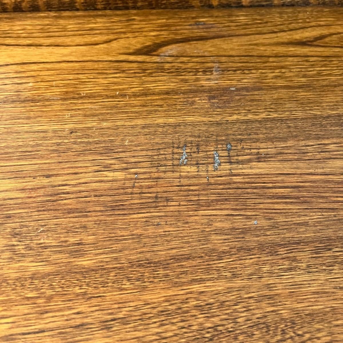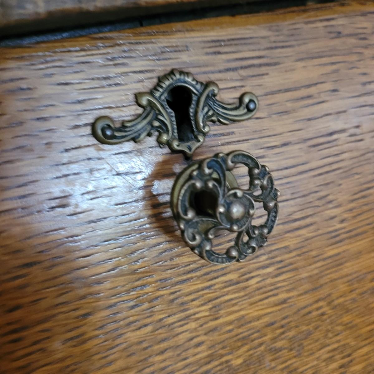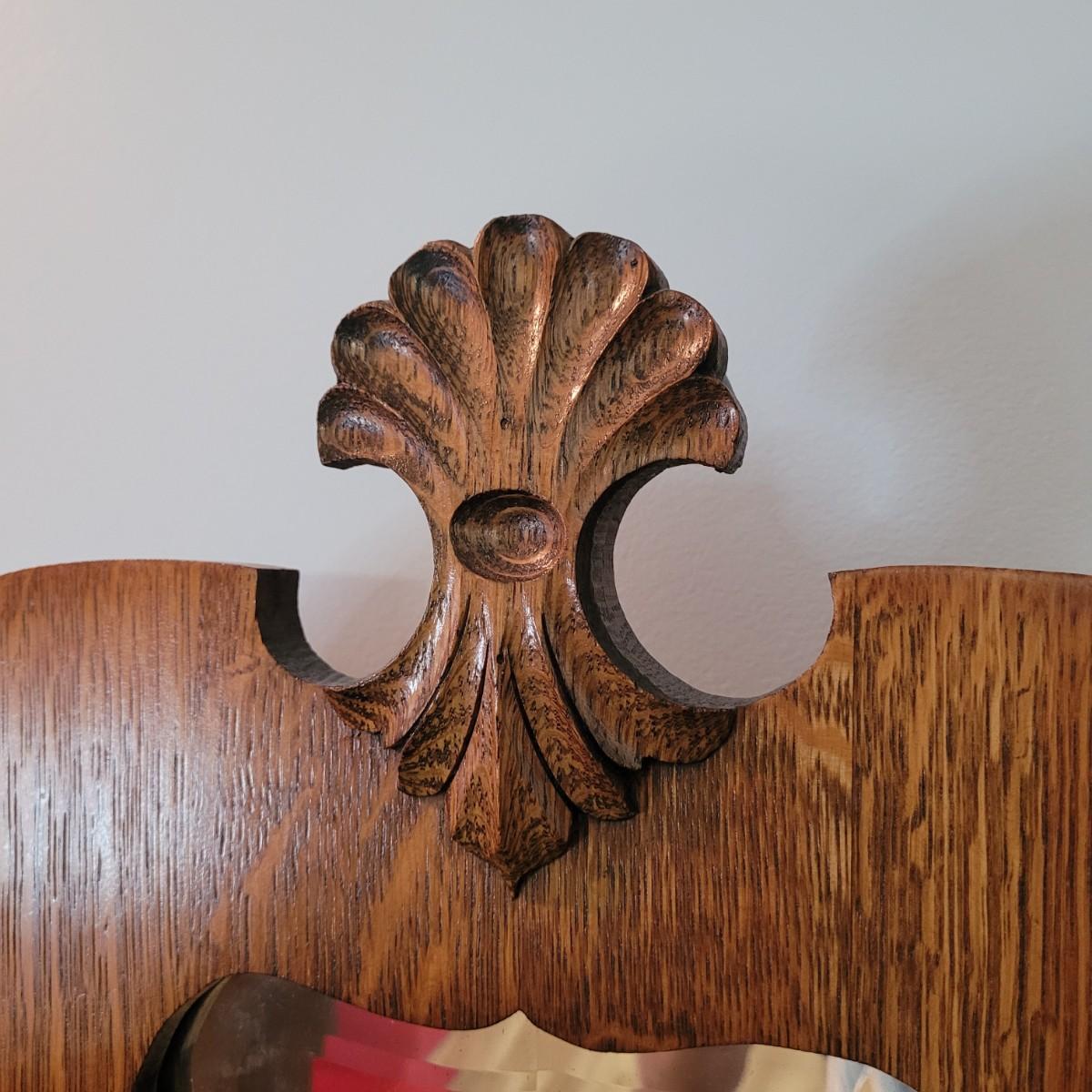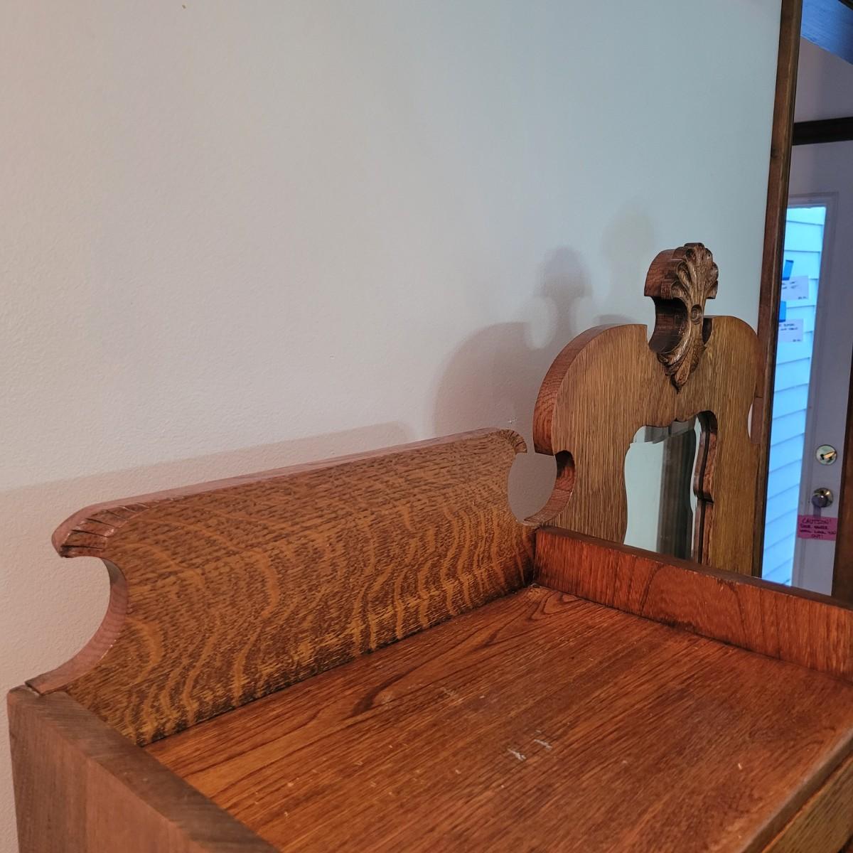 Lot includes an oak secretary with glass door cabinet with three adjustable shelves and a cabinet underneath the breakfront desk. Also has a Beveled mirror and casters. Metal hinge inside right cabinet is detached and not working correctly. See photos. Secretary measures 33” x 11” x 66”H. Secretary has scratches, nicks and the back is loose, see pictures. No key included for breakfront lock.