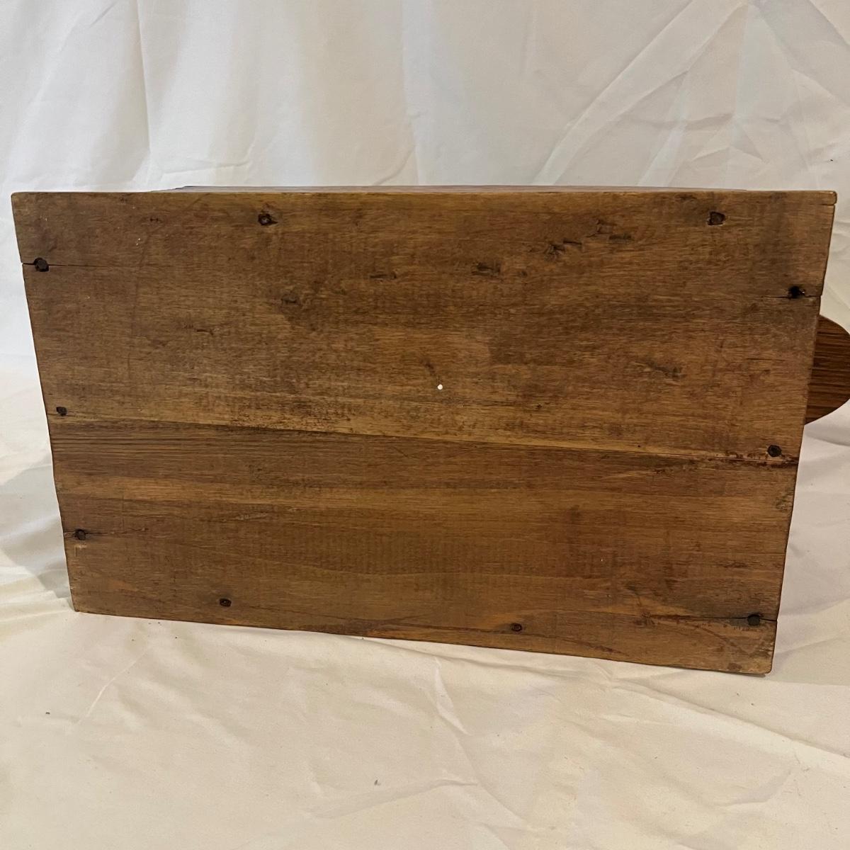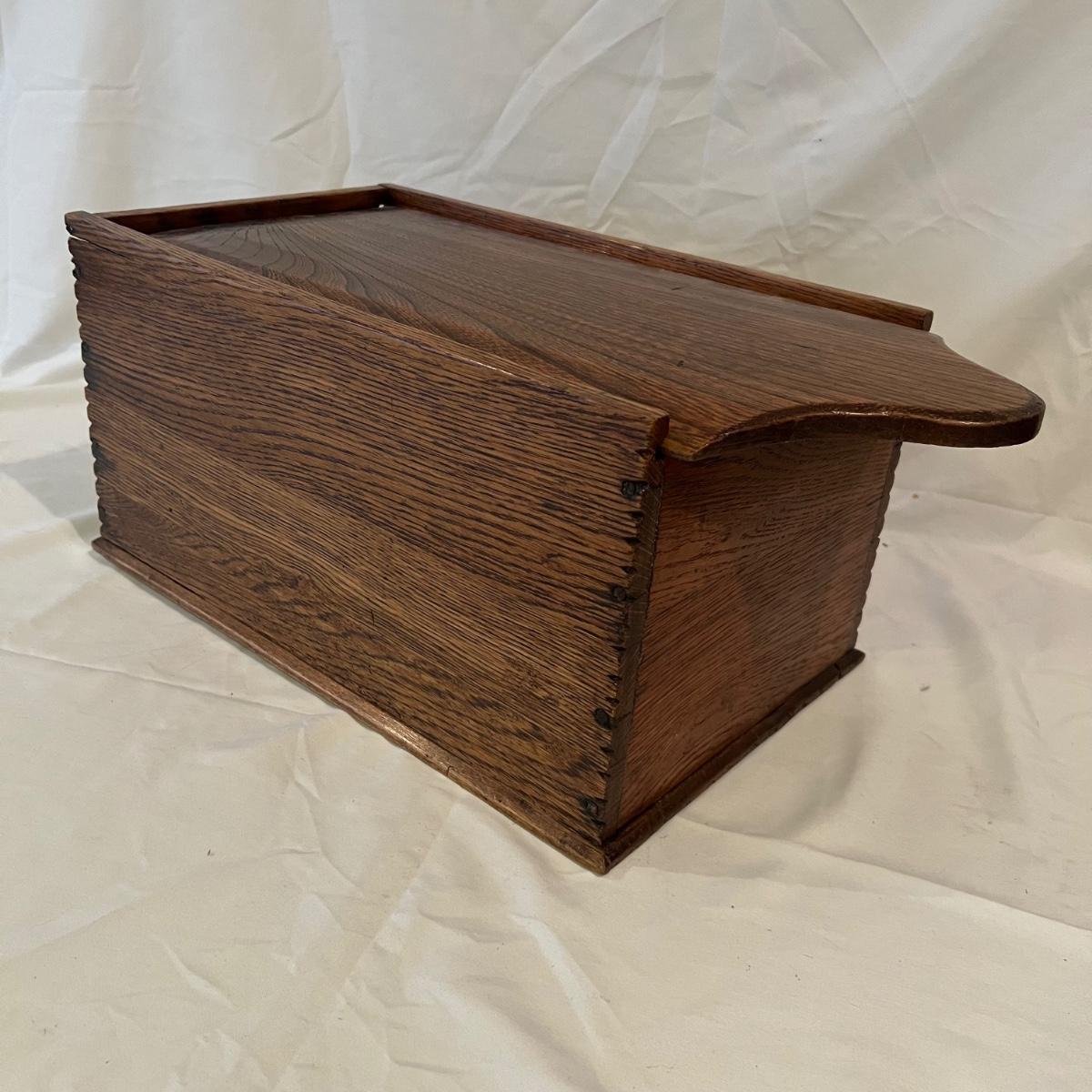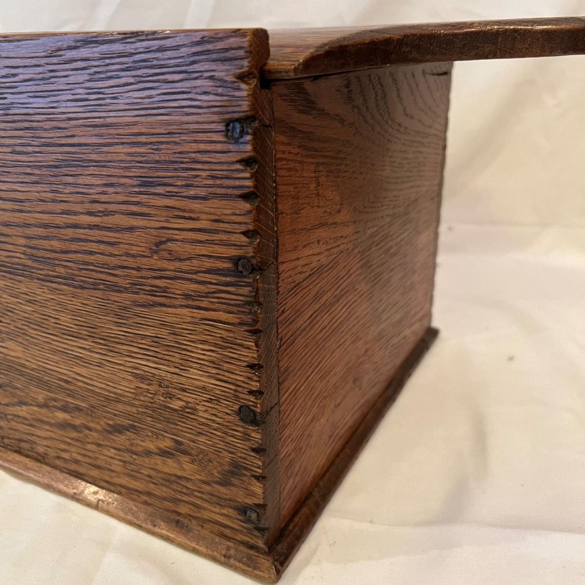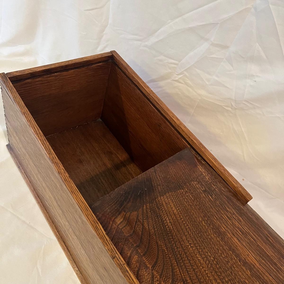 This solid oak box has a lid that slides smoothly to reveal a good sized space for storage; it measures 10” x 16” x 8”. Also includes a solid wood magazine rack with a floral motif. There are a few scuff marks show in an image.