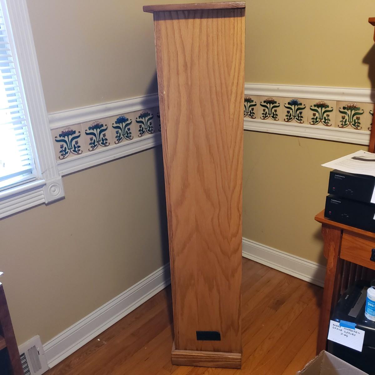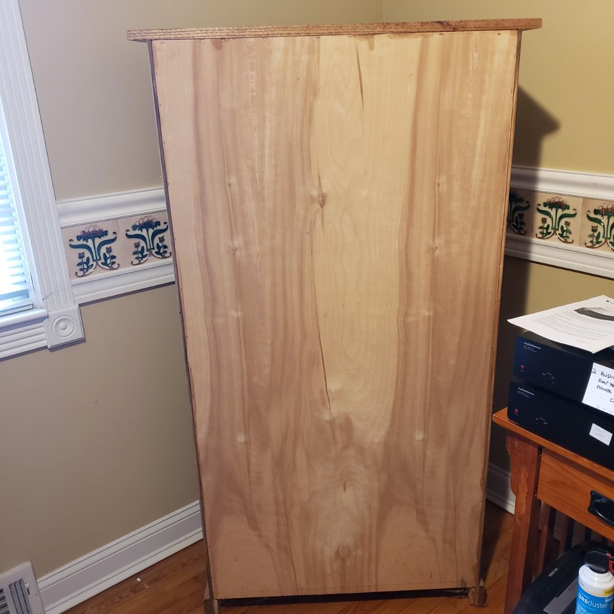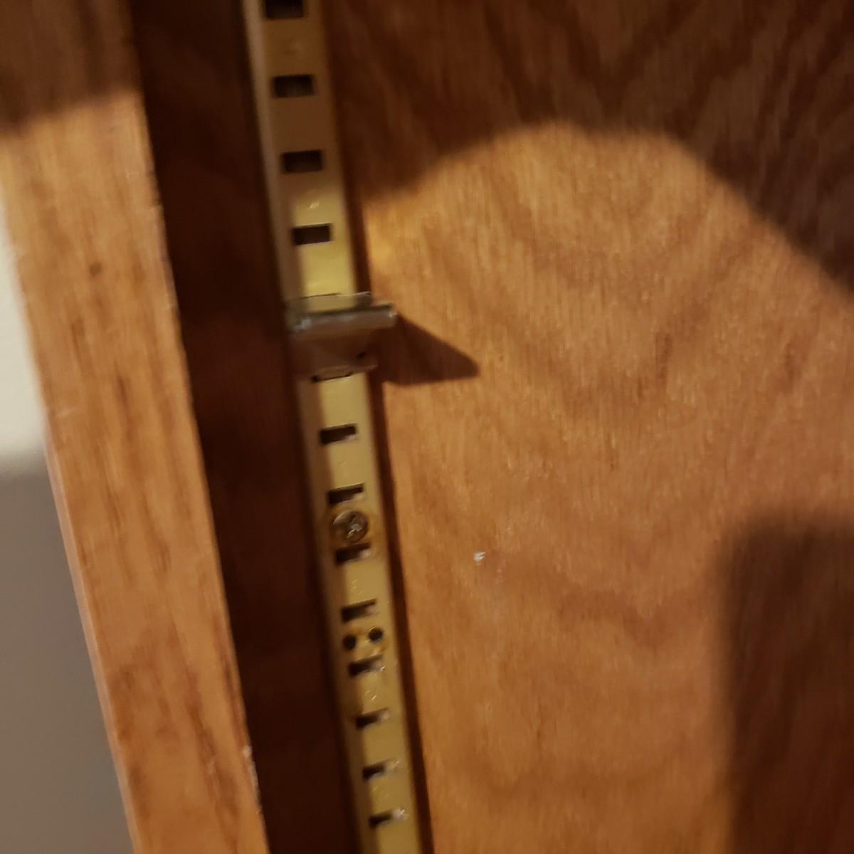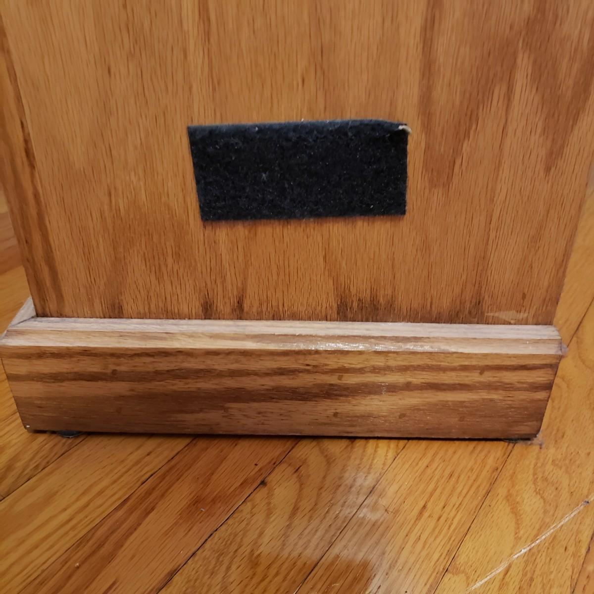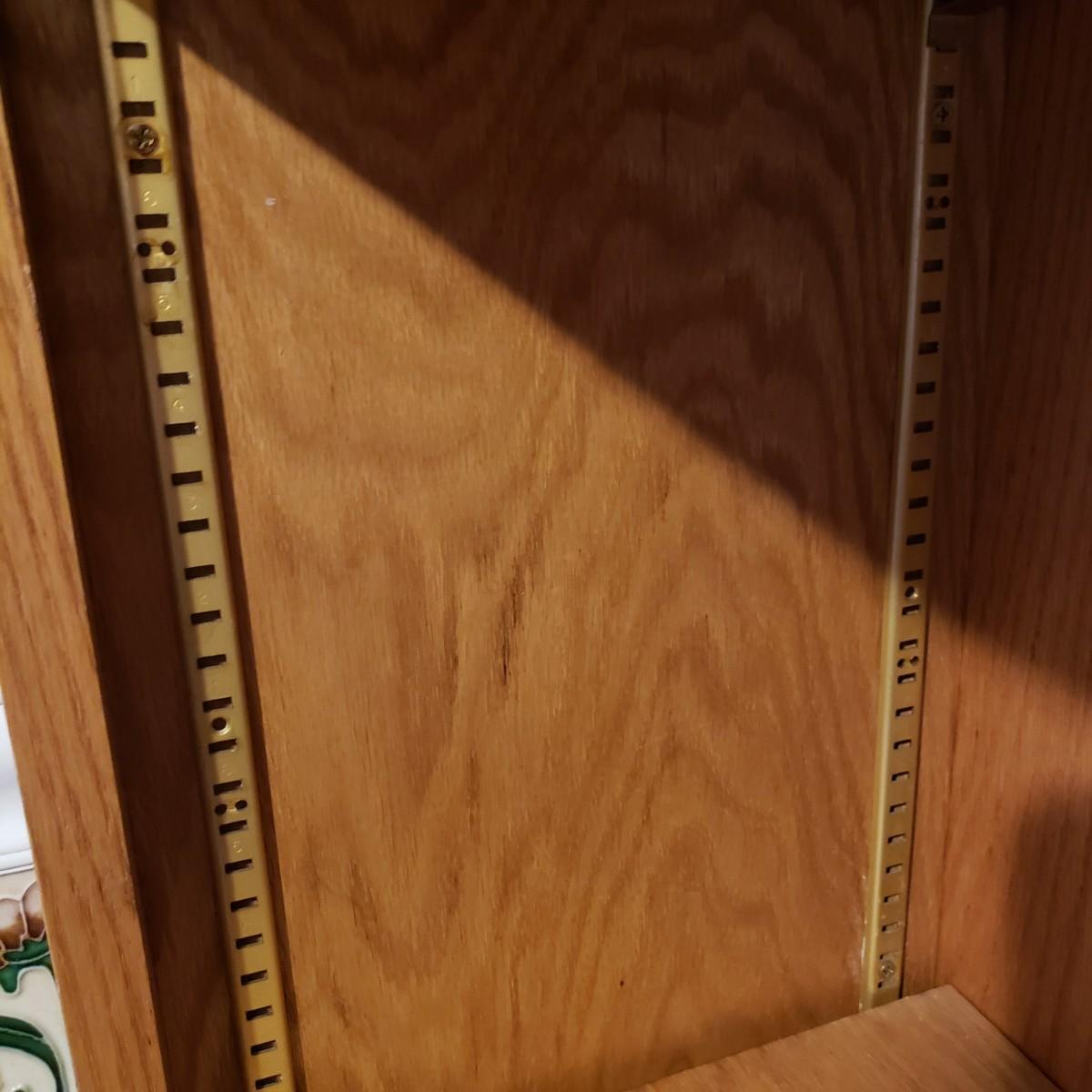 This Oak shelf measures 30" x 12" x 61"H. There are four shelves that are adjustable using shelf holders on the metal guides, see pictures. There is a velcro piece stuck on the bottom outside, see picture. The wood backing is nailed on.