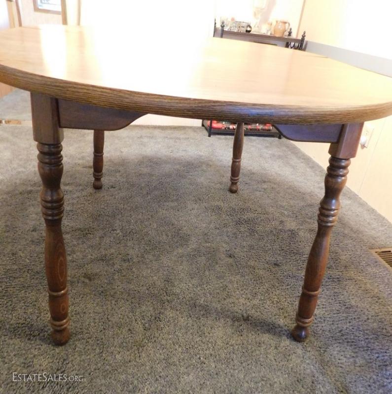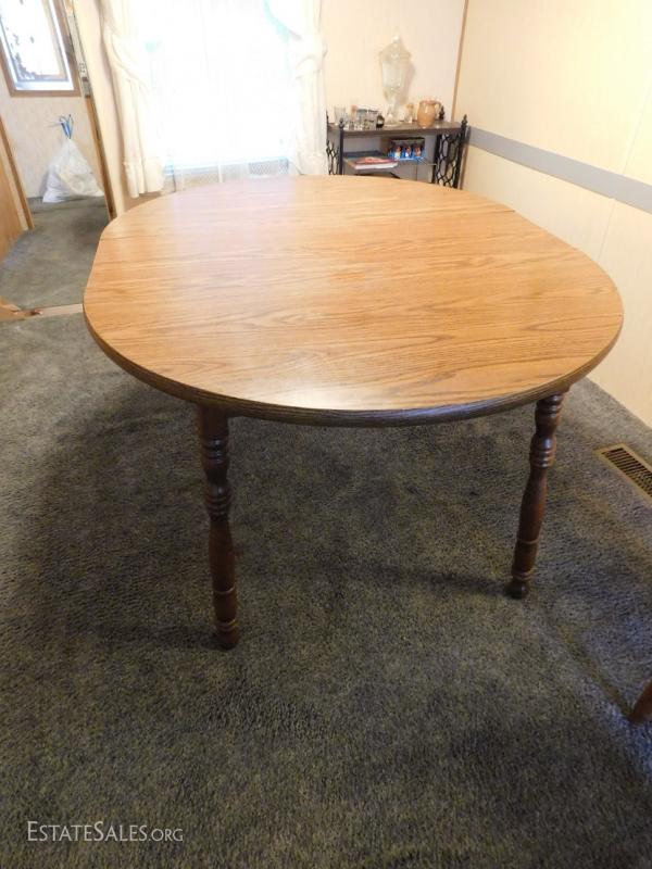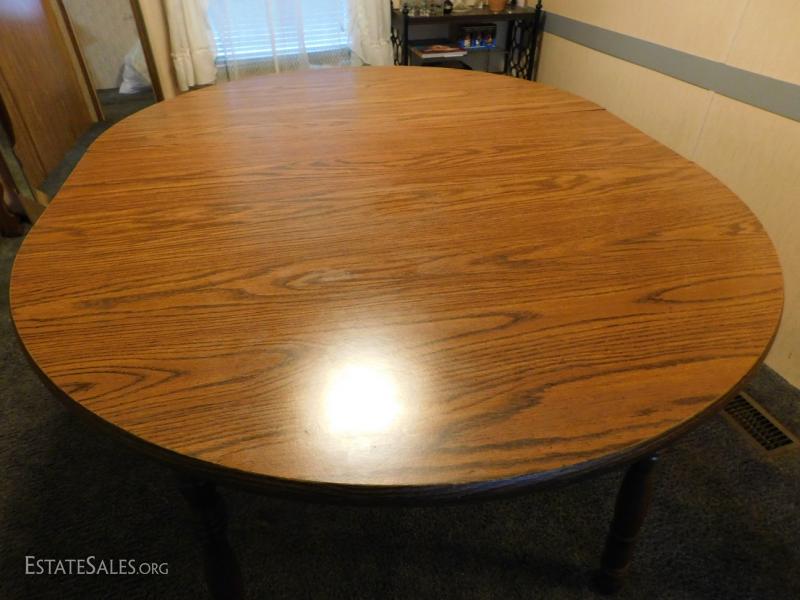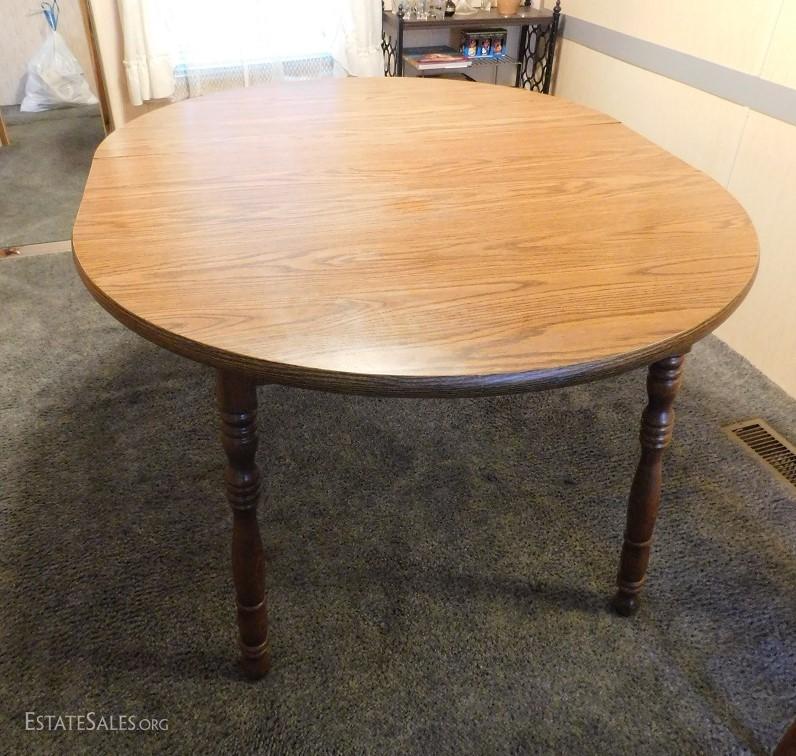 Oak Table with Leaf Insert 4' Diameter without leaf adds 18" with leaf. Seems to be sturdy and has some minor scratches and wear but overall nice piece.