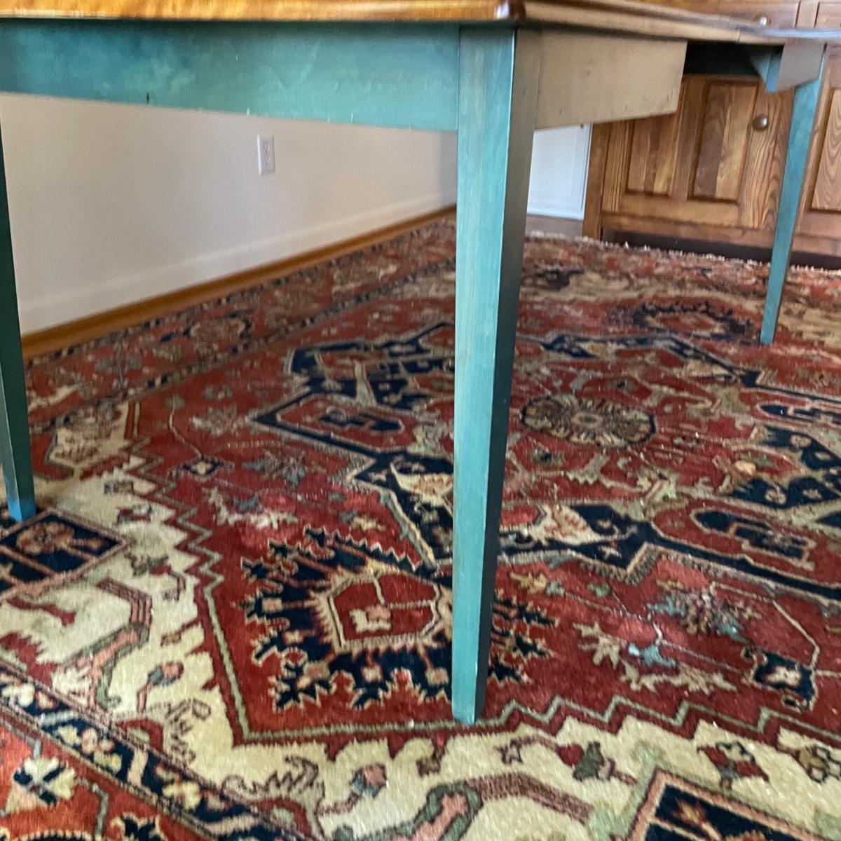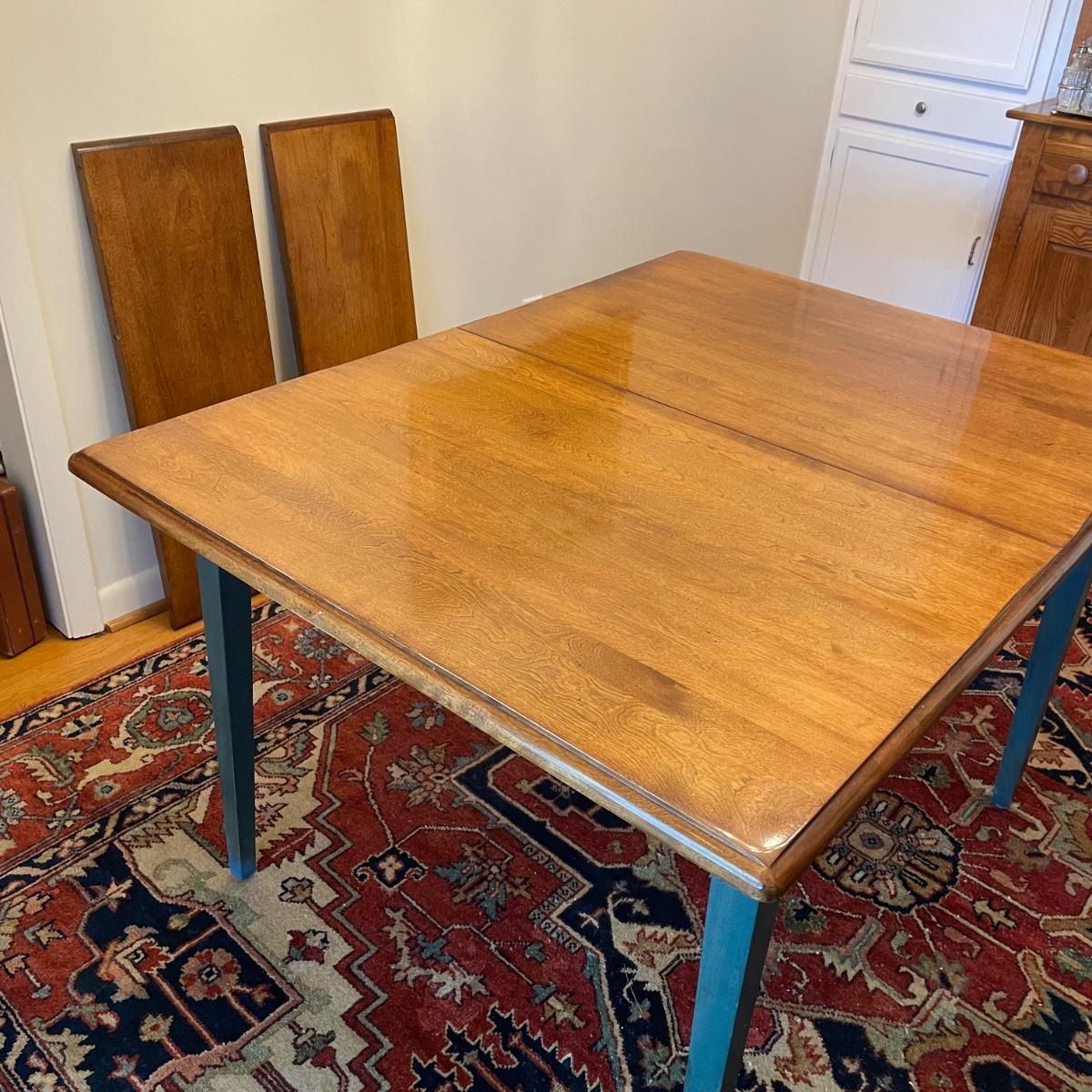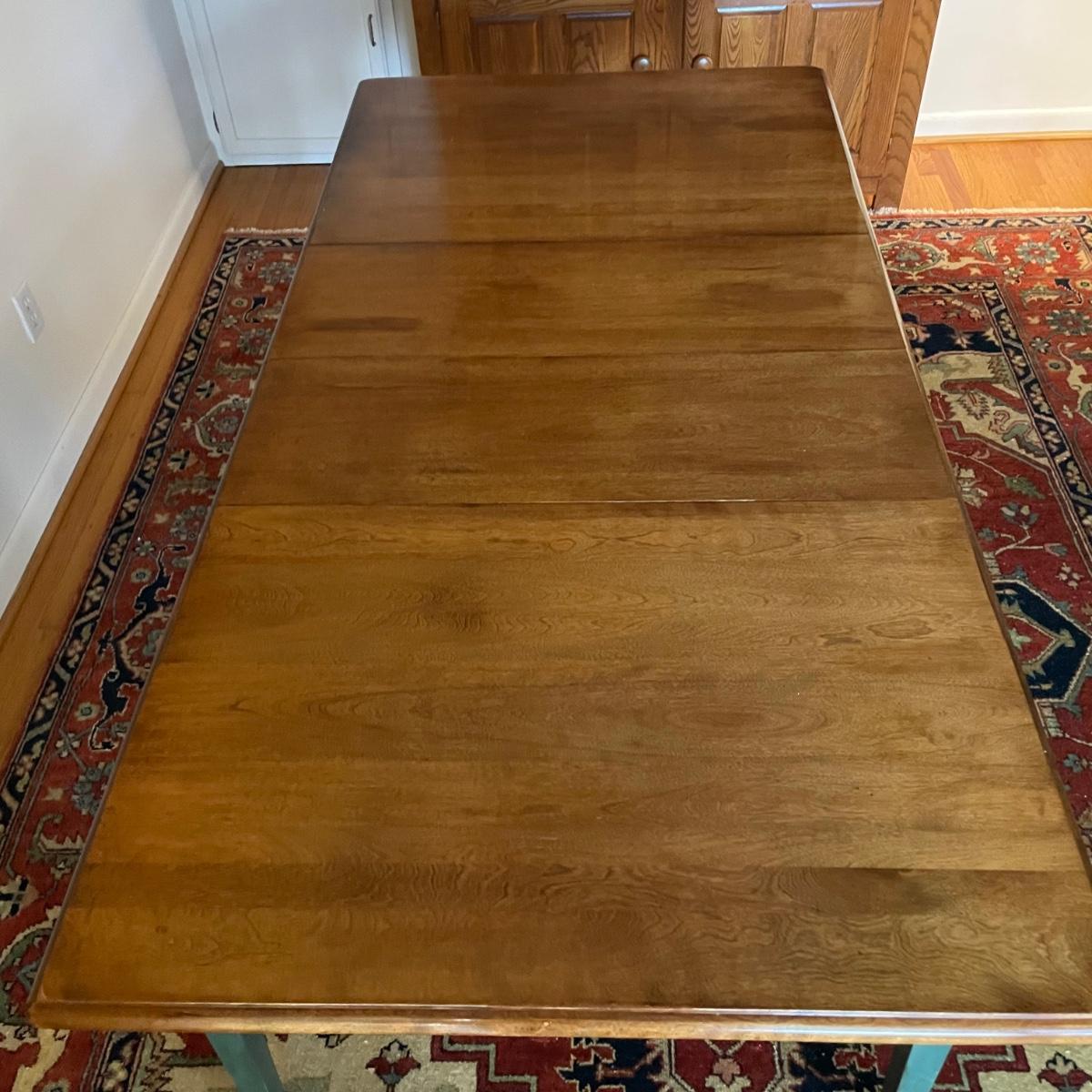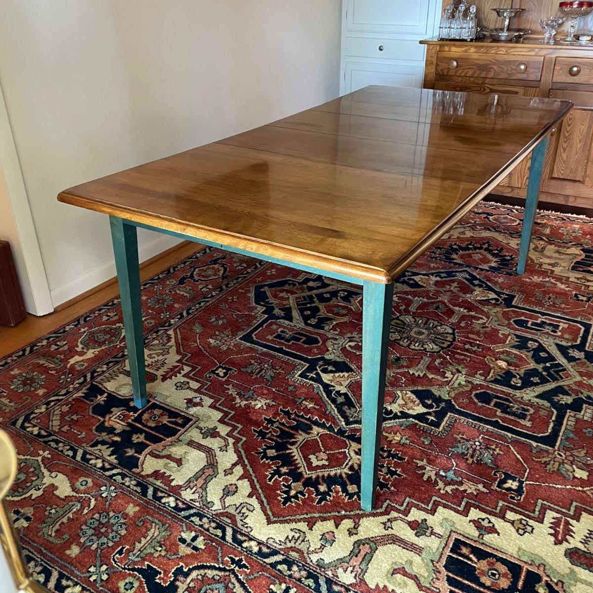 This solid wood dining table is very clean and in great condition. It has a natural wood (probably oak) with a gloss finish table top and green stained wood legs. No manufacturer name was found. We have some very similar, great matching chairs and a China hutch in other lots in this auction sale.