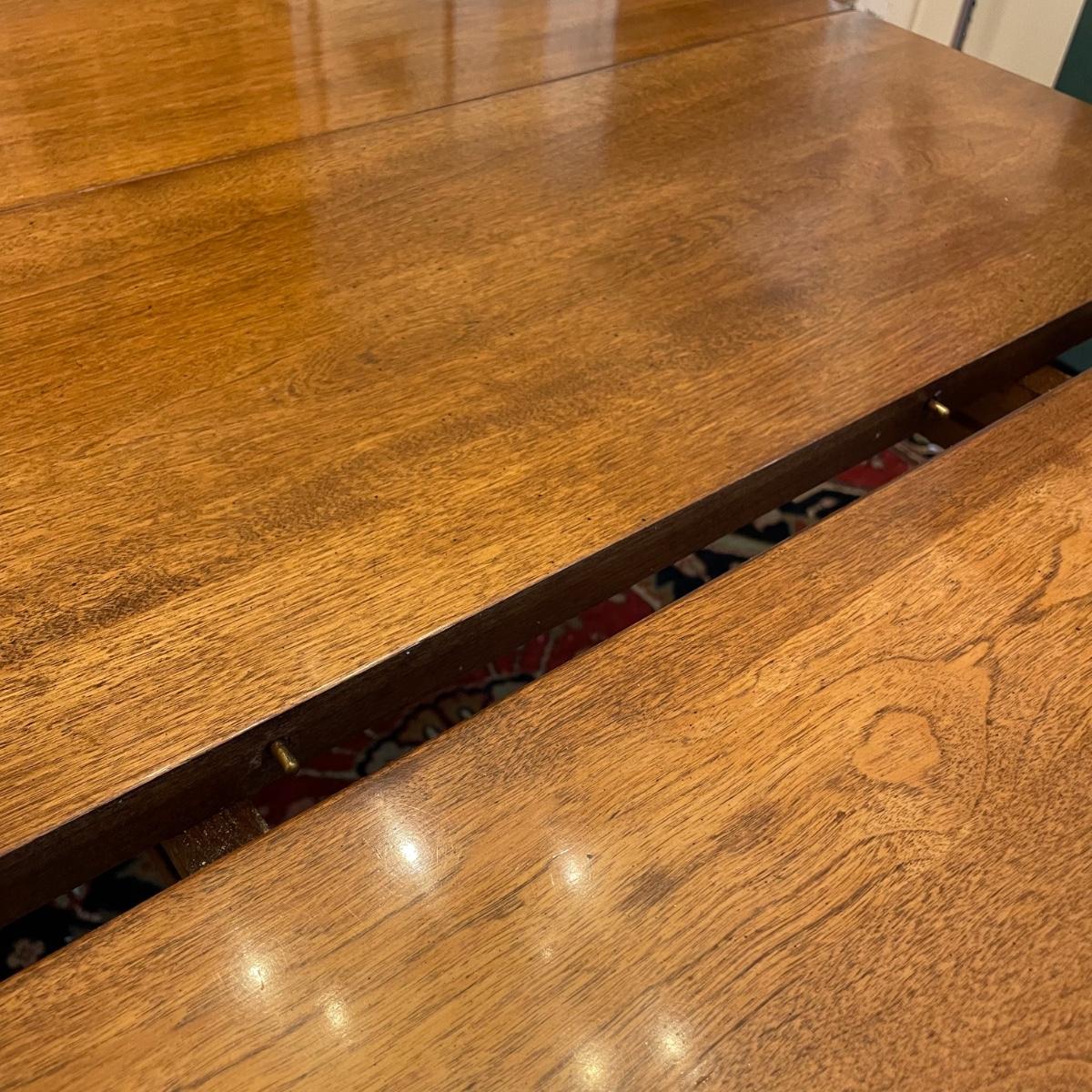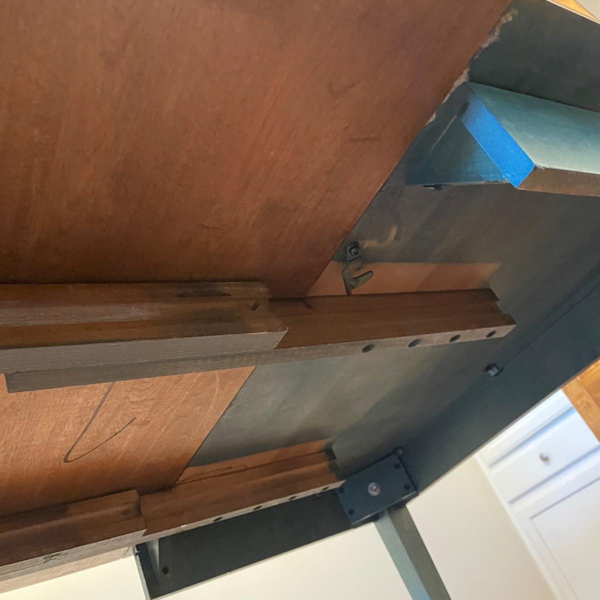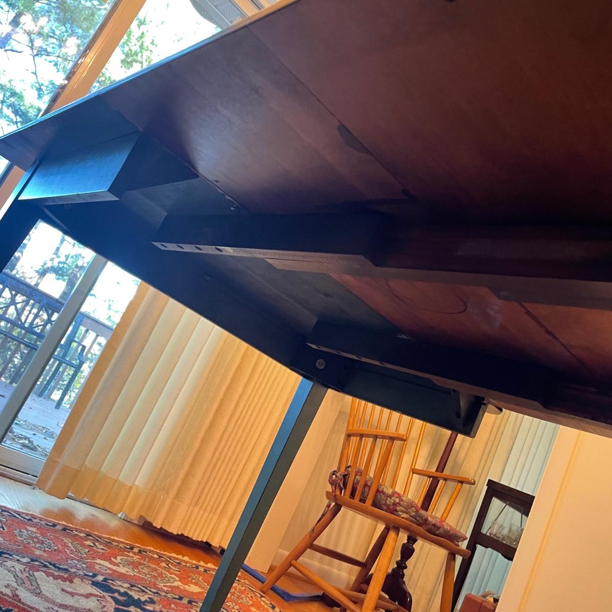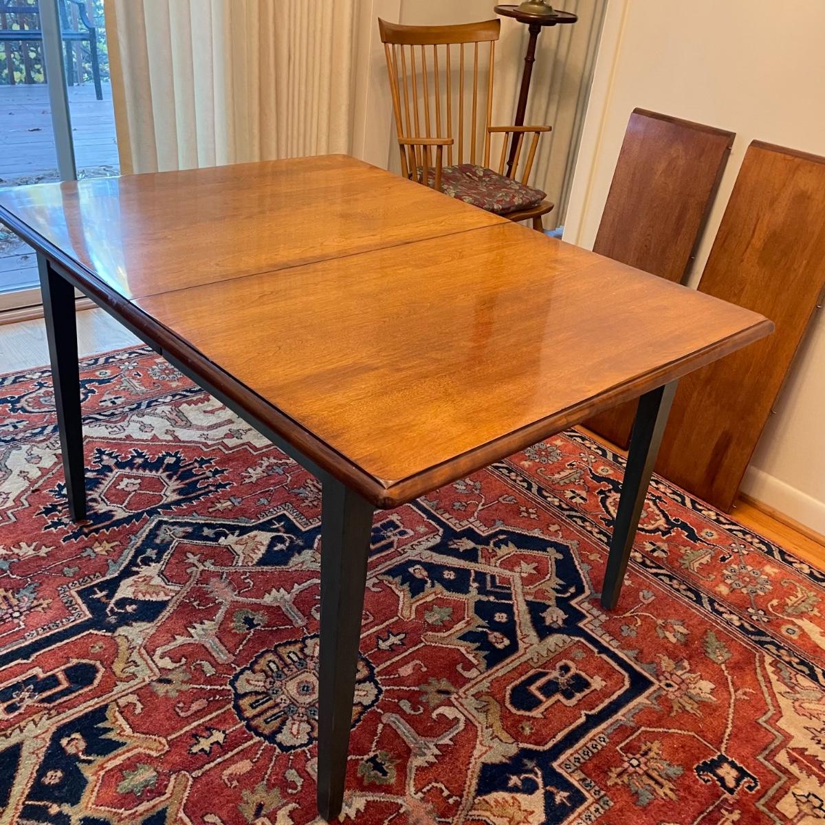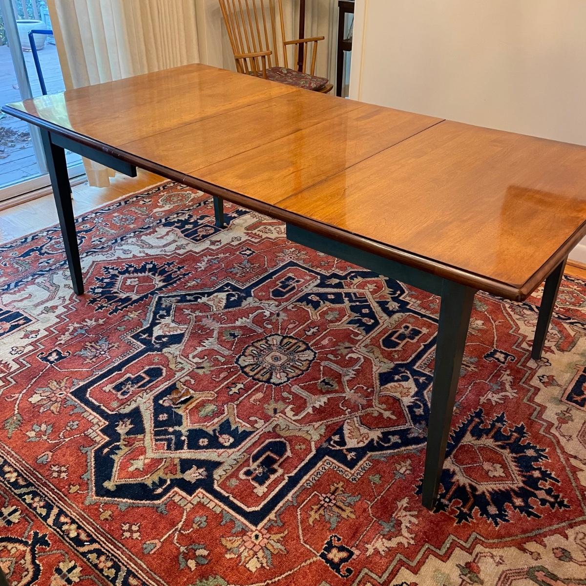 This solid wood dining table is very clean and in great condition. It has a natural wood (probably oak) with a gloss finish table top and green stained wood legs. No manufacturer name was found. We have some very similar, great matching chairs and a China hutch in other lots in this auction sale.