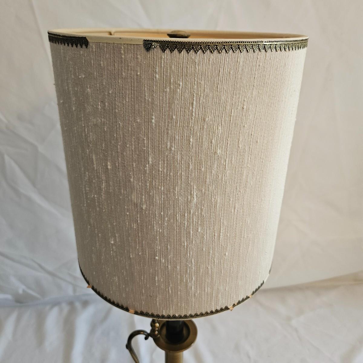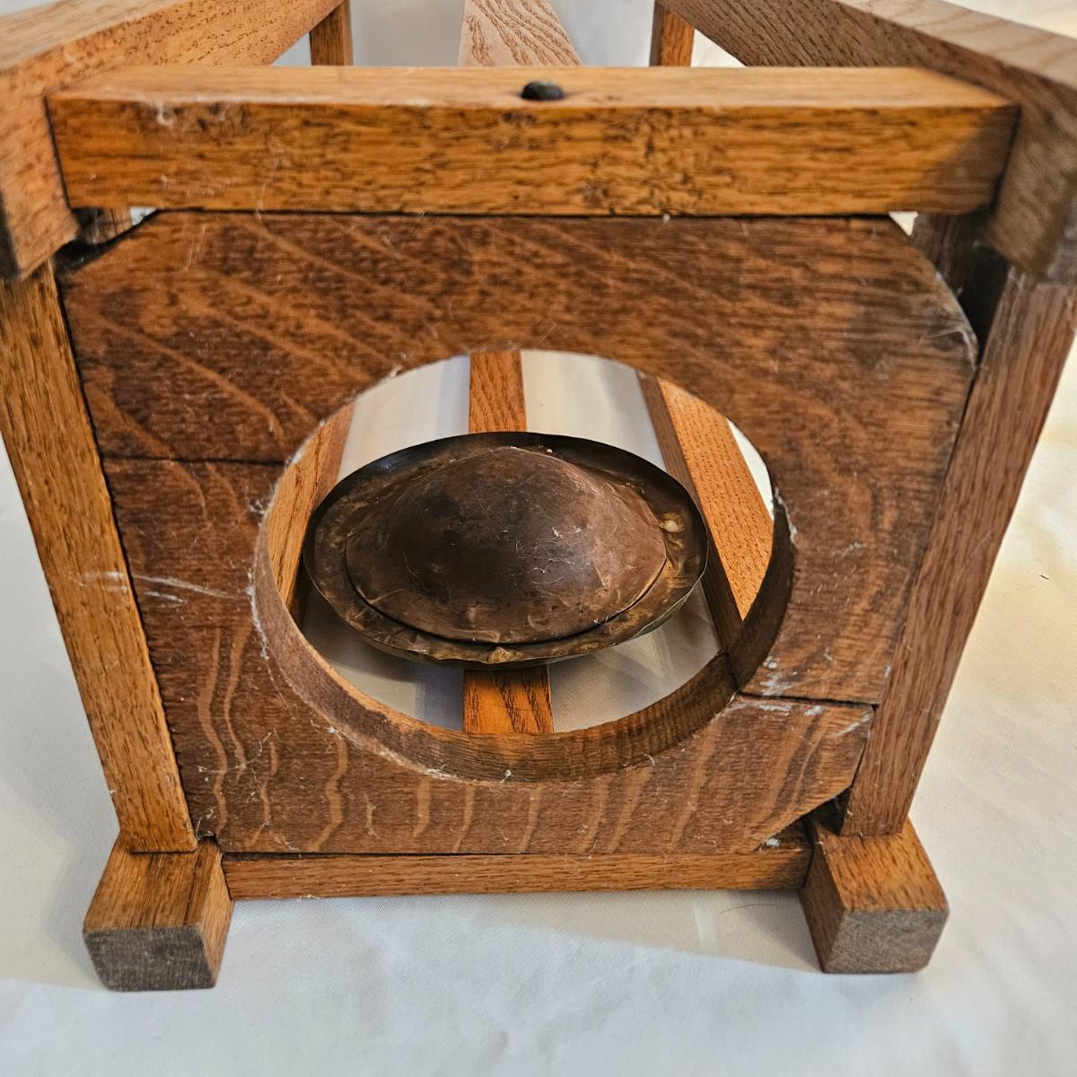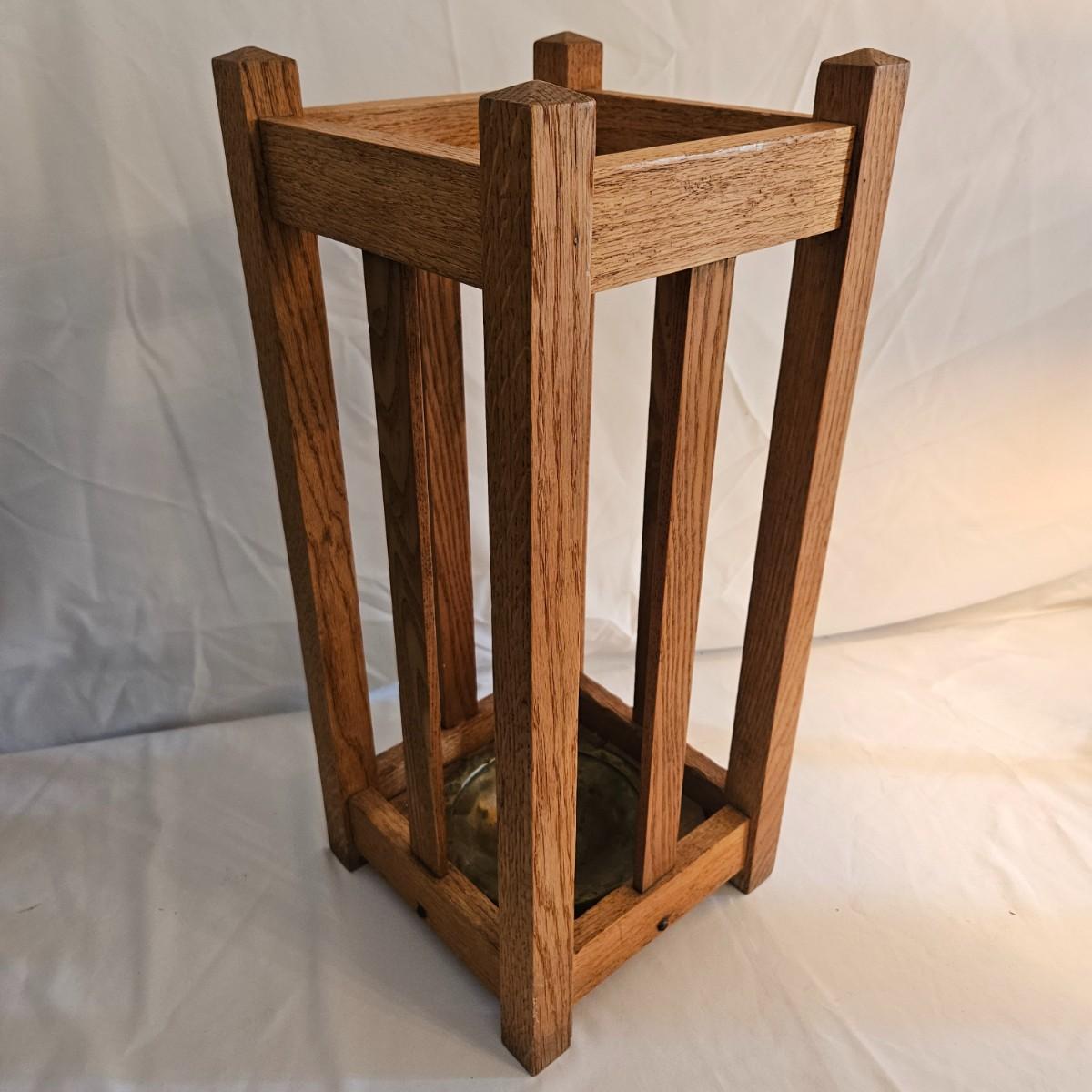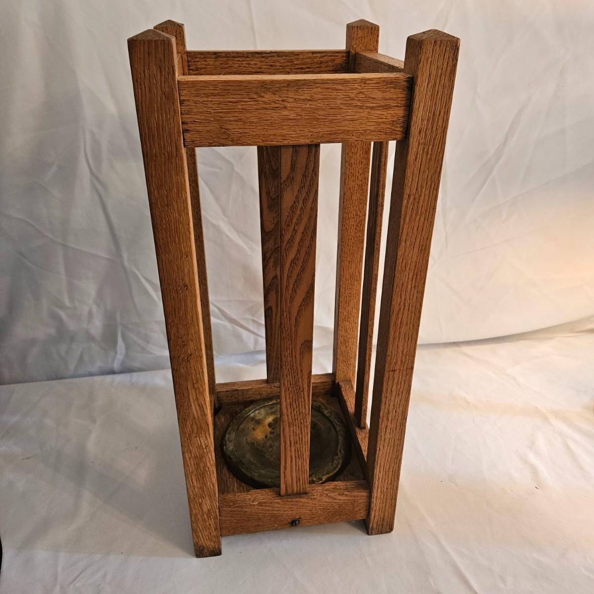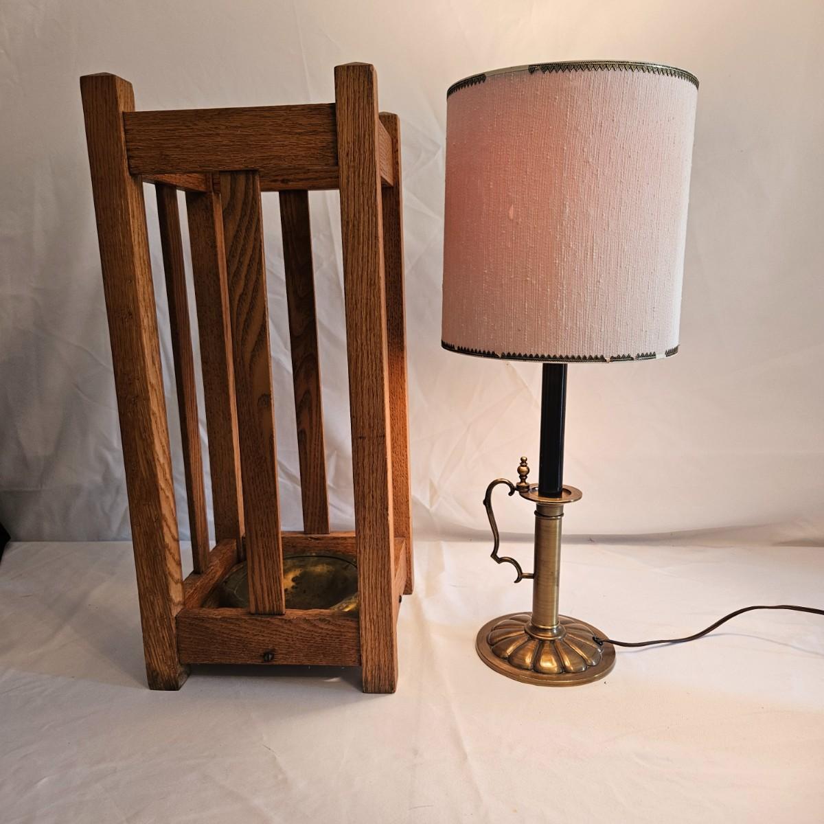 An oak umbrella stand that has a removable brass insert at the bottom and measures approximately 9.5" x 9.5" x 23.5"H. Also included is a brass and black metal table lamp that powered on when plugged in. It measures approximately 9" x 23"H including the shade and has a two way on/off switch. Some of the filigree on the shade is missing. Shipping available