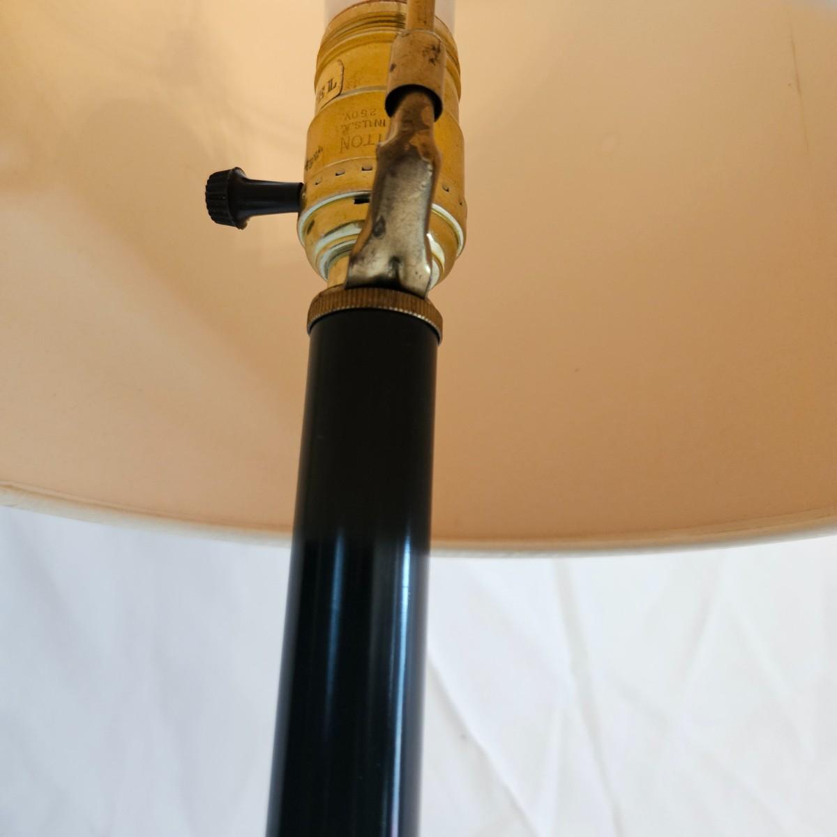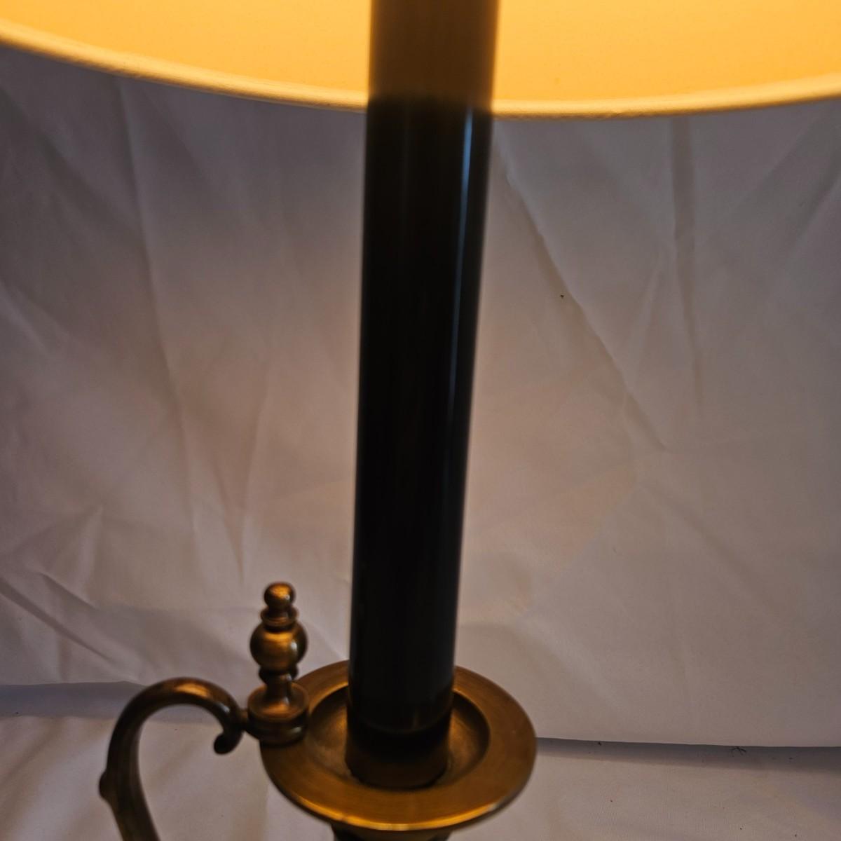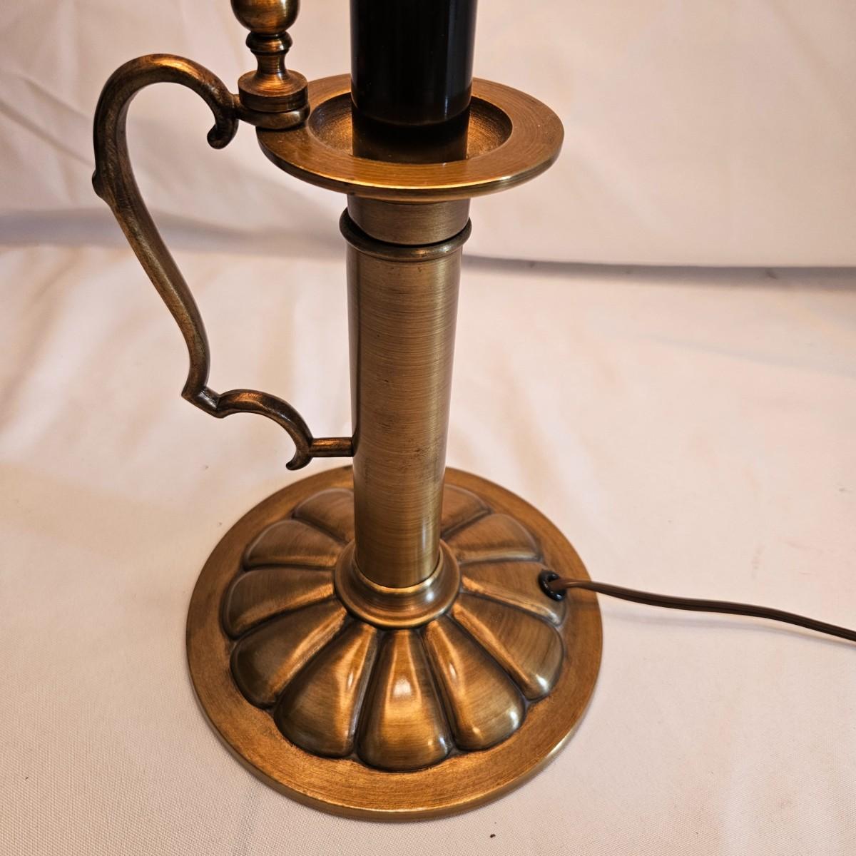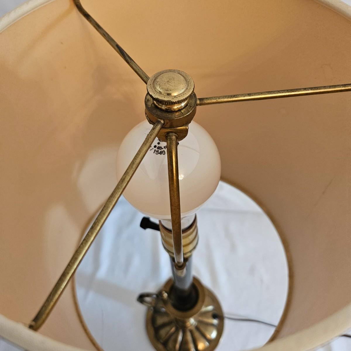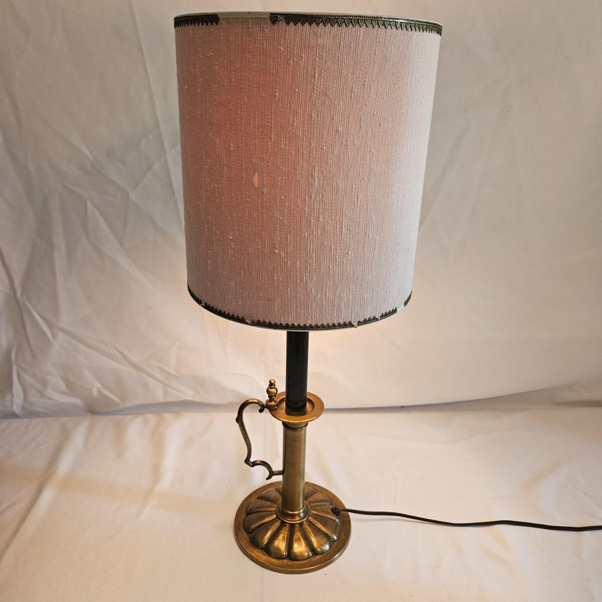 An oak umbrella stand that has a removable brass insert at the bottom and measures approximately 9.5" x 9.5" x 23.5"H. Also included is a brass and black metal table lamp that powered on when plugged in. It measures approximately 9" x 23"H including the shade and has a two way on/off switch. Some of the filigree on the shade is missing. Shipping available