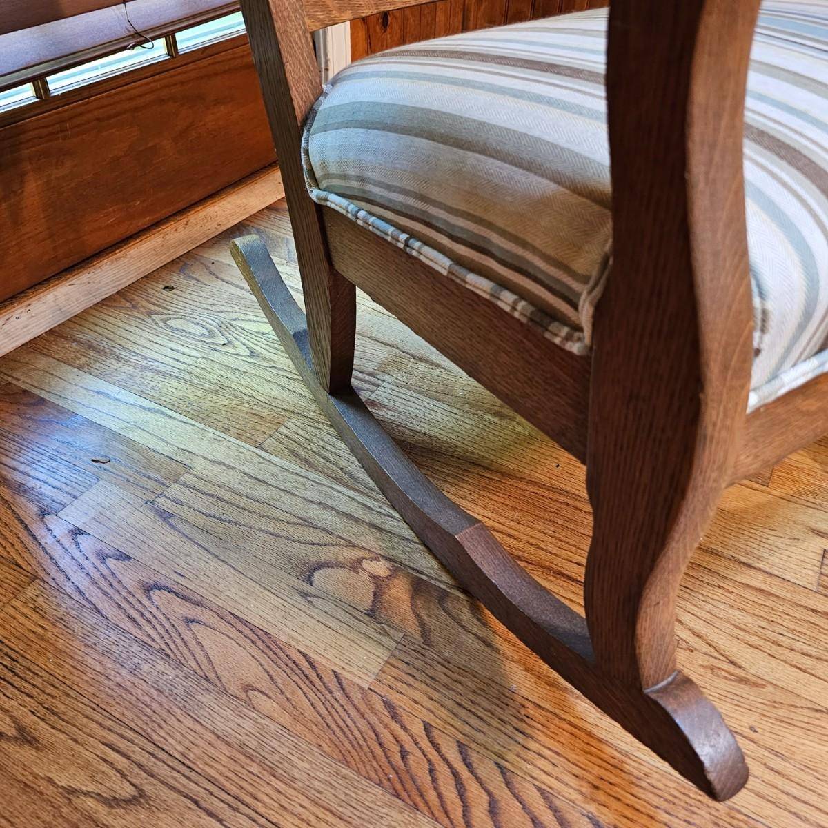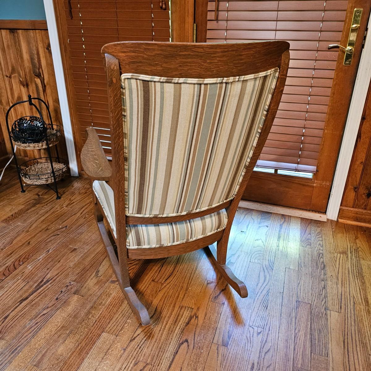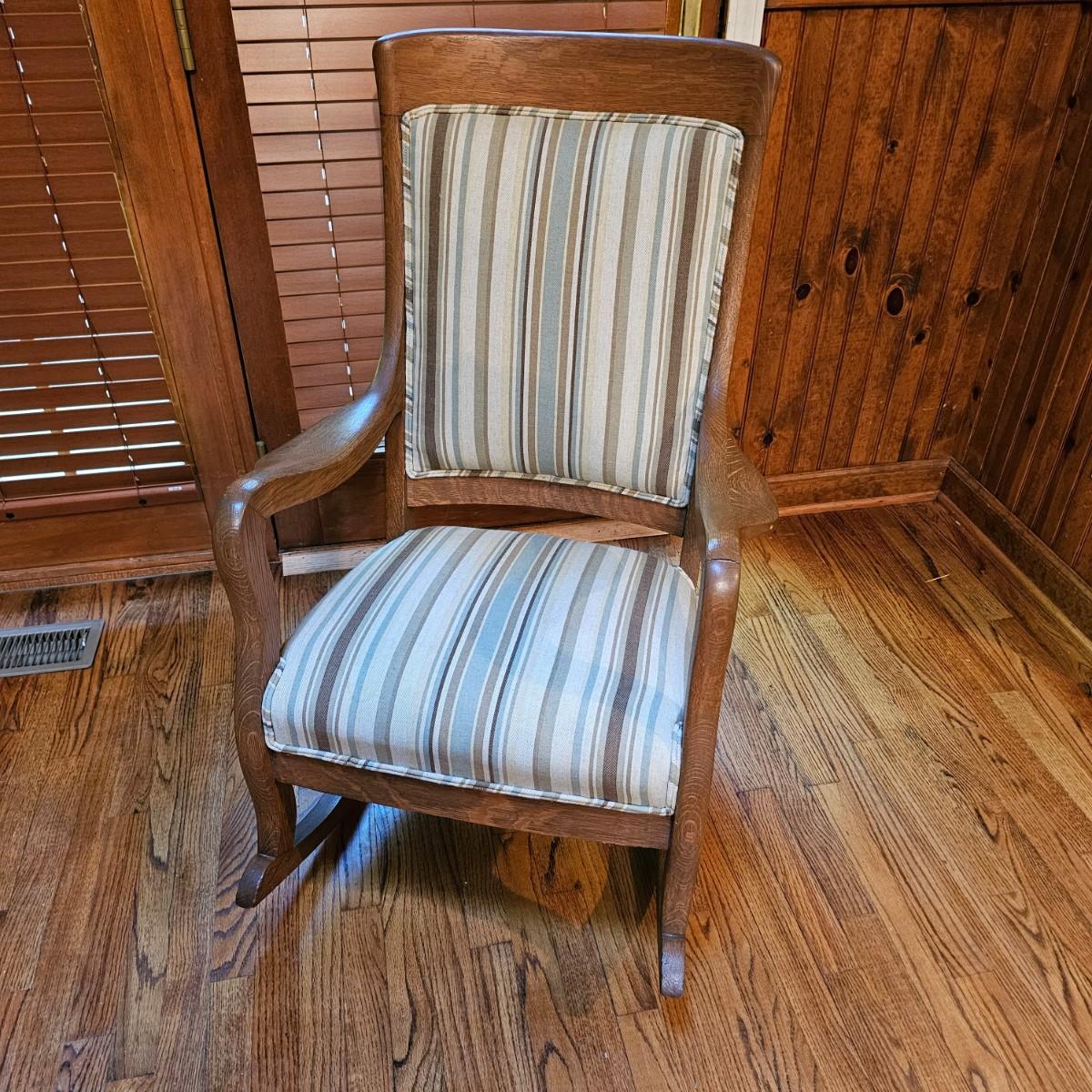 Solid wood rocker that appears to be oak wood. Rocker has upholstered seat and back. It measures 27" x 31" x 40"H, has seat height of 17". One small split in left arm at joint. Local pickup only.