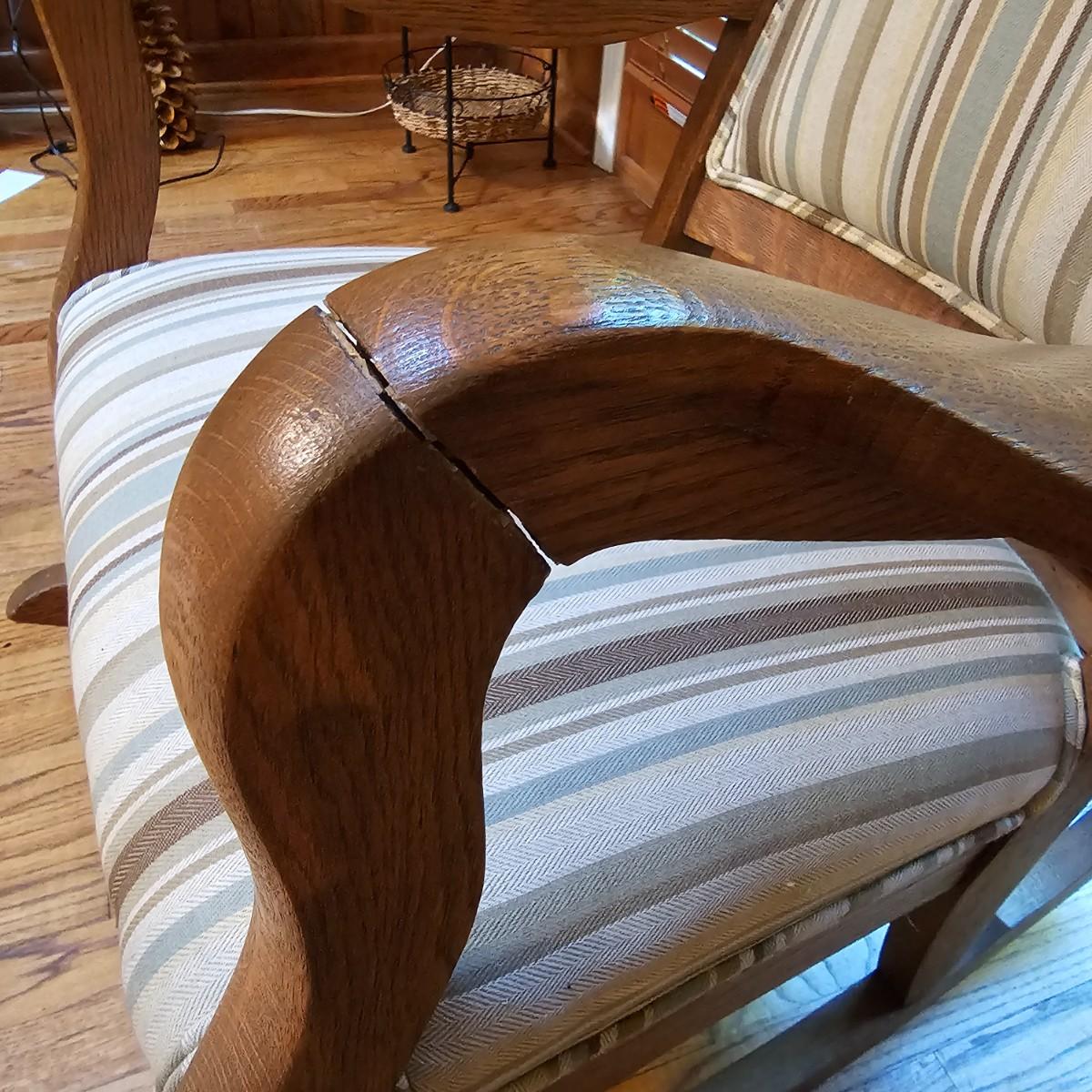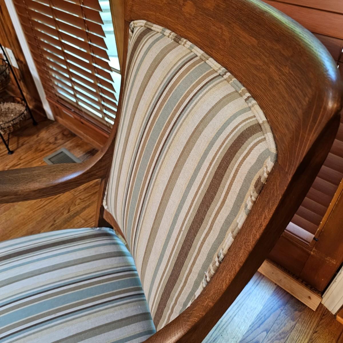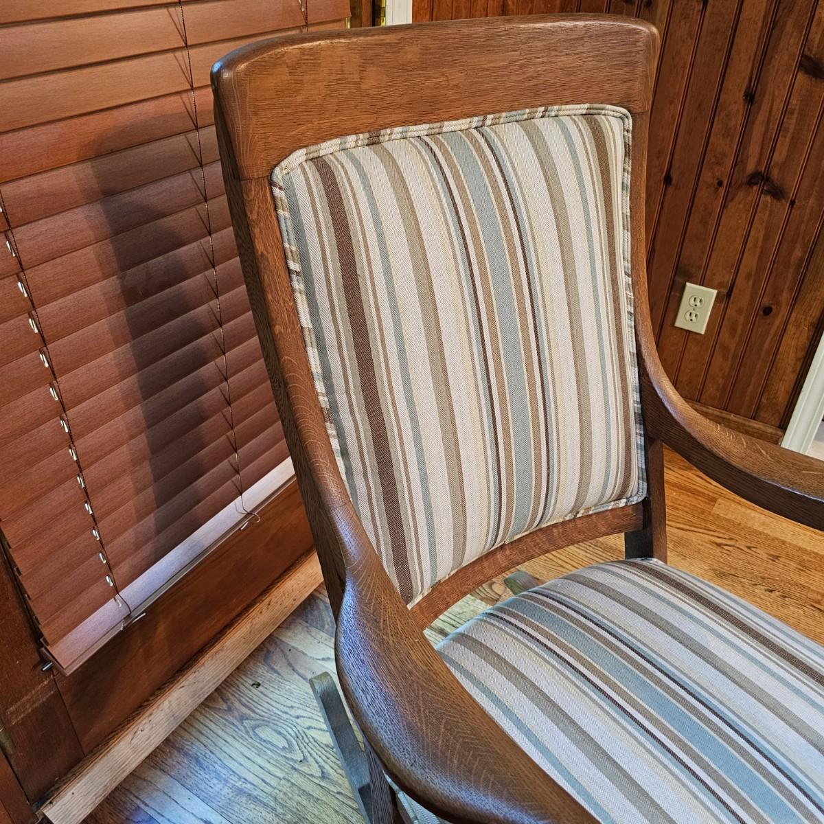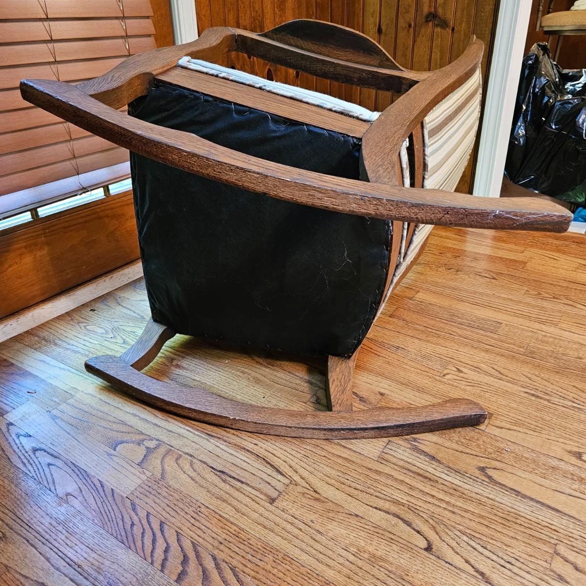 Solid wood rocker that appears to be oak wood. Rocker has upholstered seat and back. It measures 27" x 31" x 40"H, has seat height of 17". One small split in left arm at joint. Local pickup only.