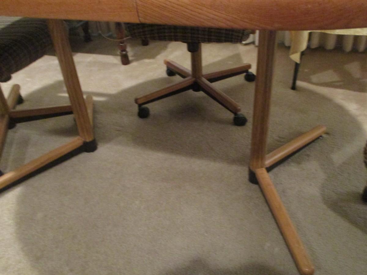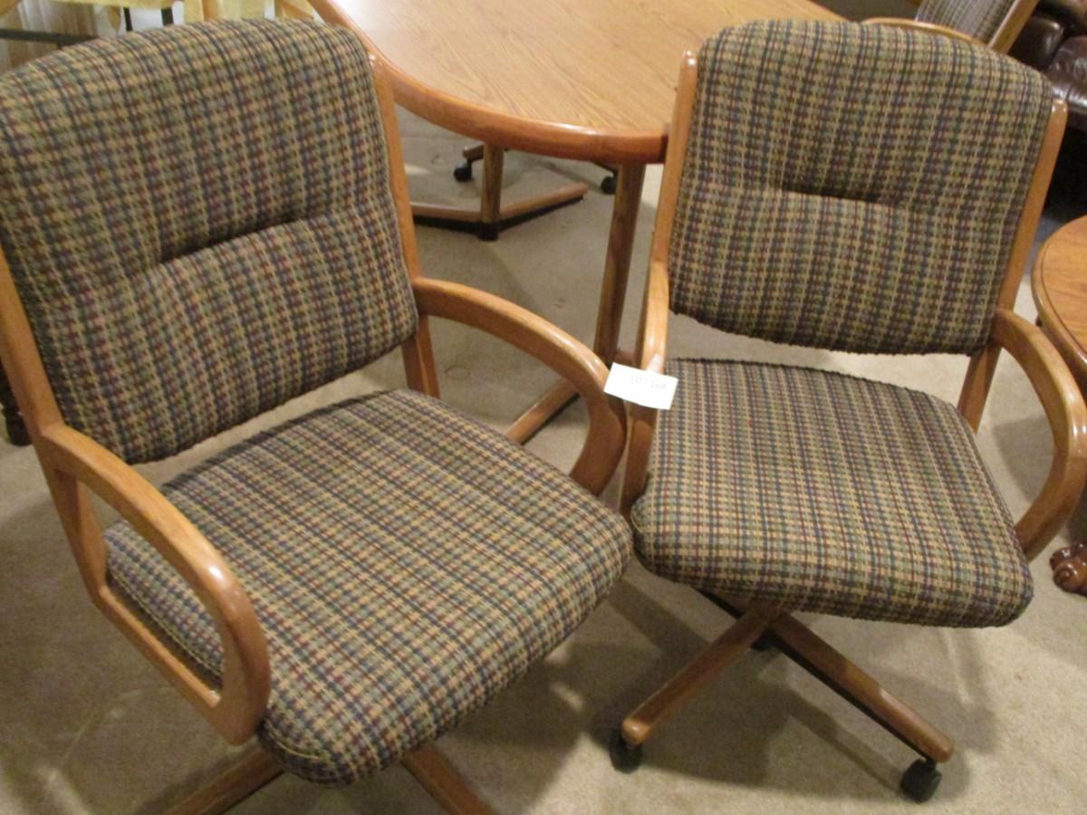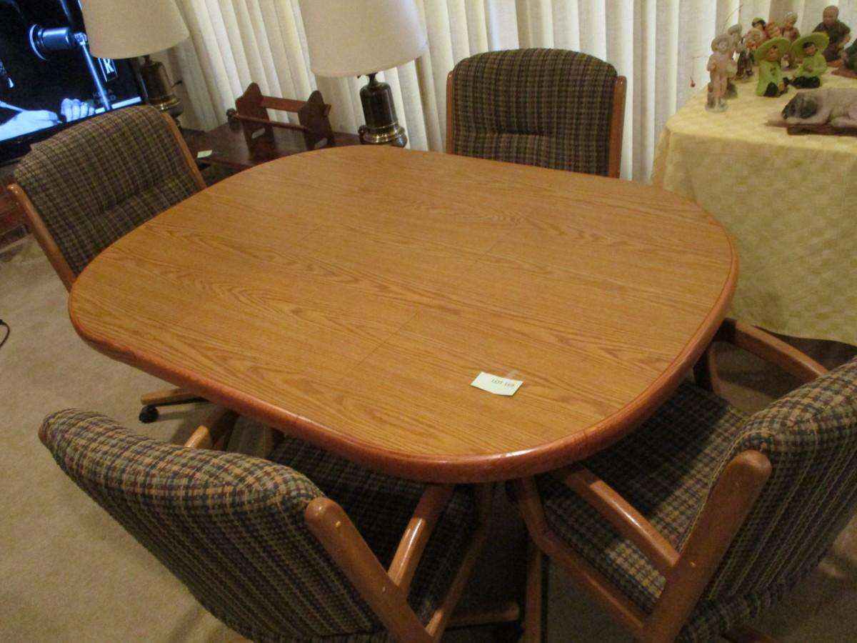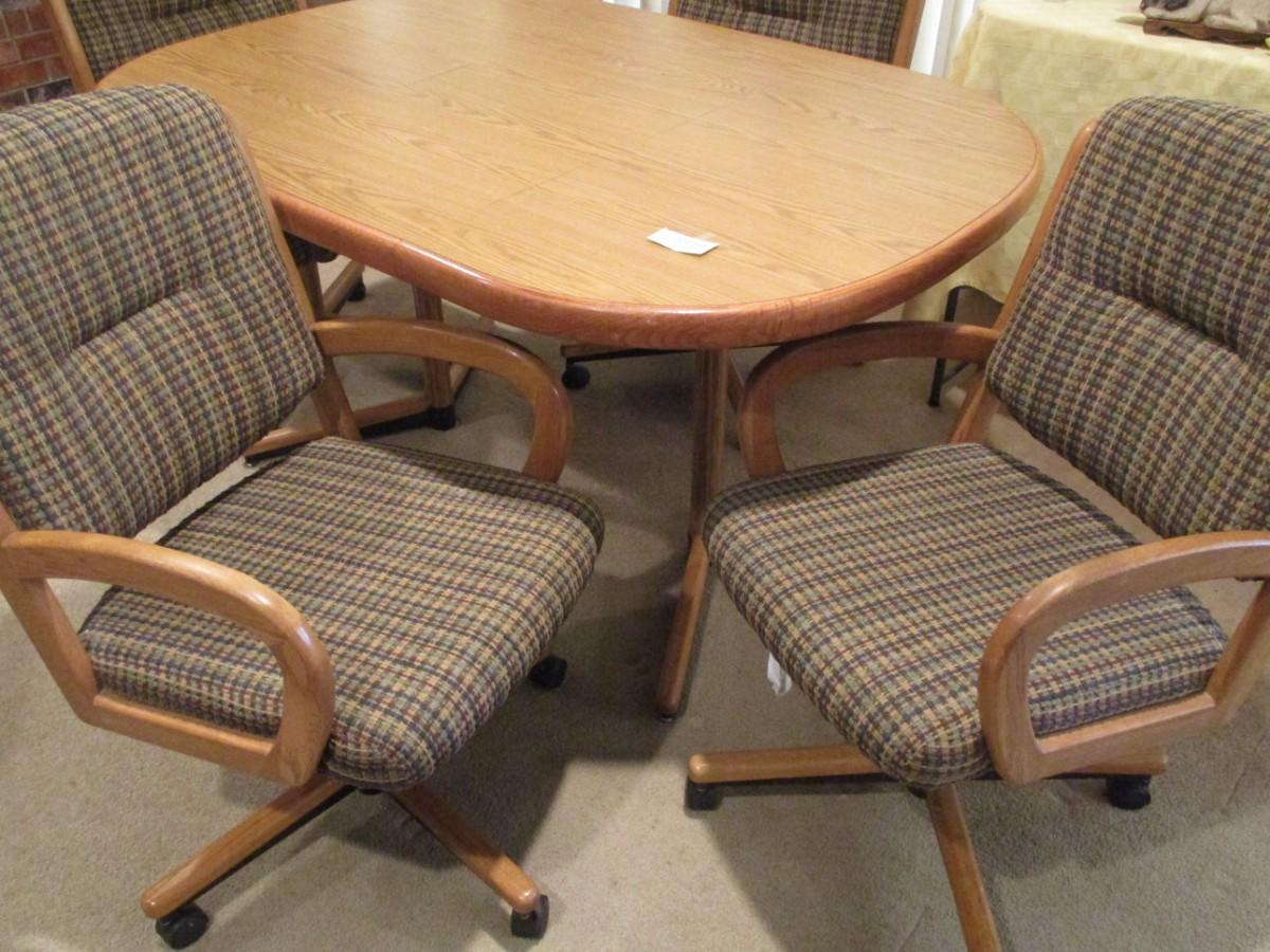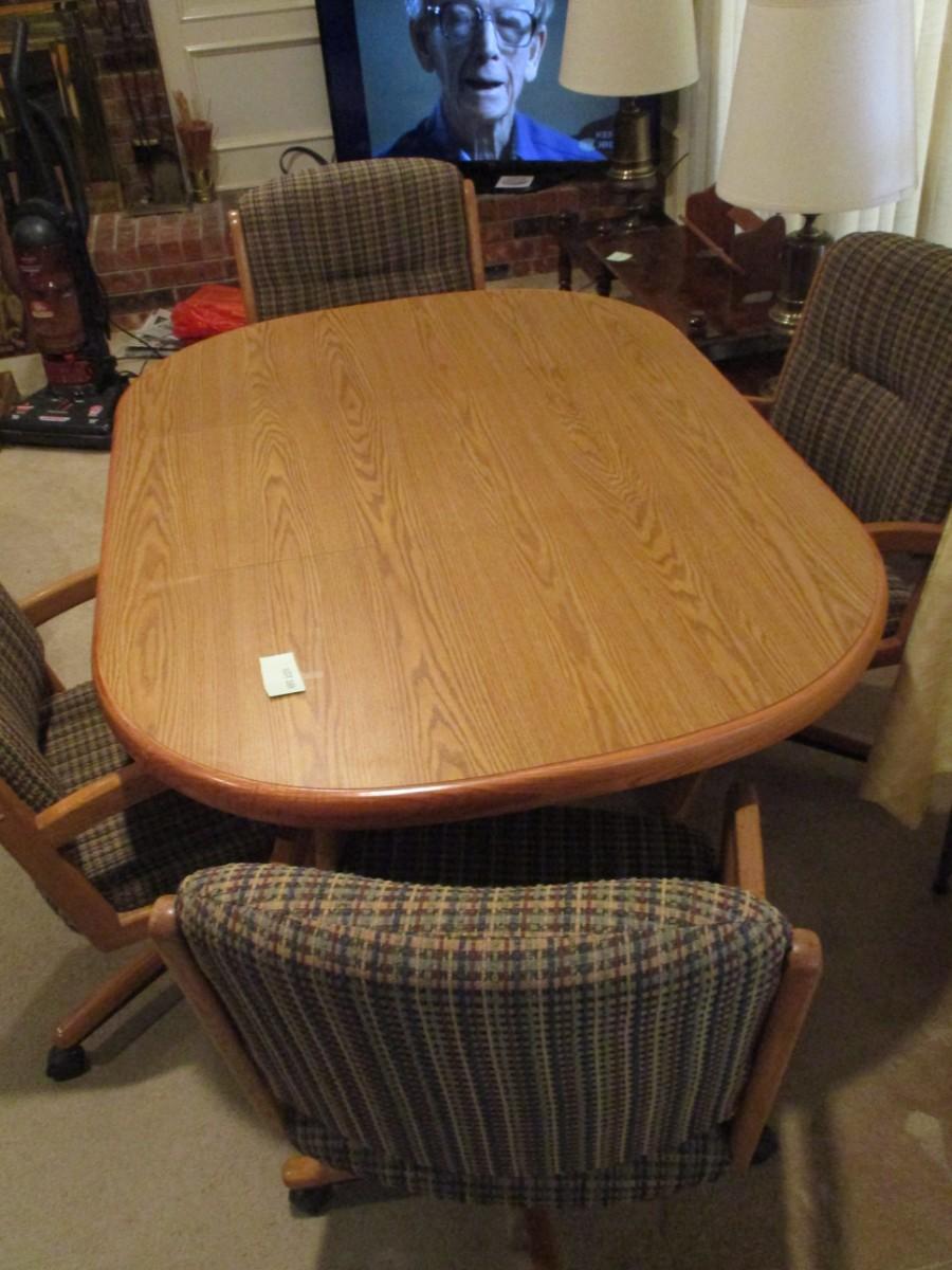 4 Game chairs on wheels. Normal wear. Dining table great condition. One table leaf