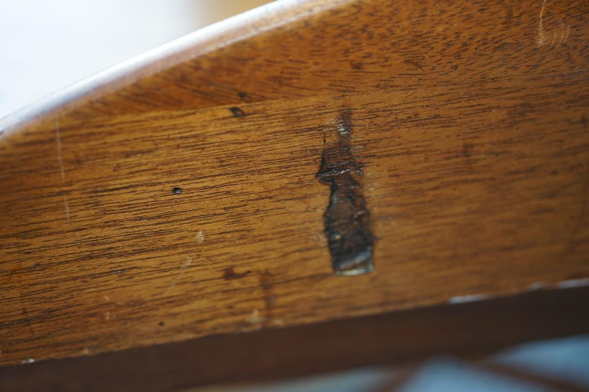 Condition: fair. it needs refinishing and an area that has chip out of the wood and is dark see photo.
