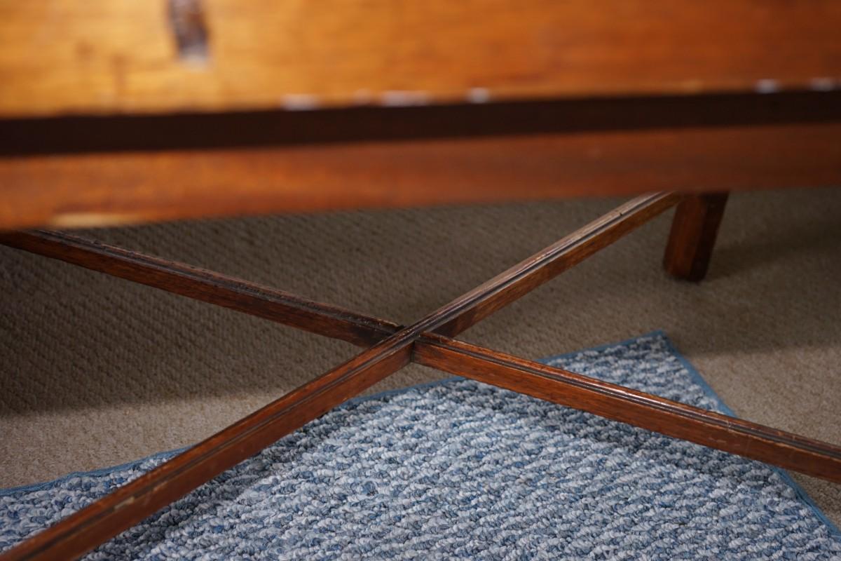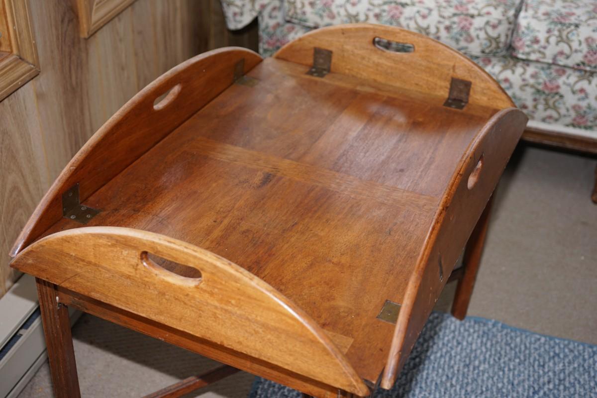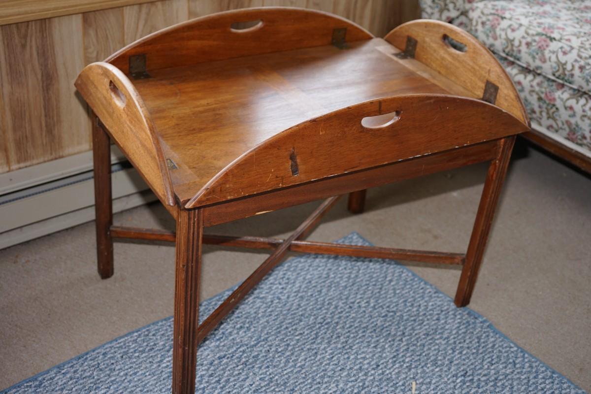 traditional style butlers style coffee table. all one piece. This piece needs alittle work, Maybe some stablization to the legs and light refinish . Then a true gem of a useful table.