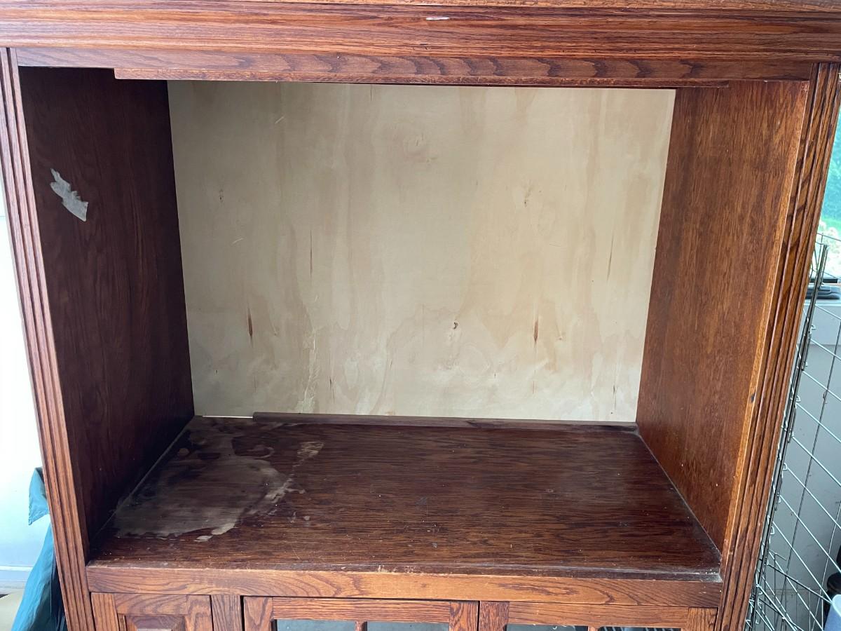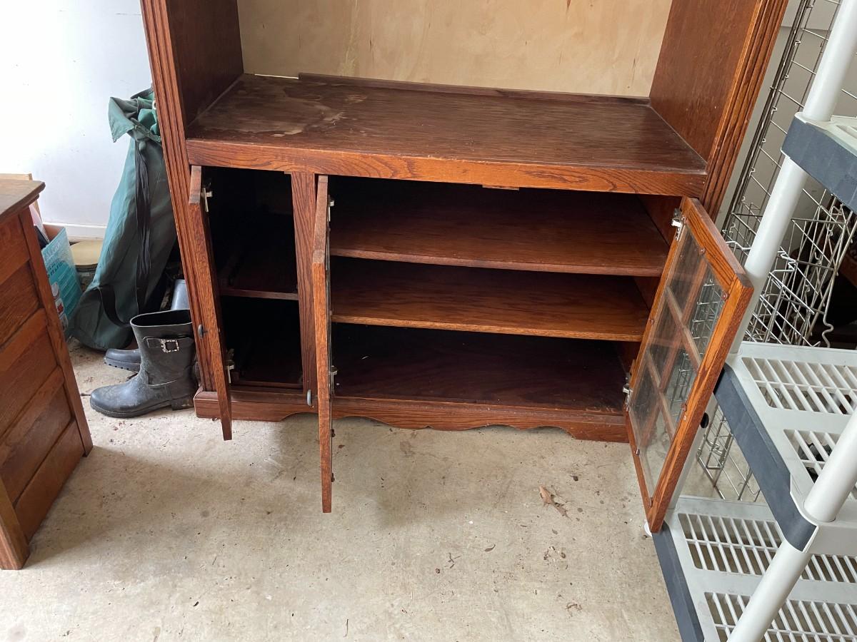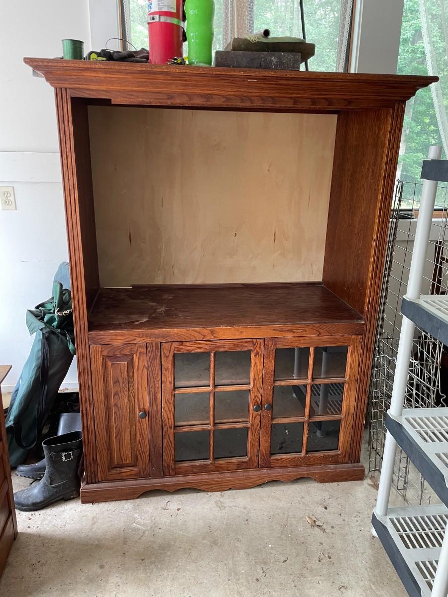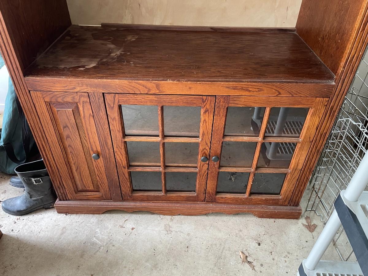 Oak wood media cabinet with shelves glass opening doors for storage. Please see photo for detail on condition. 53L x 27w x 66h