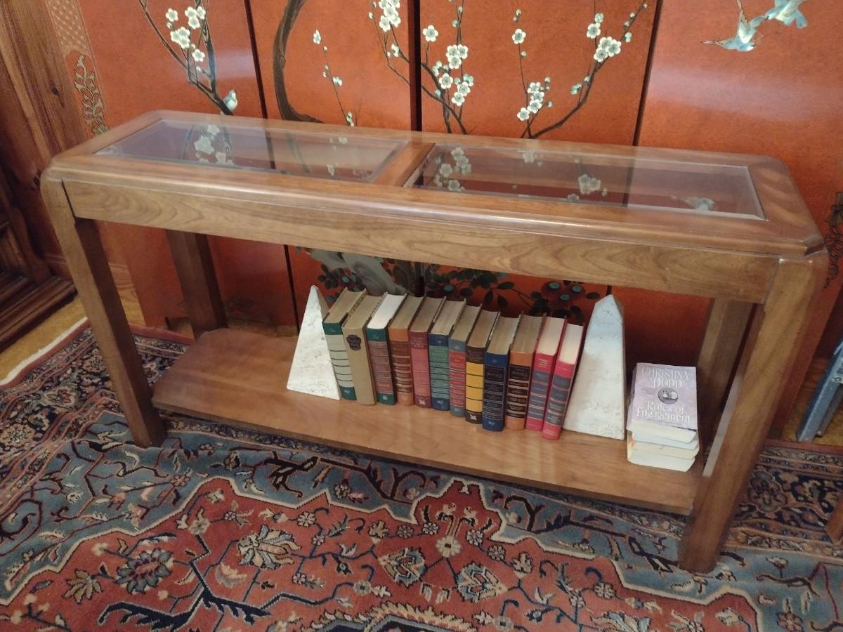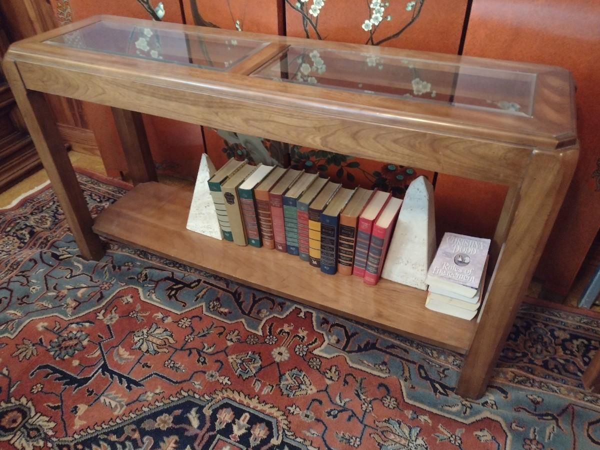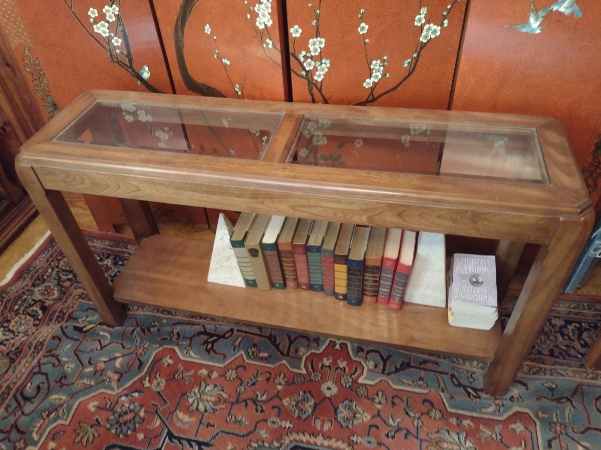 Oak Wood Sofa Table with Glass Insert Top (No Contents)
