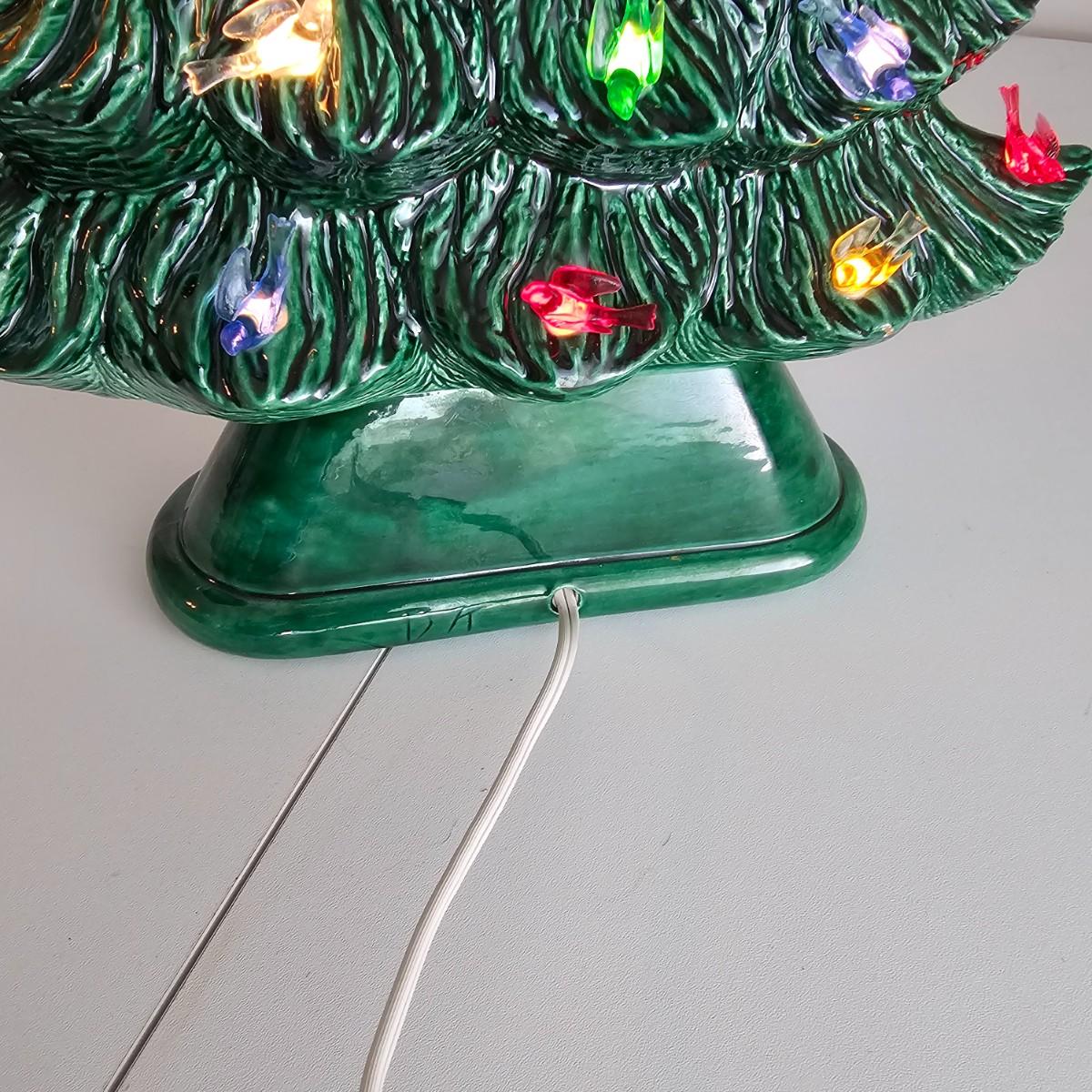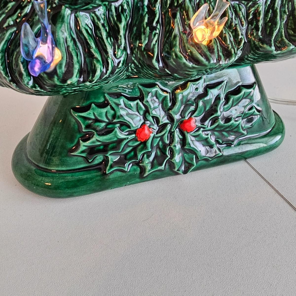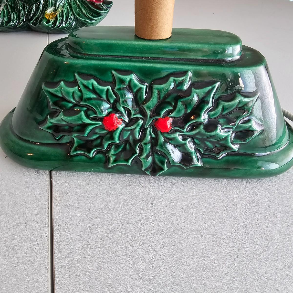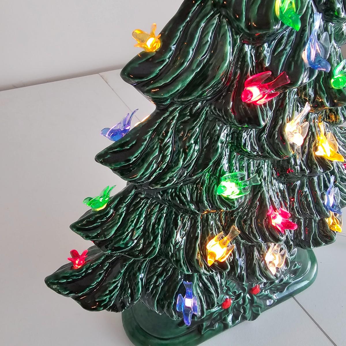 Unique slender oblong green ceramic tree, known as a mantel tree due to its slim design. Old world style sculpted branches, holly emblem on base. Includes all jewels and star topper: jewels are colored birds. Inline on/off switch, tree powered on when plugged in. Tree measures 4" x 11" x 18.5"H. Storage tub included. See photos for details. Shipping available.